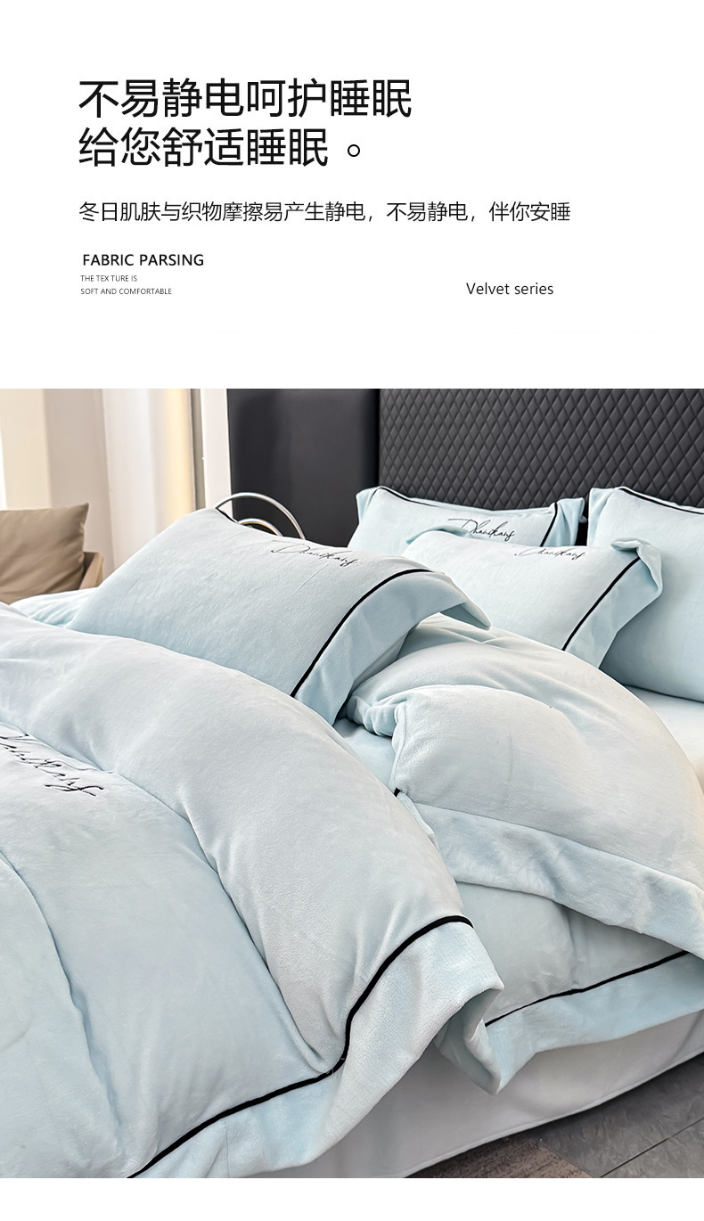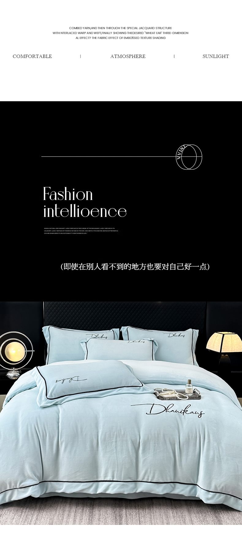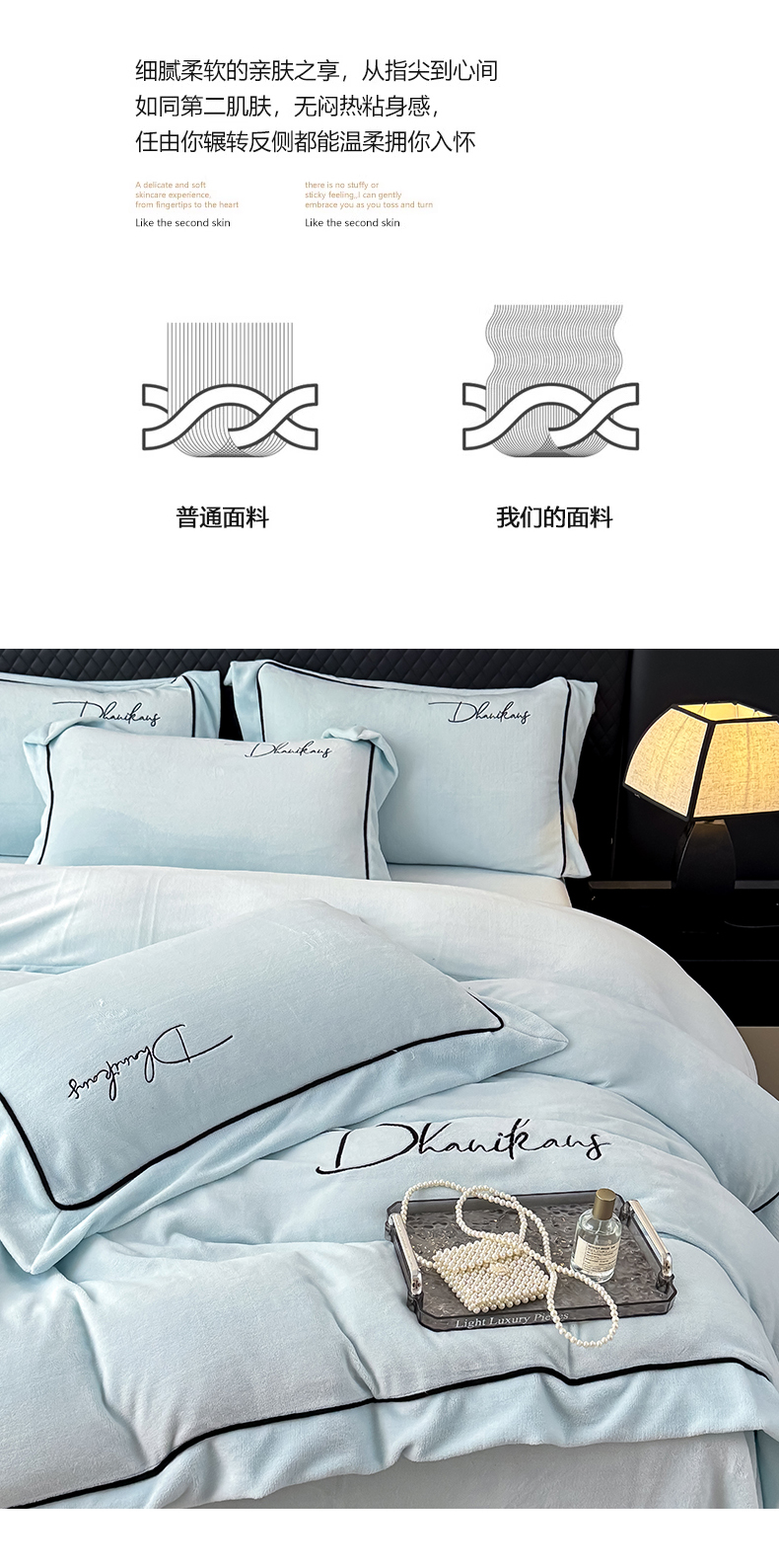 商品名称:KA家纺 2025新款冬轻奢刺绣款嵌绳大拼角牛奶绒四件套 轻奢牛奶绒-蓝