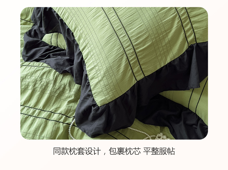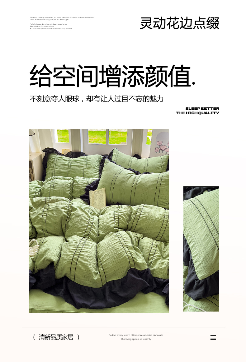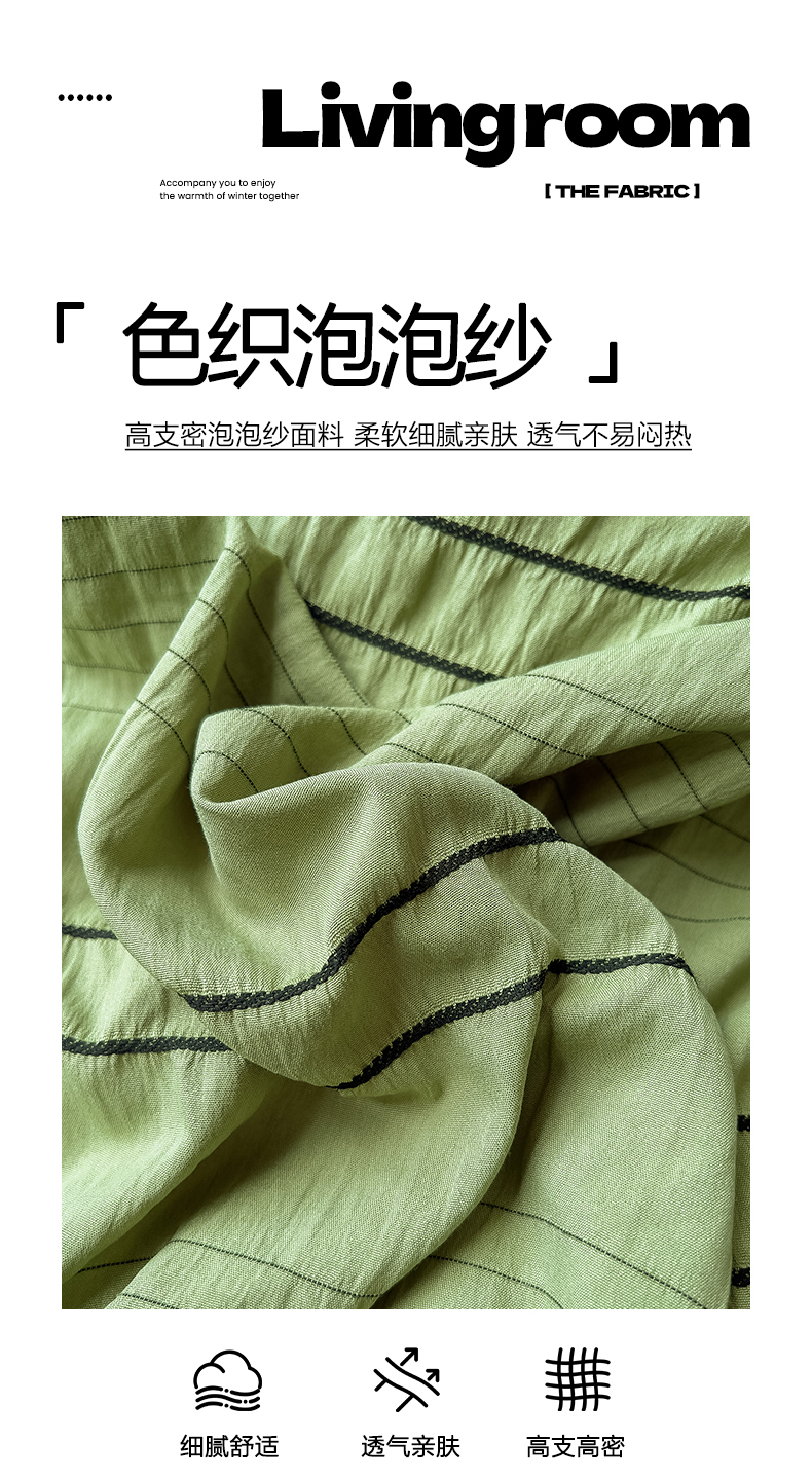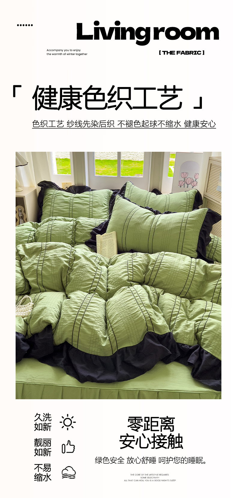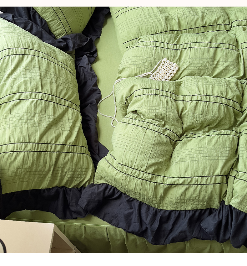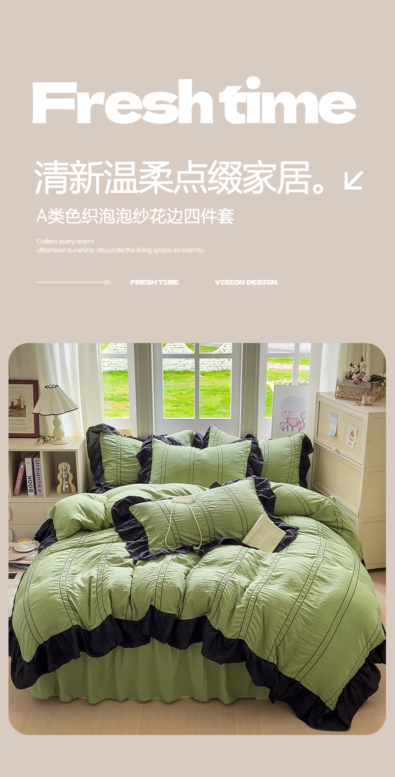 当前位置: 91家纺网 > 商品网购 > 床品套件 > 四件套 > 化纤普通四件套 > 优卡迪家纺馆 2025新款色织泡泡纱花边四件套 豆蔻绿