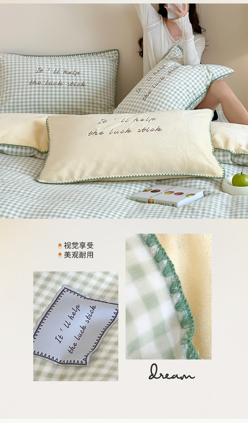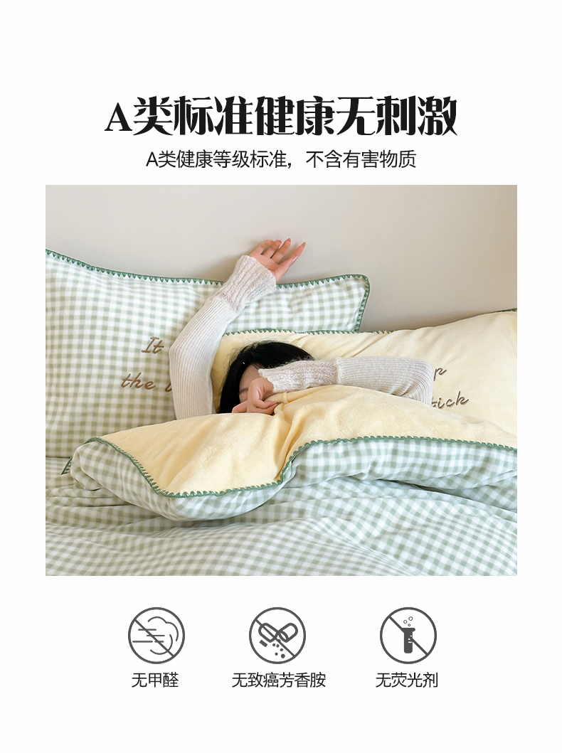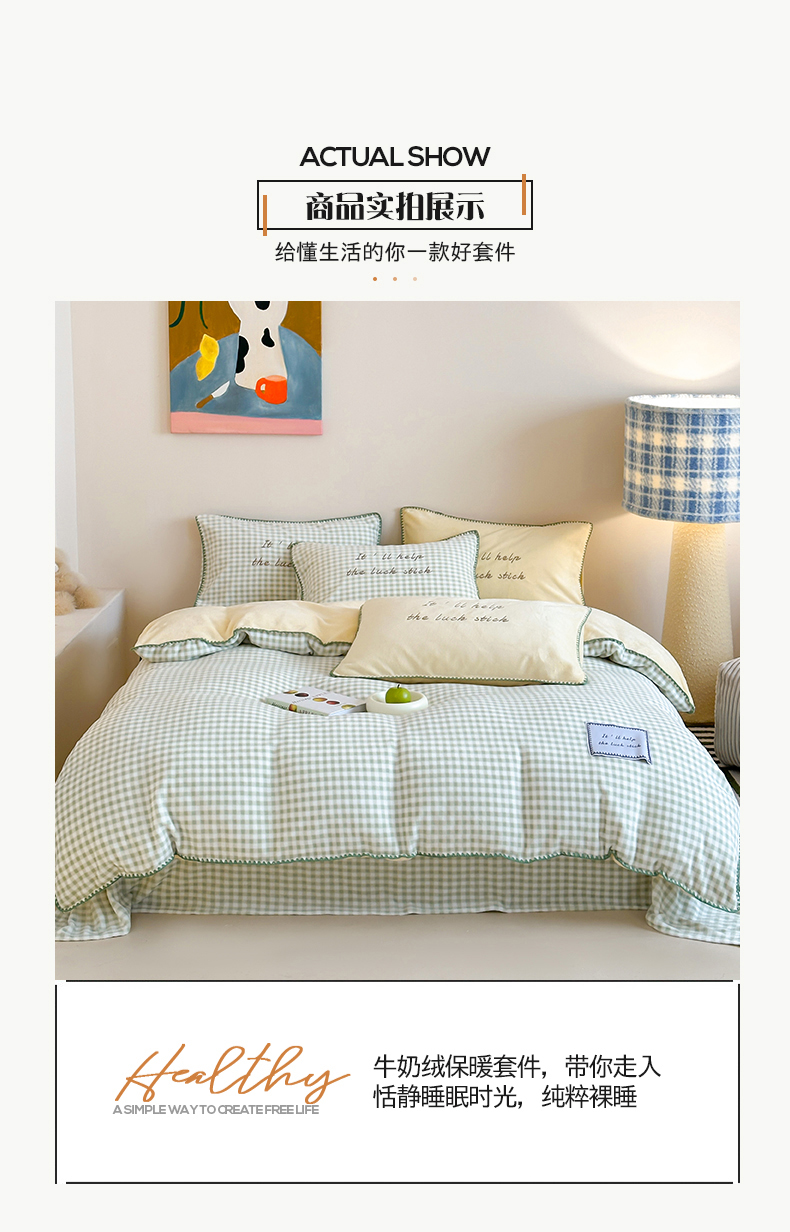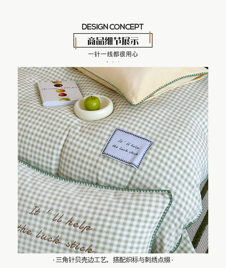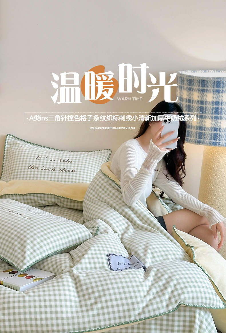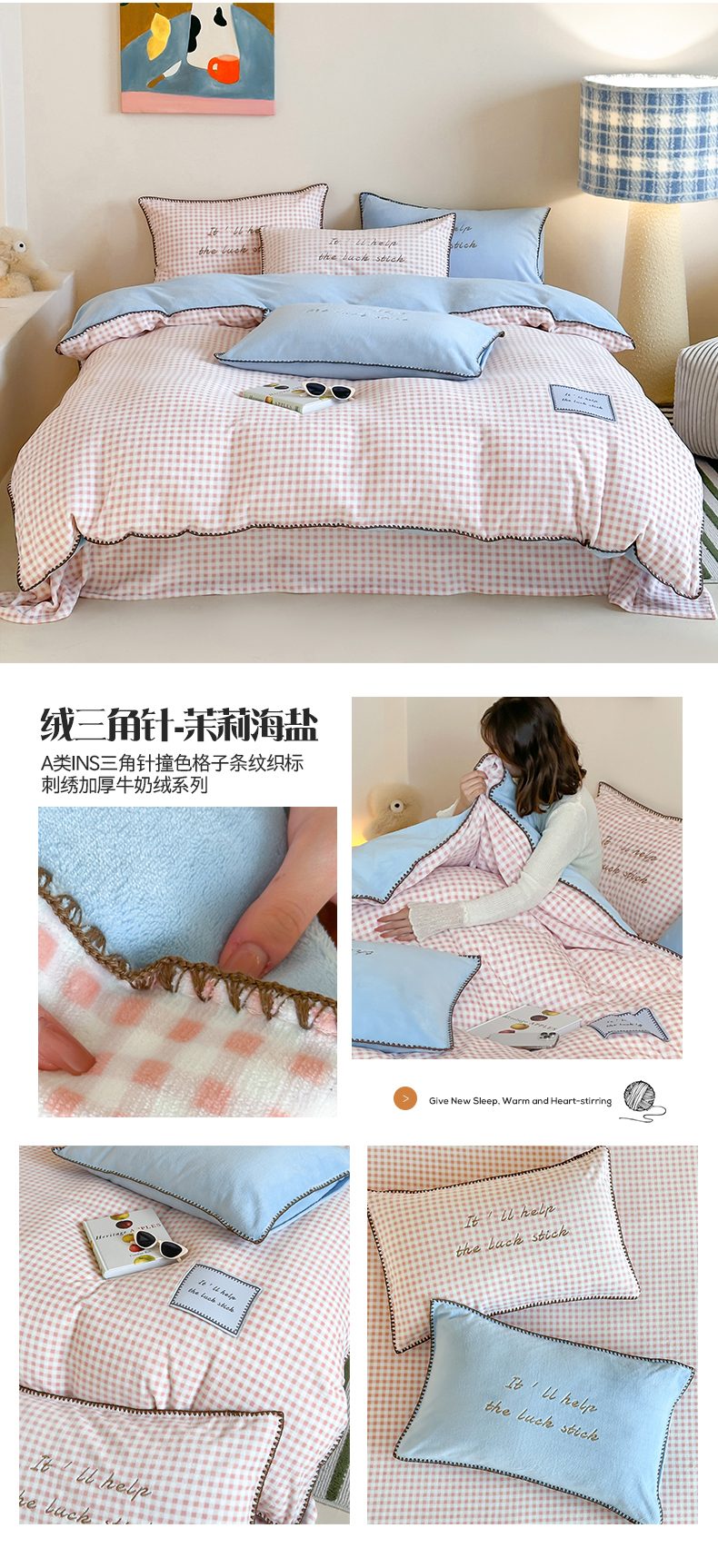 商品名称:桃子家居 2025新款A类ins三角针撞色格子条纹织标高级刺绣小清新加厚牛奶绒系列四件套 绒三角针-茉香柠檬