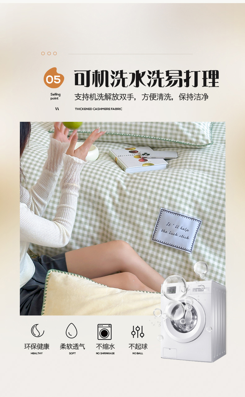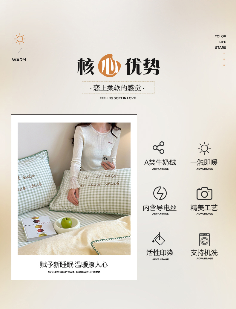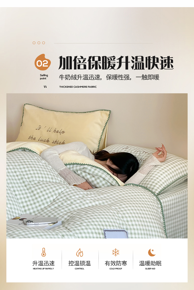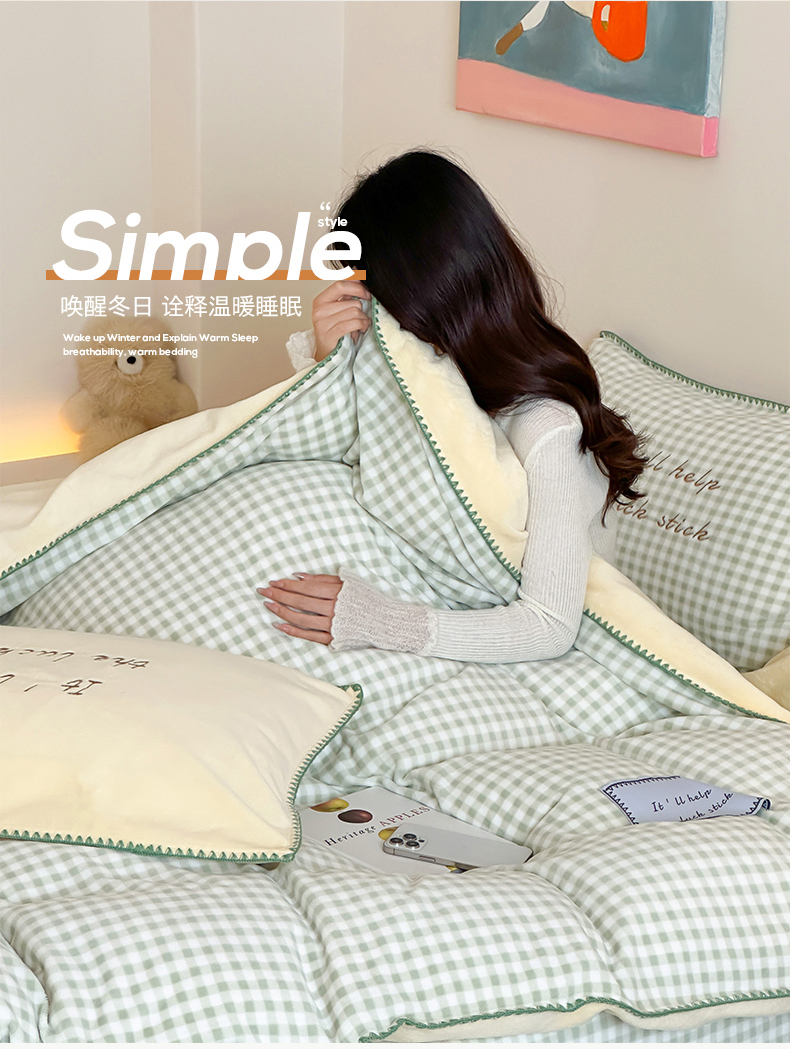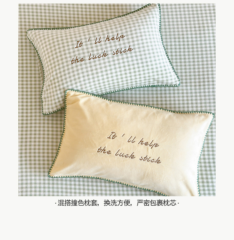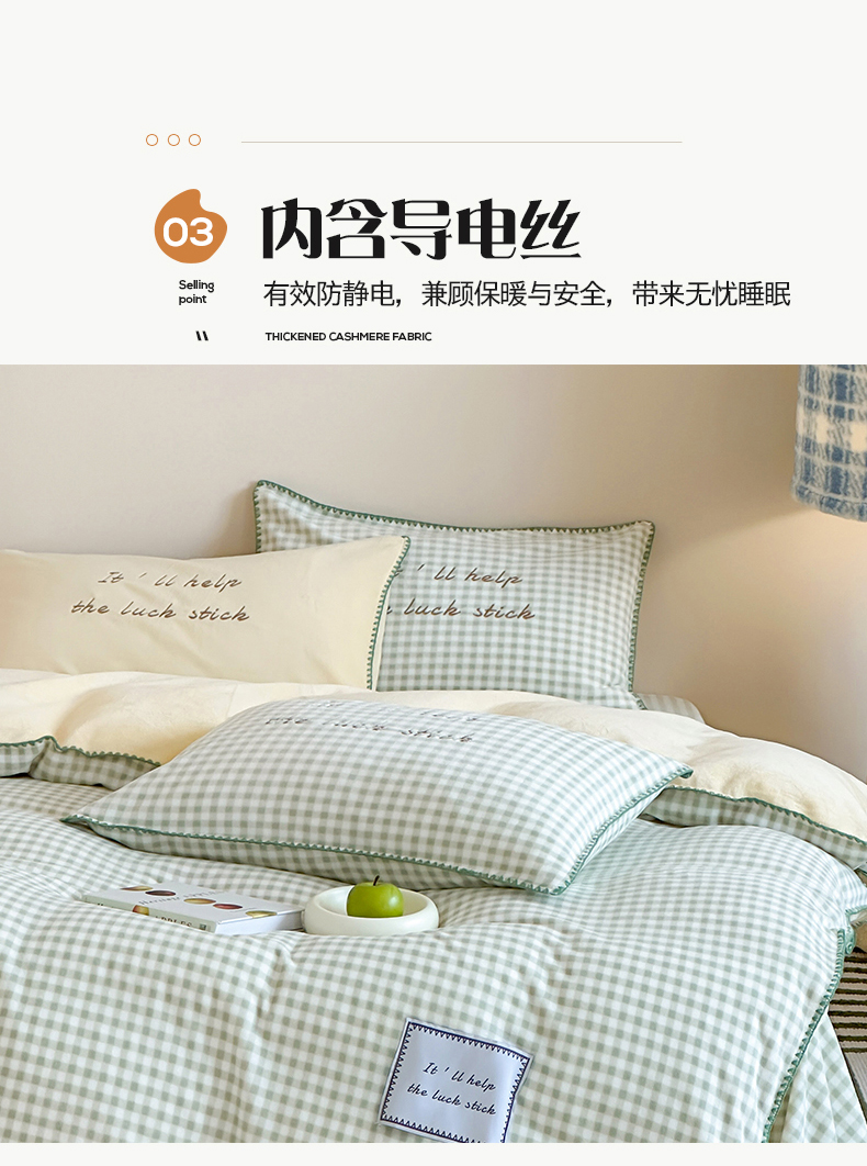 商品名称:桃子家居 2025新款A类ins三角针撞色格子条纹织标高级刺绣小清新加厚牛奶绒系列四件套 绒三角针-茉香柠檬