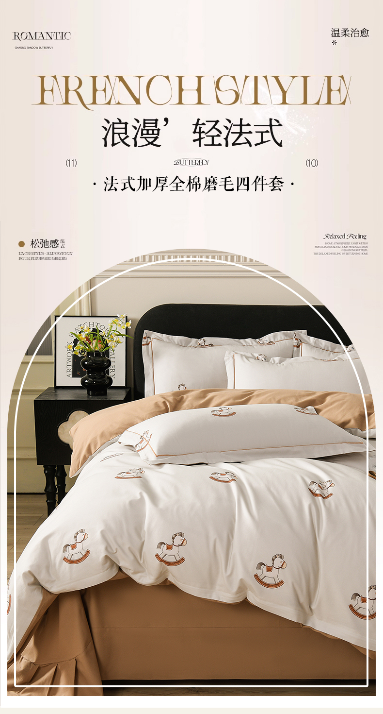 当前位置: 91家纺网 > 商品网购 > 床品套件 > 四件套 > 全棉普通四件套 > 金昱纺 2025新款法式加厚全棉纯棉磨毛四件套 摇摇马