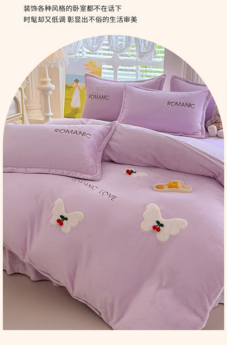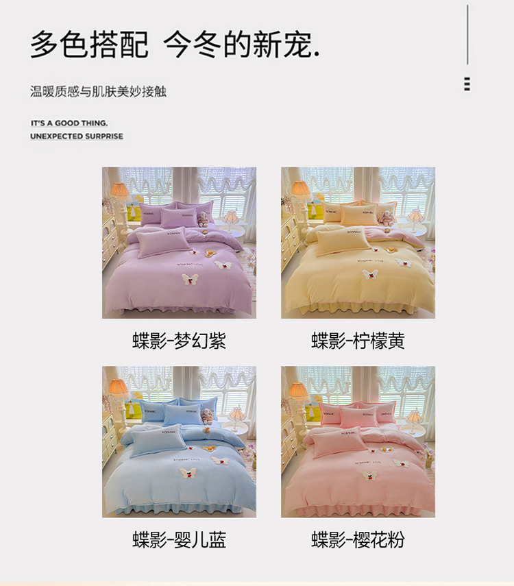 漫布云2025秋冬新款11斤230g全消光牛奶绒夹棉床盖款四件套纯色蕾丝花边刺绣床裙款床盖,蝶恋花-梦幻紫, 蝶恋花-嫩黄 ,蝶恋花-新芽绿, 蝶恋花-婴儿蓝, 蝶恋花-樱花粉