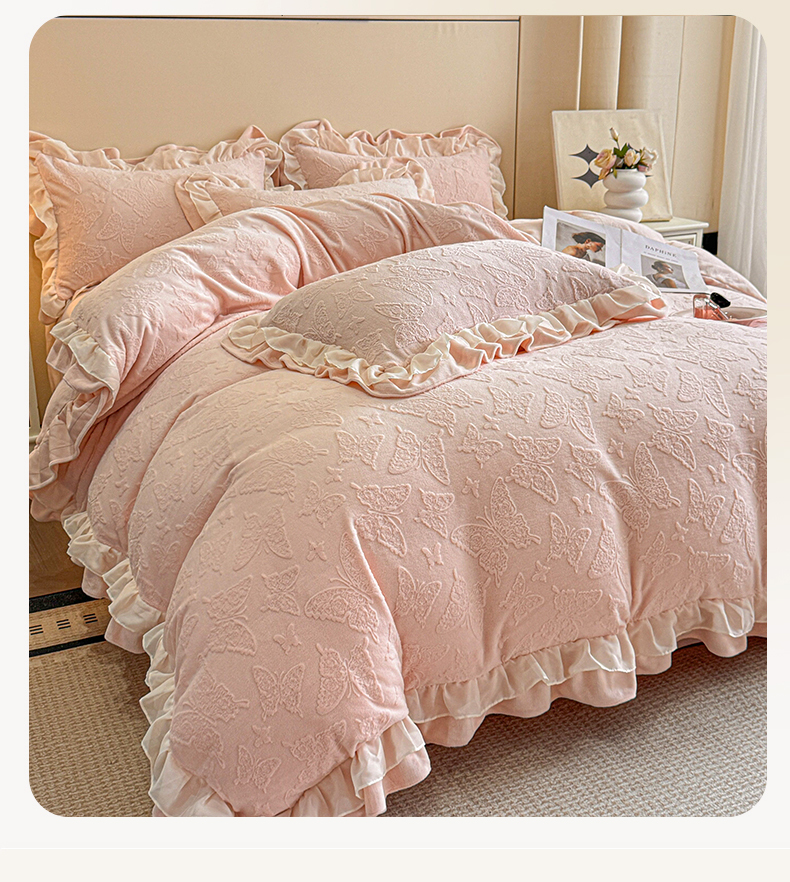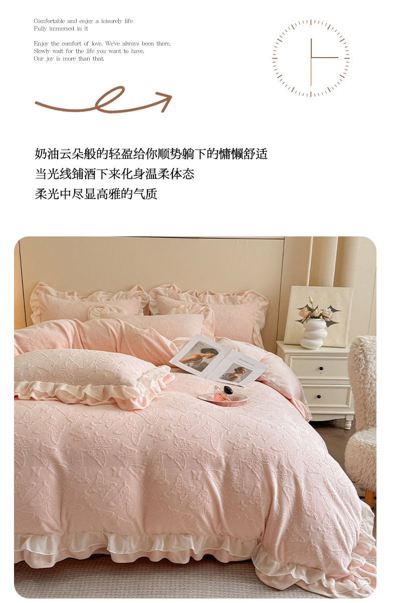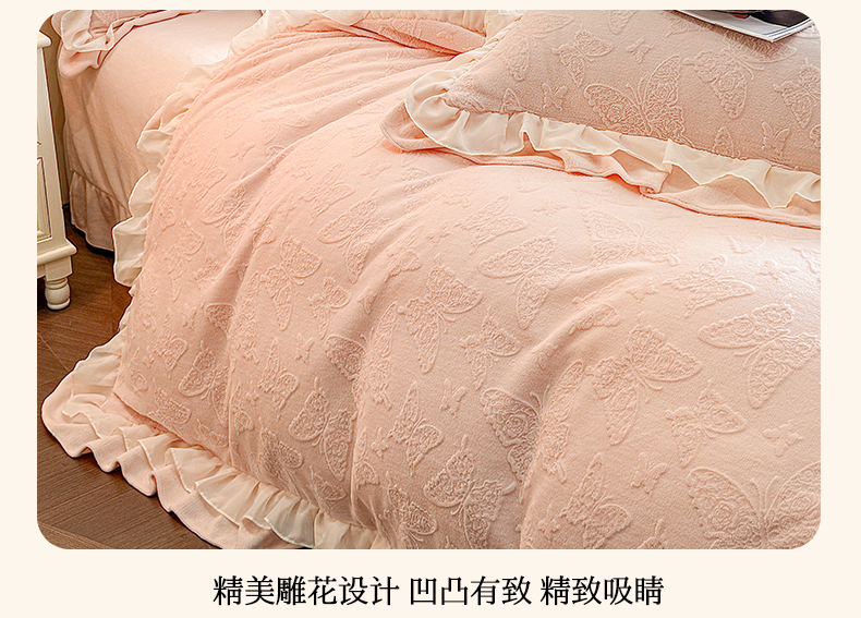 当前位置: 91家纺网 > 商品网购 > 床品套件 > 四件套 > 牛奶绒四件套 > 爱家(原缔乐家纺) 2025新款A类牛奶雕花绒四件套 山茶花-蝴蝶之恋系列 蝴蝶之恋-天空兰
