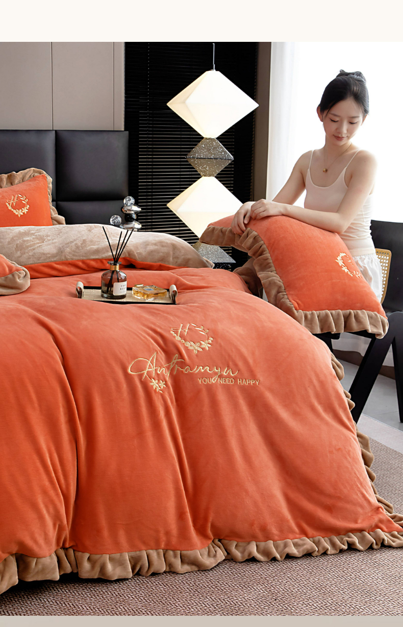 找底底2023新款230g牛奶绒法莱绒刺绣蕾丝边床裙款四件套,豆沙色,橘橙色,玛卡蓝,嫩黄,浅粉色,雾紫,质感灰