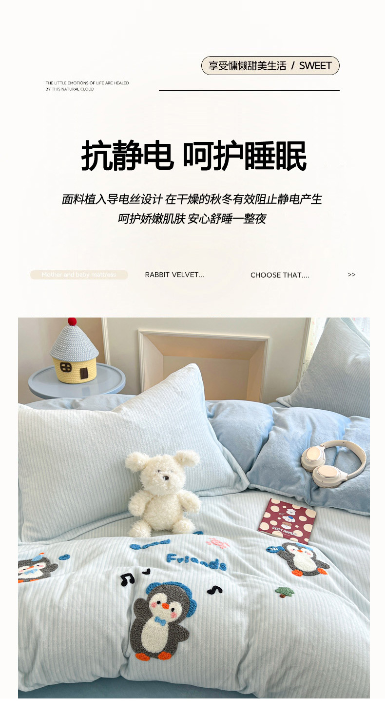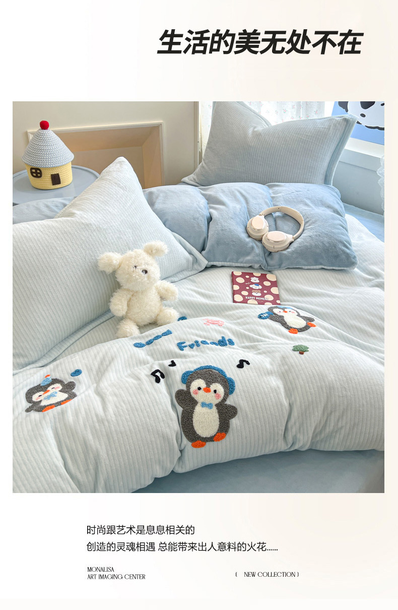 商品名称:倾慕家纺 2026新款卡通毛巾绣加厚保暖牛奶绒四件套 音乐企鹅