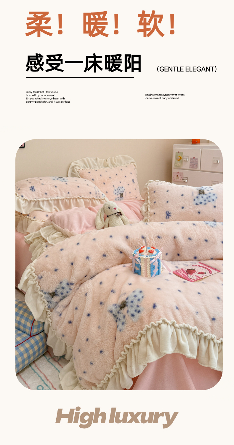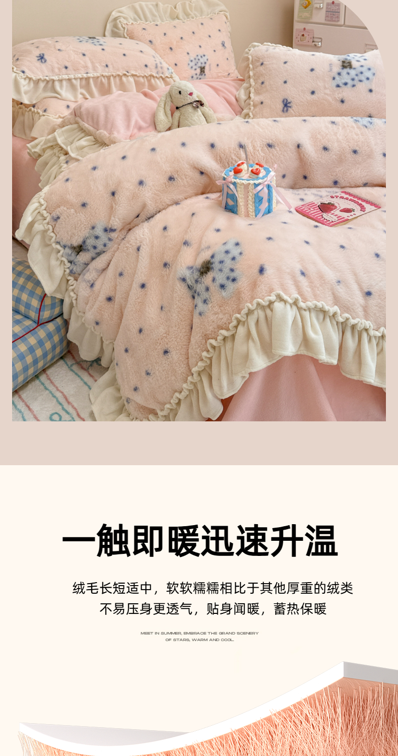 商品名称:米莱家纺 2025新款兔毛绒花边牛奶绒四件套 蝴蝶结