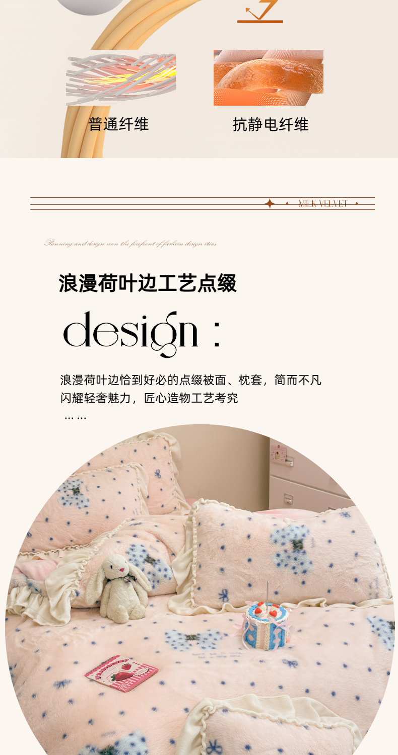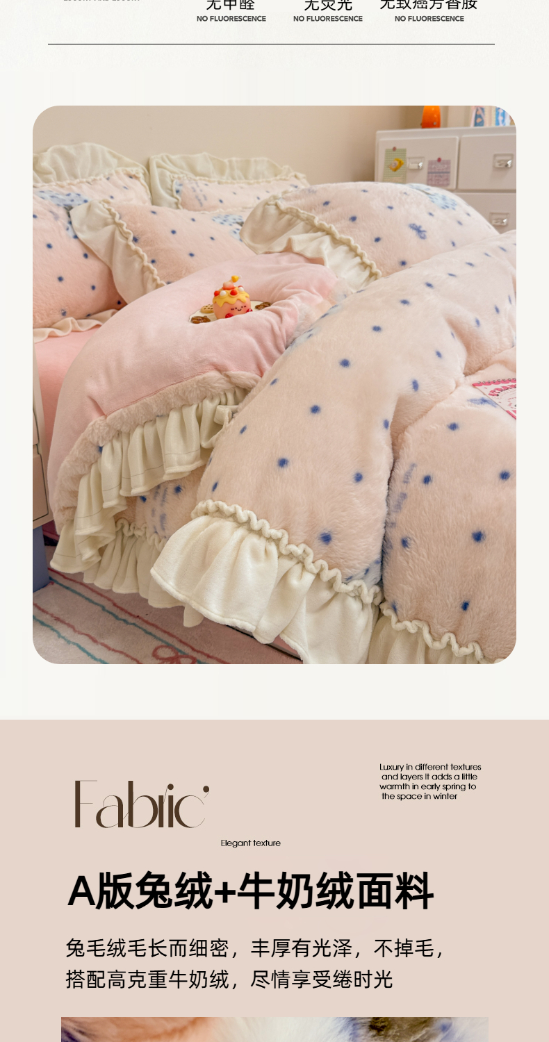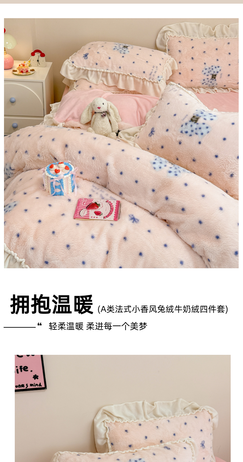 (总)米莱家纺 2025新款兔毛绒花边牛奶绒四件套,彩色圆点,繁花,粉黛,蝴蝶结,咖圆点,可爱兔,可爱熊,蔷薇