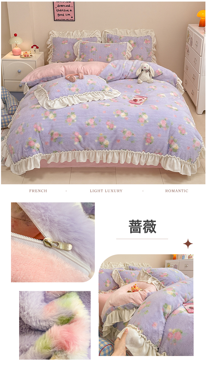 (总)米莱家纺 2023新款兔毛四件套 玫瑰花,玫瑰花-白加咖,玫瑰花-白加粉,玫瑰花-粉色,玫瑰花-灰色,玫瑰花-咖色,玫瑰花-绿色,玫瑰花-紫色