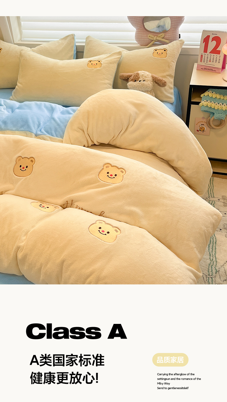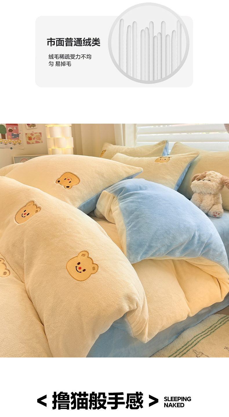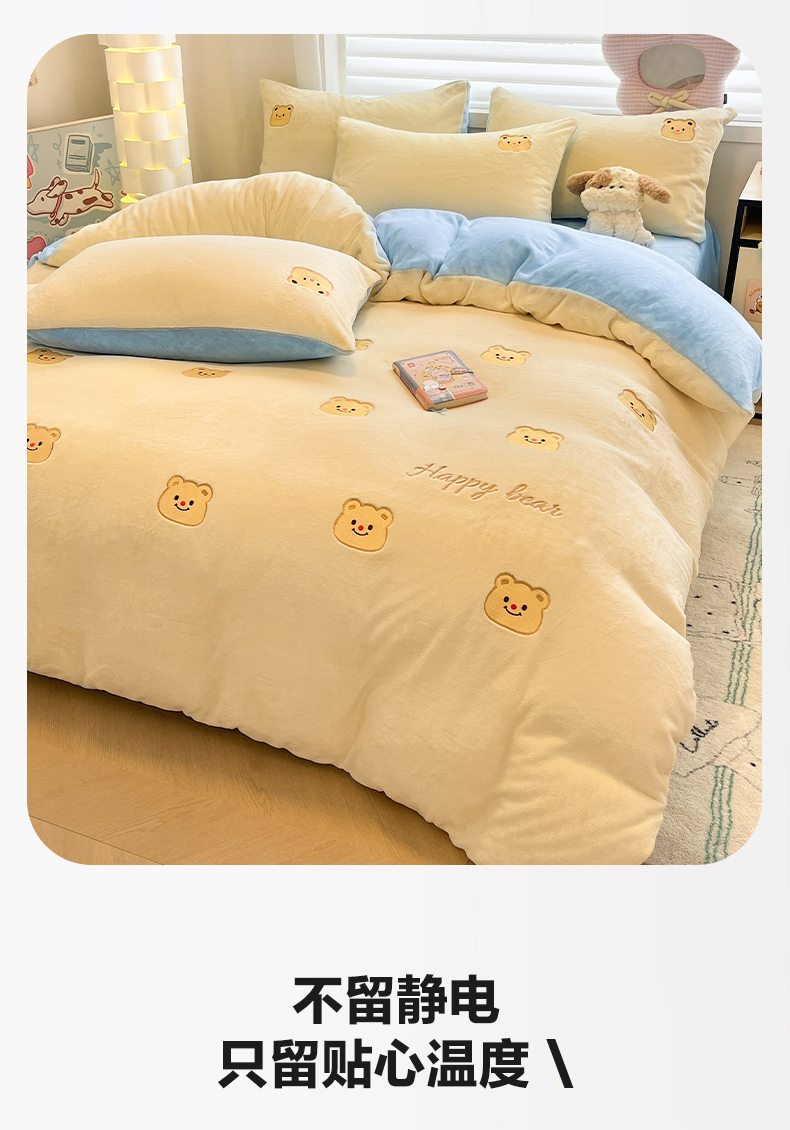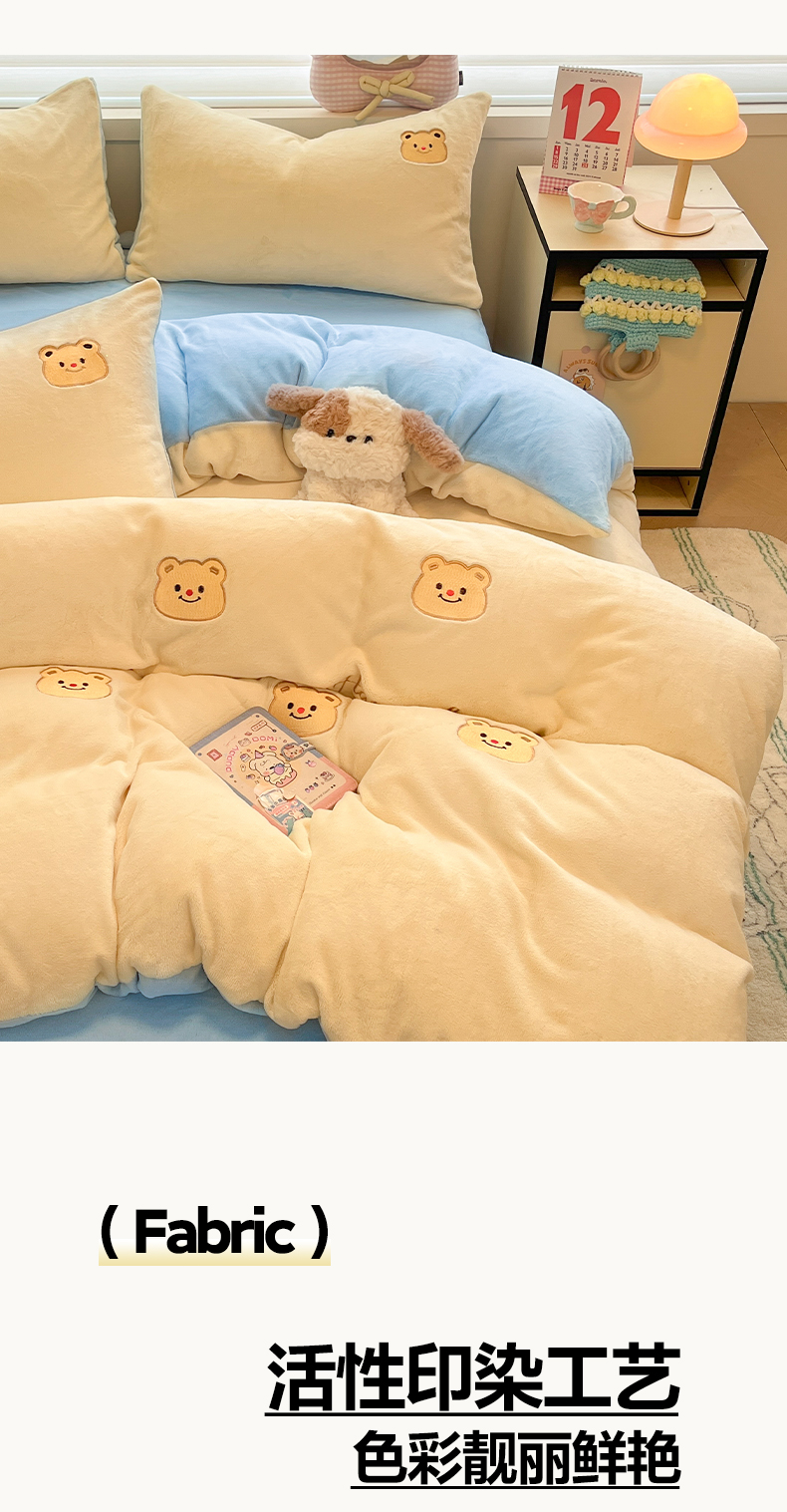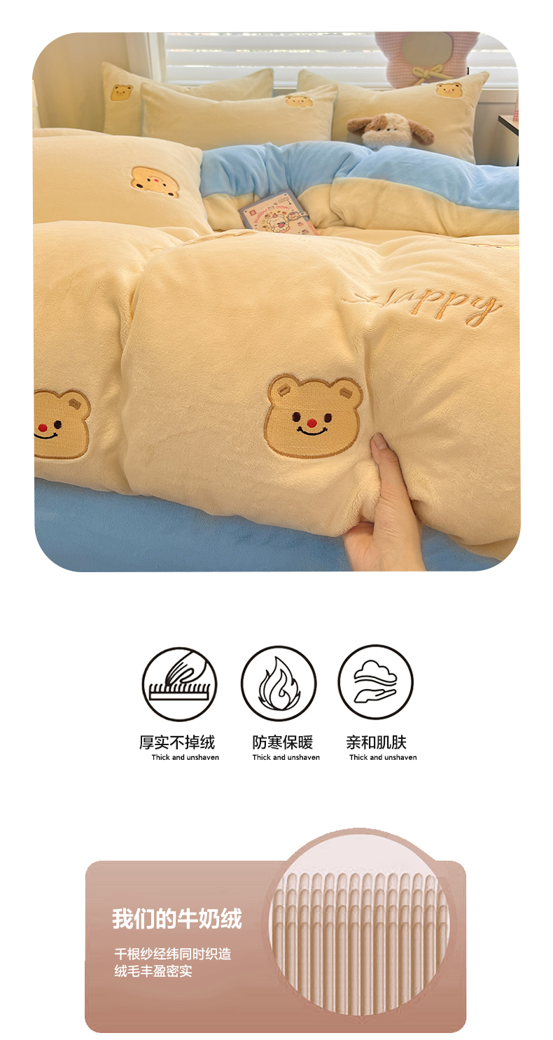 商品名称:如一 2025新款200克缸染高克重精绣牛奶绒四件套 绒-奶油熊-黄蓝