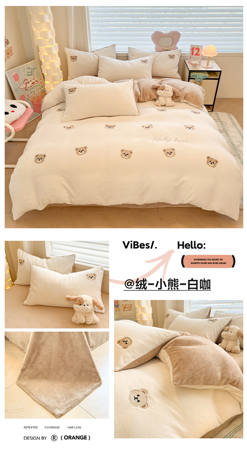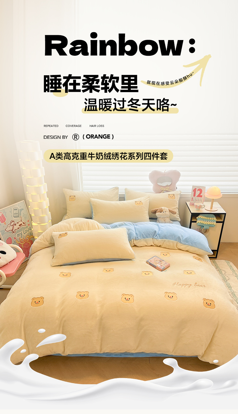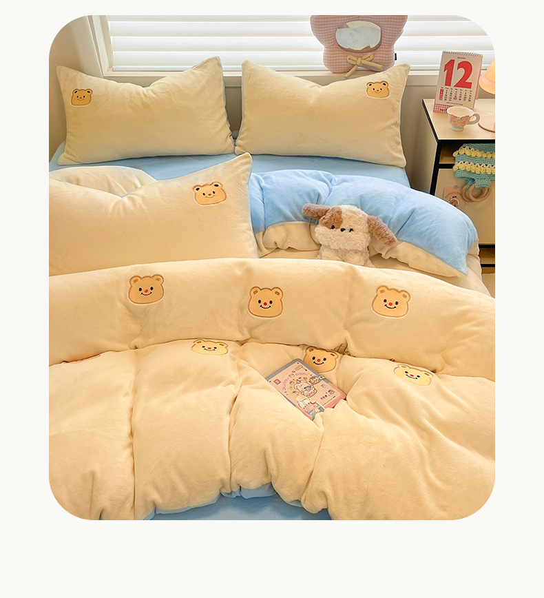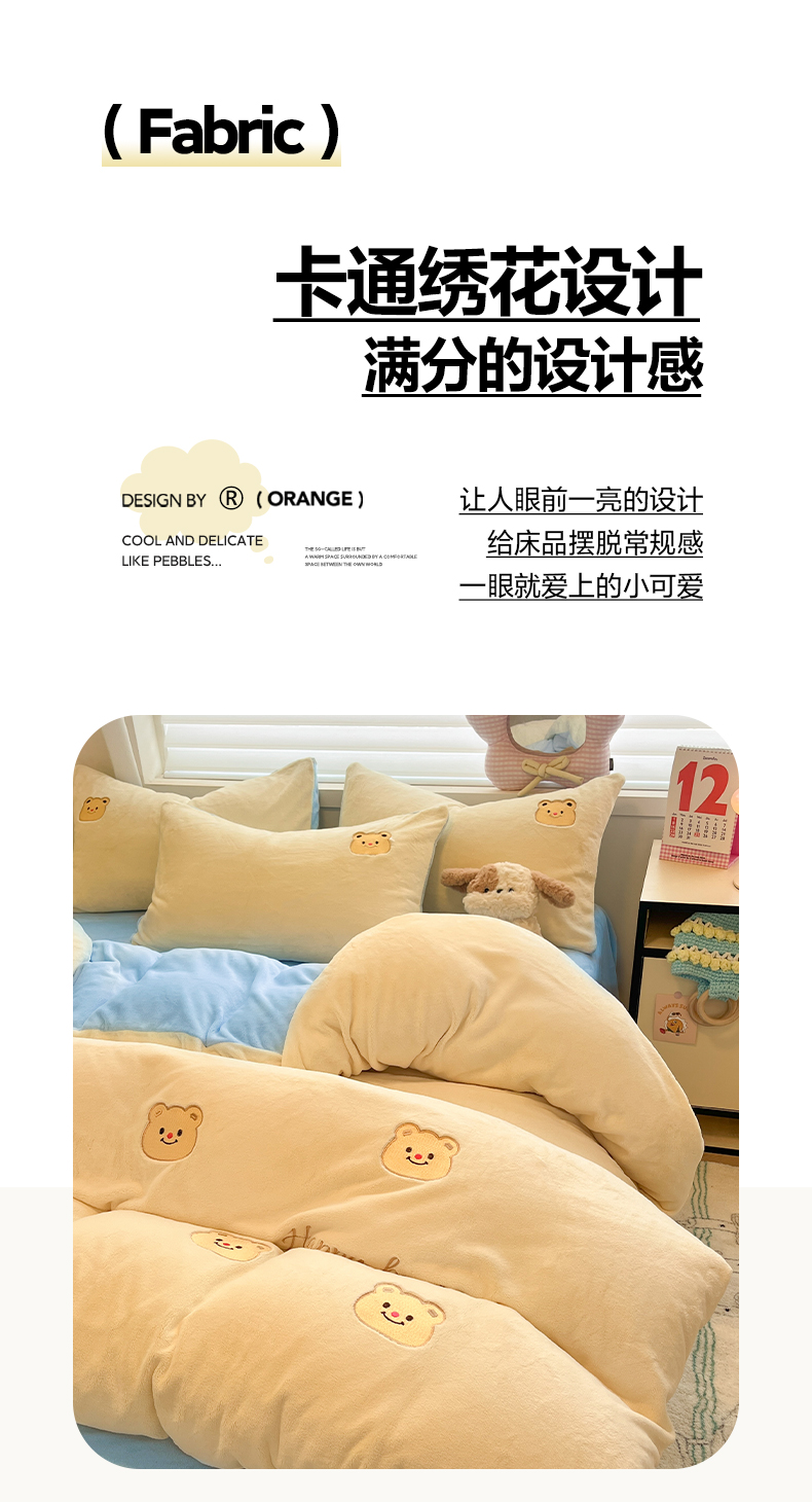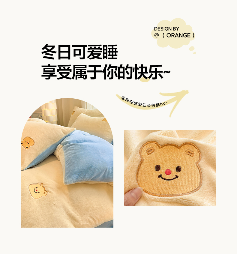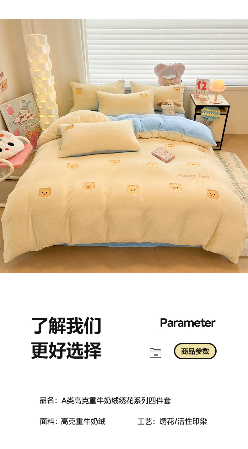 商品名称:如一 2025新款200克缸染高克重精绣牛奶绒四件套 绒-奶油熊-黄蓝