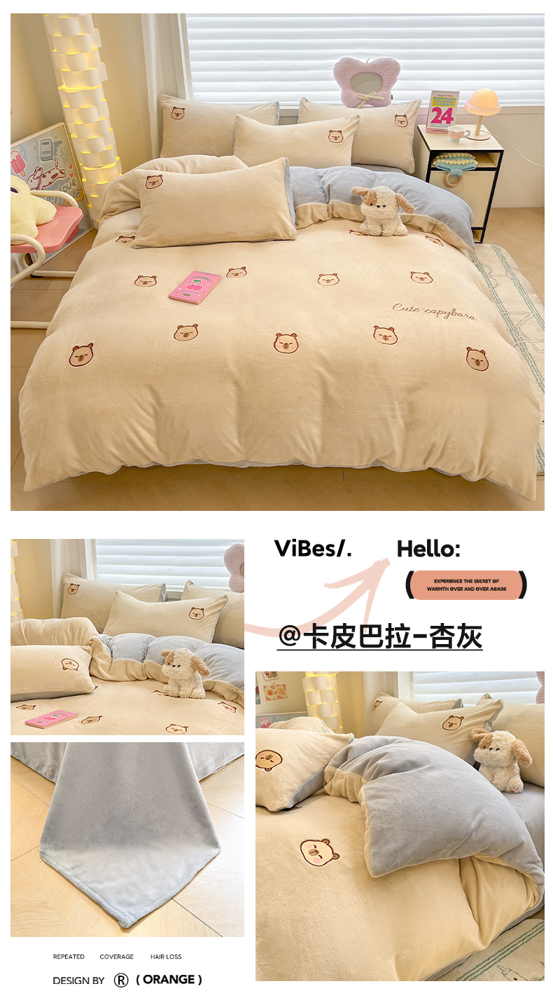 如一 2025新款200克缸染高克重精绣牛奶绒四件套 绒-奶油熊-黄蓝