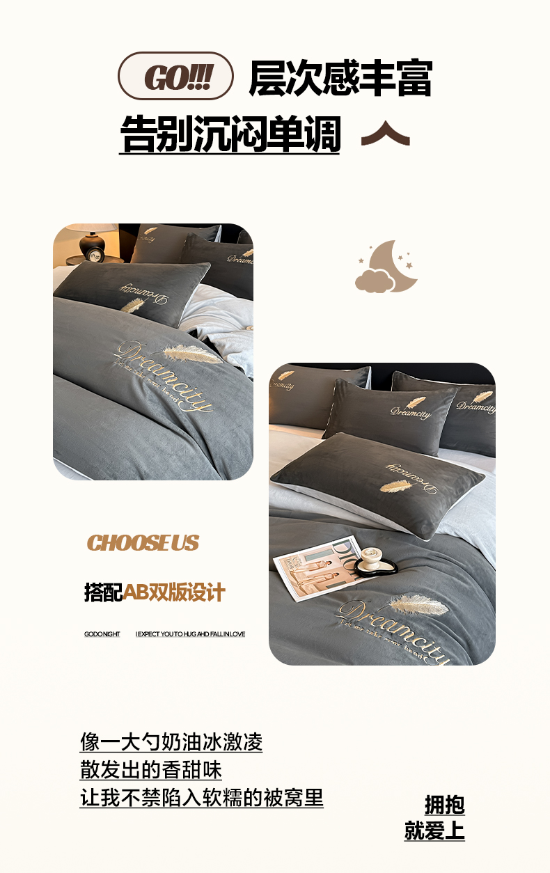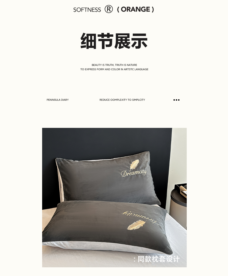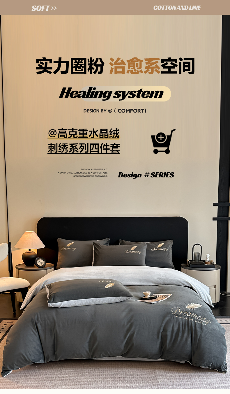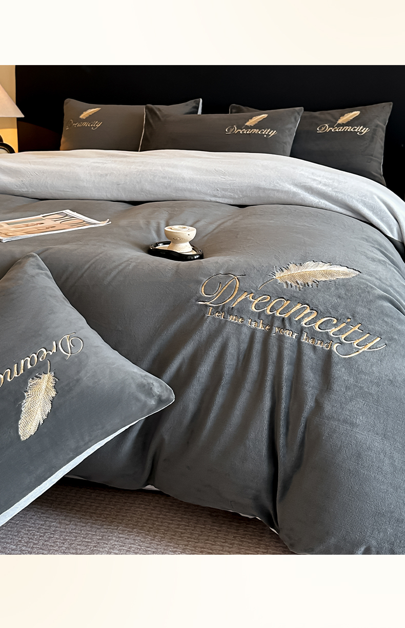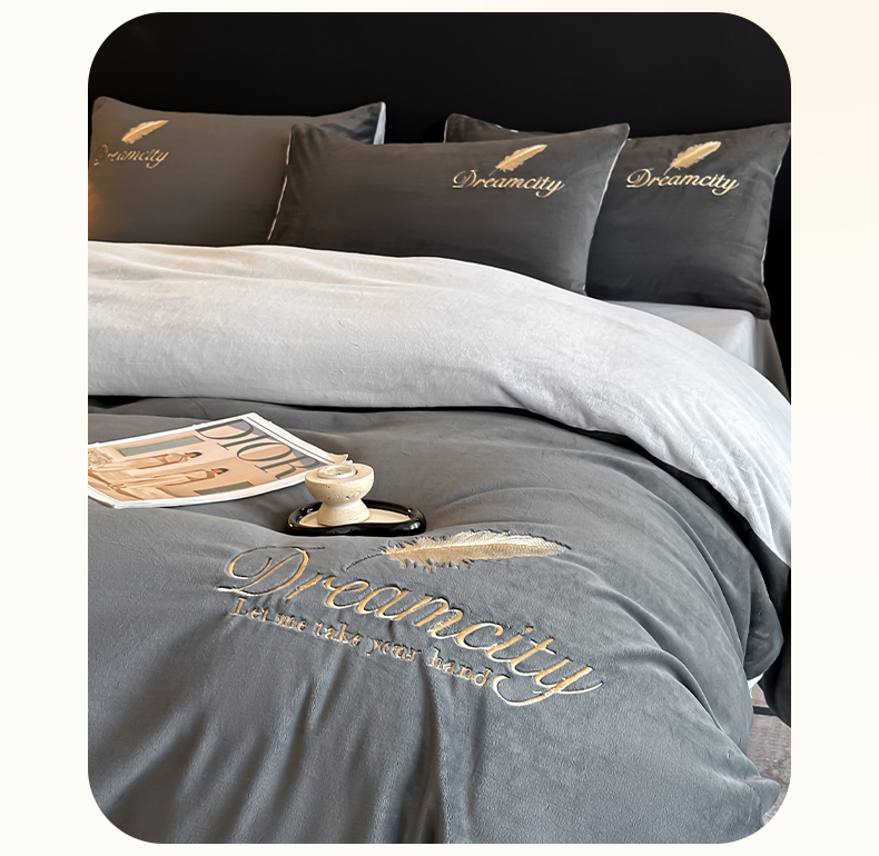 当前位置: 91家纺网 > 商品网购 > 床品套件 > 四件套 > 水晶绒四件套 > 如一 2025新款水晶绒双拼刺绣四件套轻羽系列-系列二 轻羽-深灰银