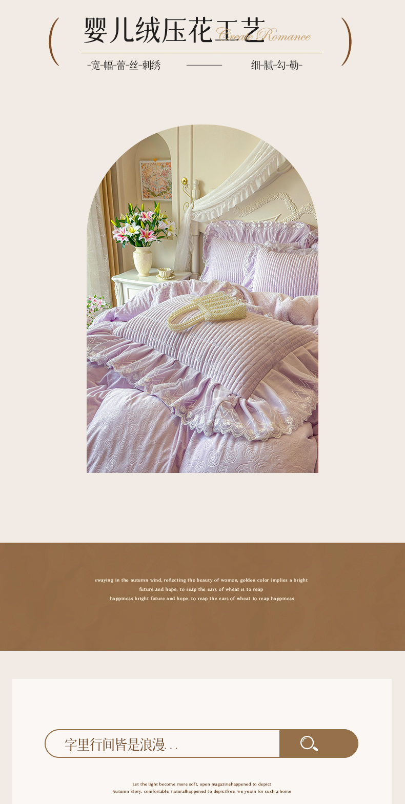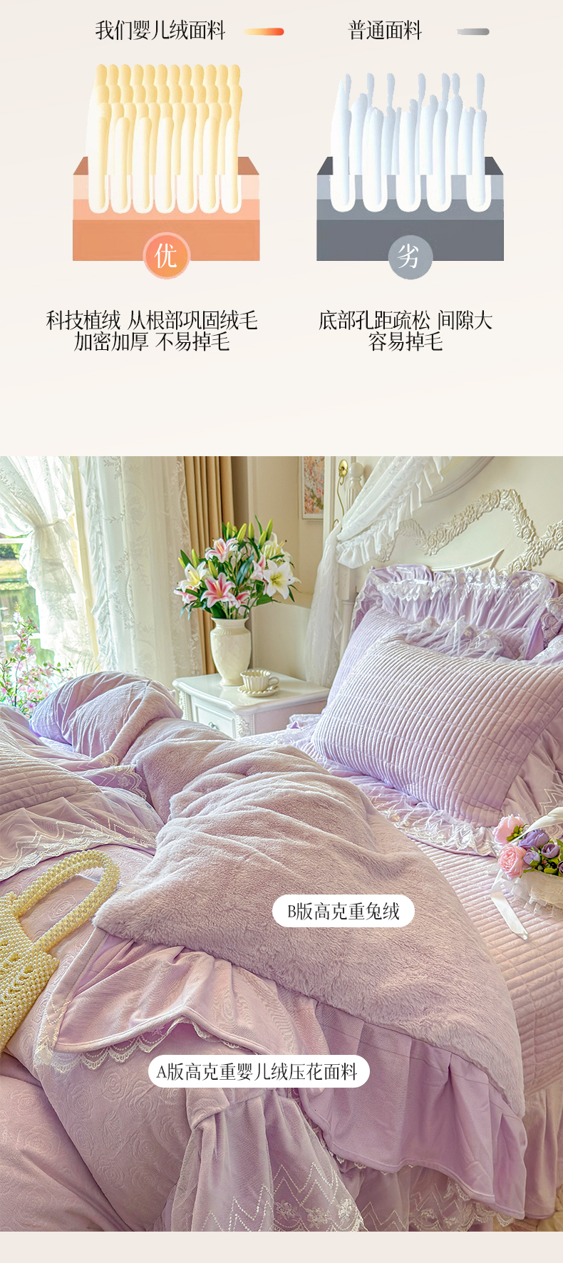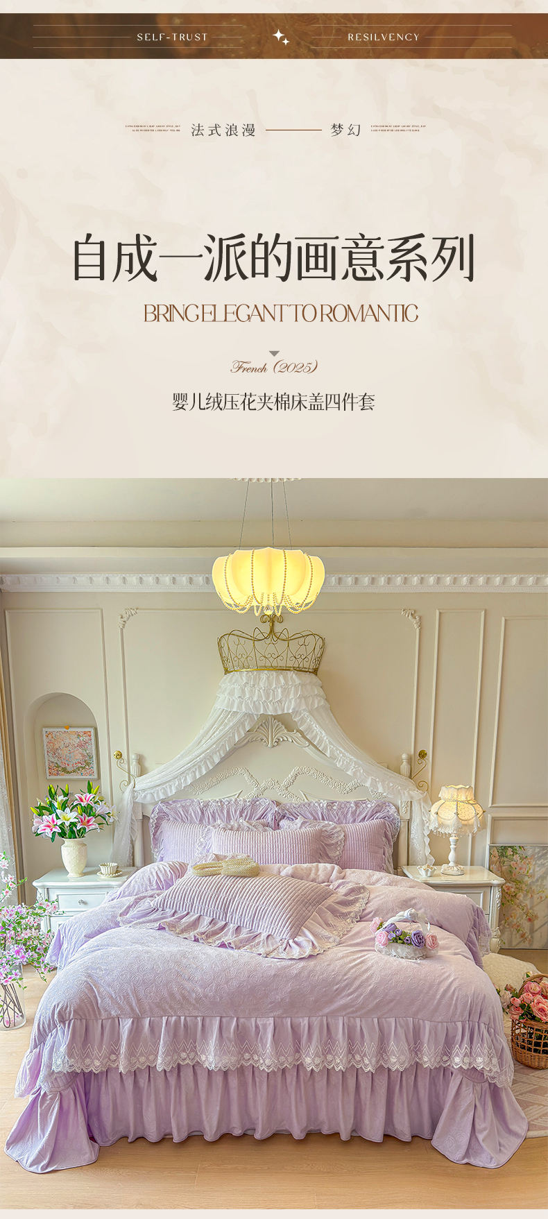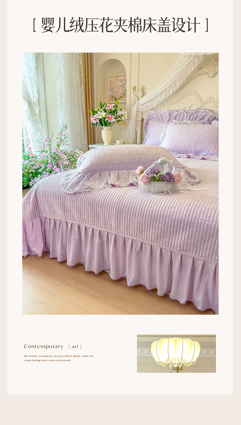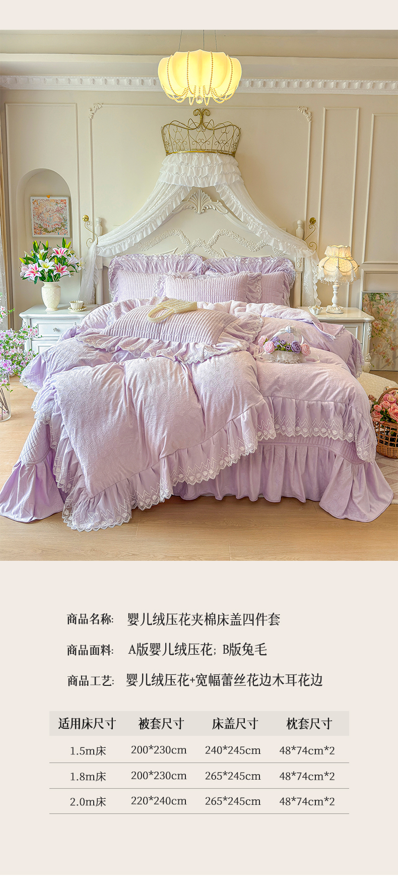 商品名称:宜凡家纺 2025新款婴儿绒压花夹棉床盖四件套-香奈花园 香奈花园-雪青