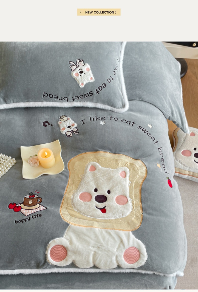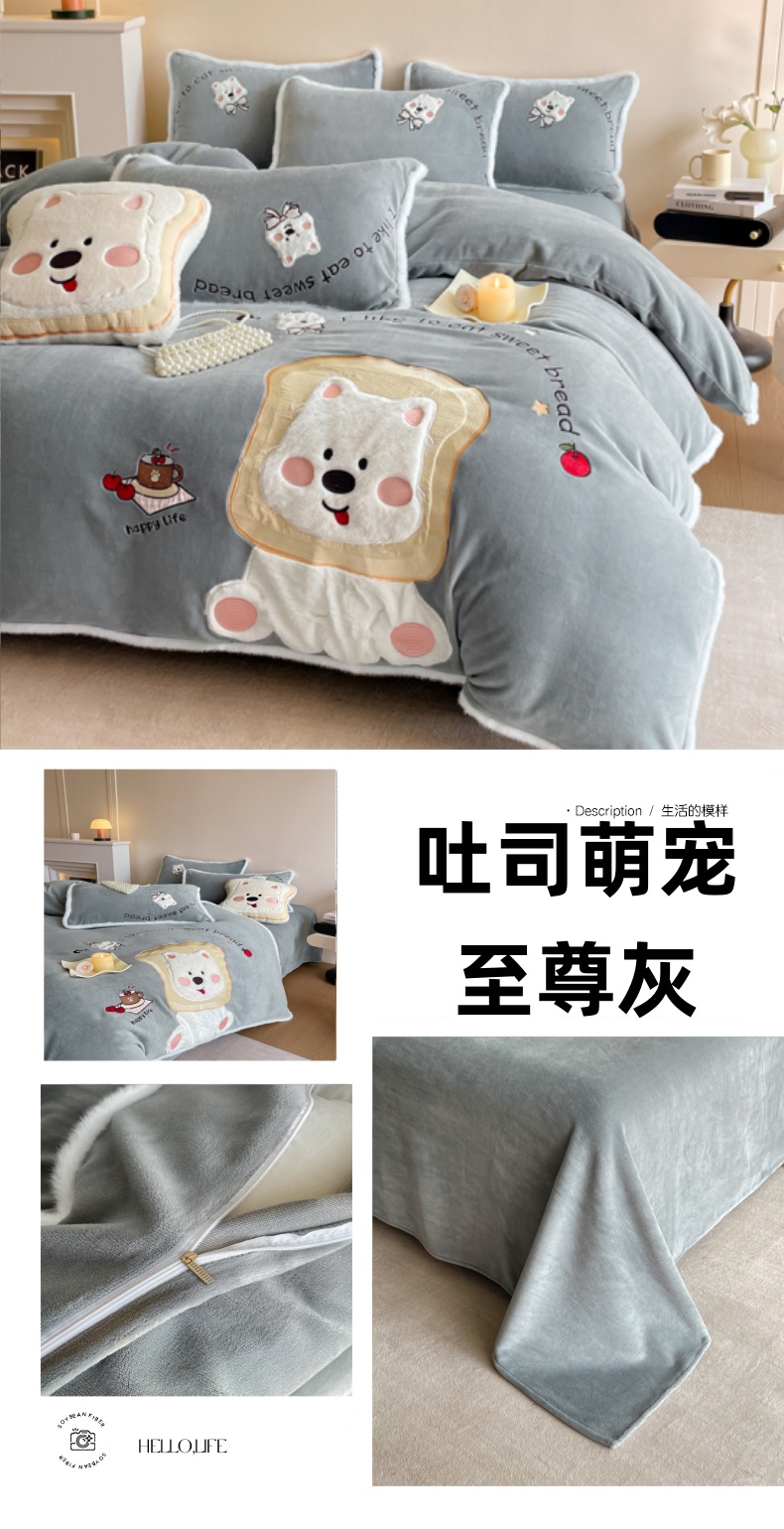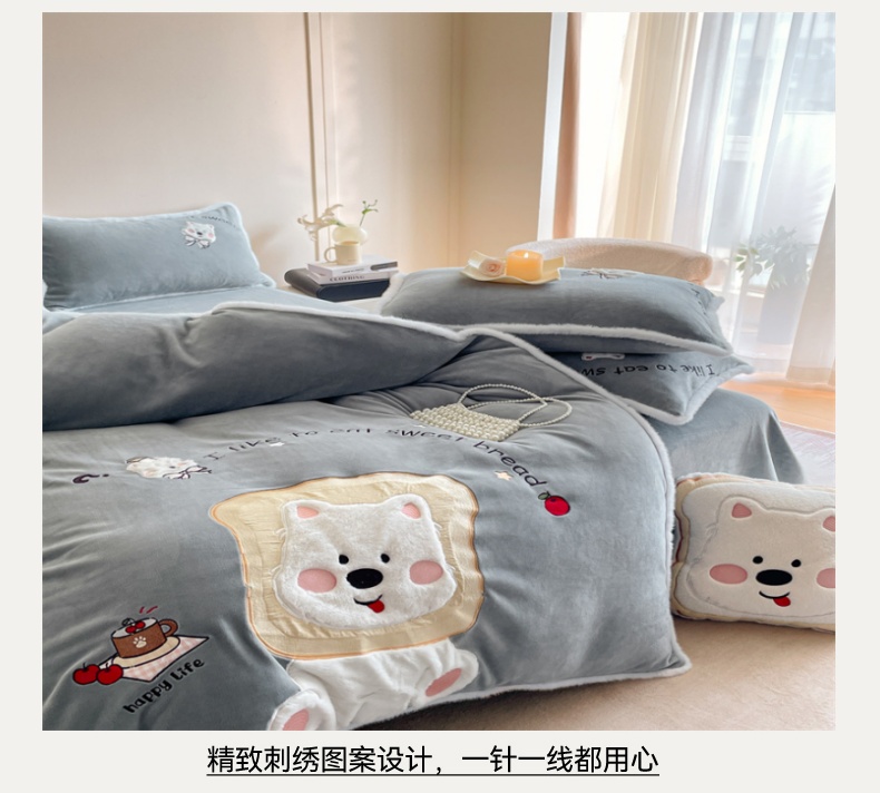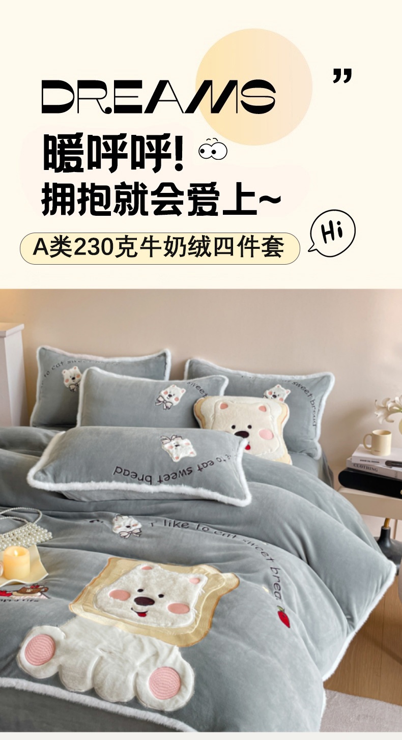 商品名称:梦舒羽 2025新款A类230克全消光刺绣贴布牛奶绒四件套学生宿舍床单款床上用品套件 吐司萌宠-至尊灰