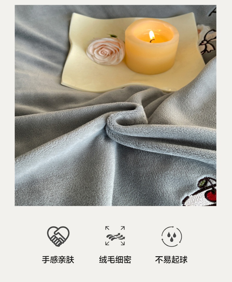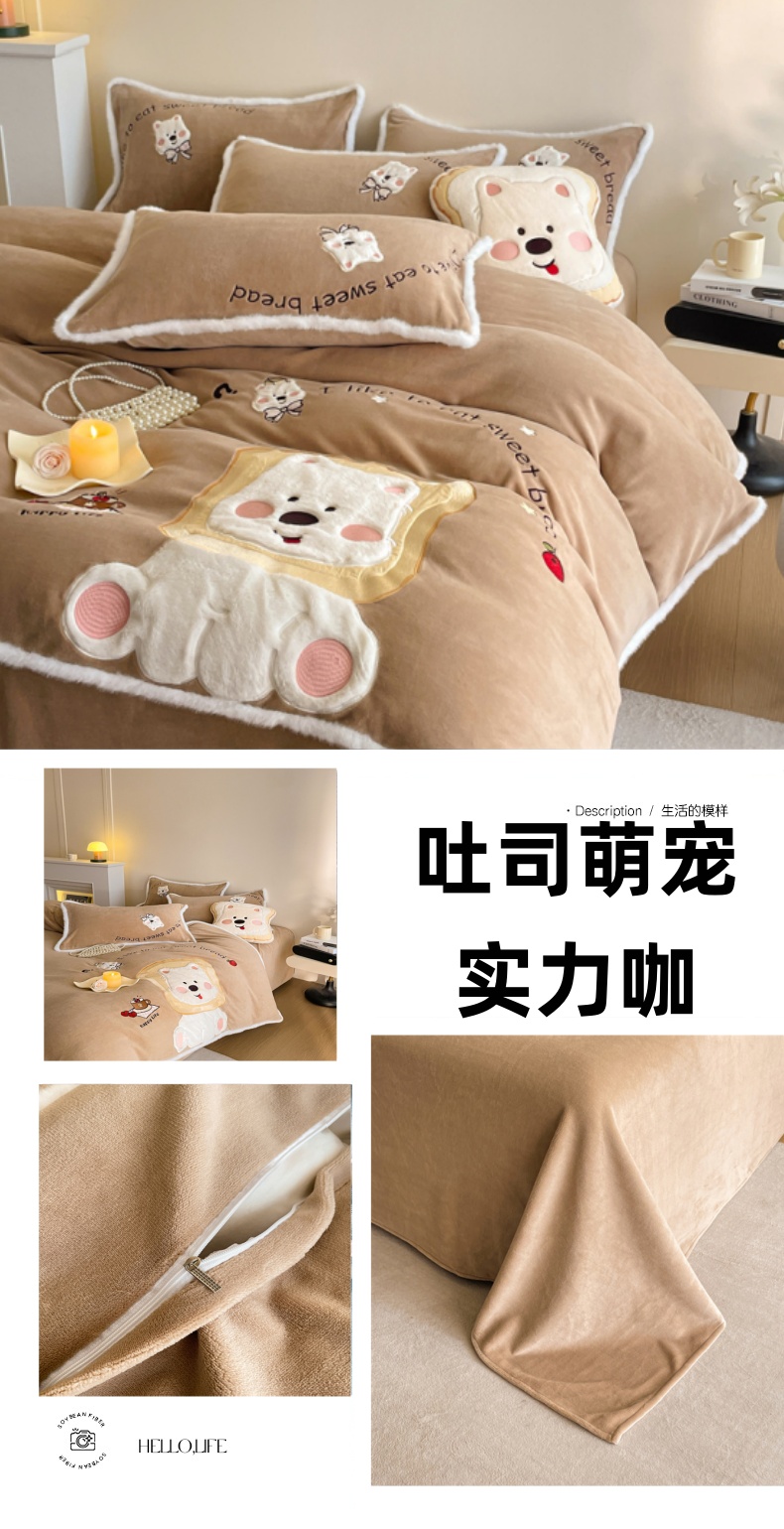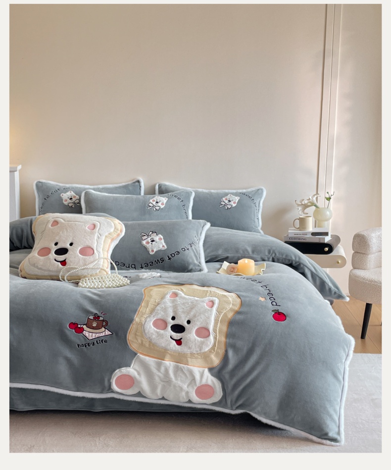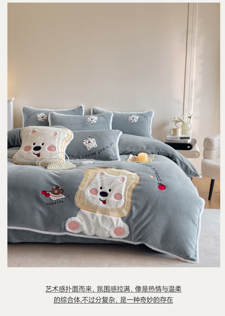 商品名称:梦舒羽 2025新款A类230克全消光刺绣贴布牛奶绒四件套学生宿舍床单款床上用品套件 吐司萌宠-至尊灰