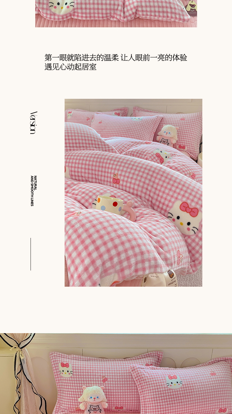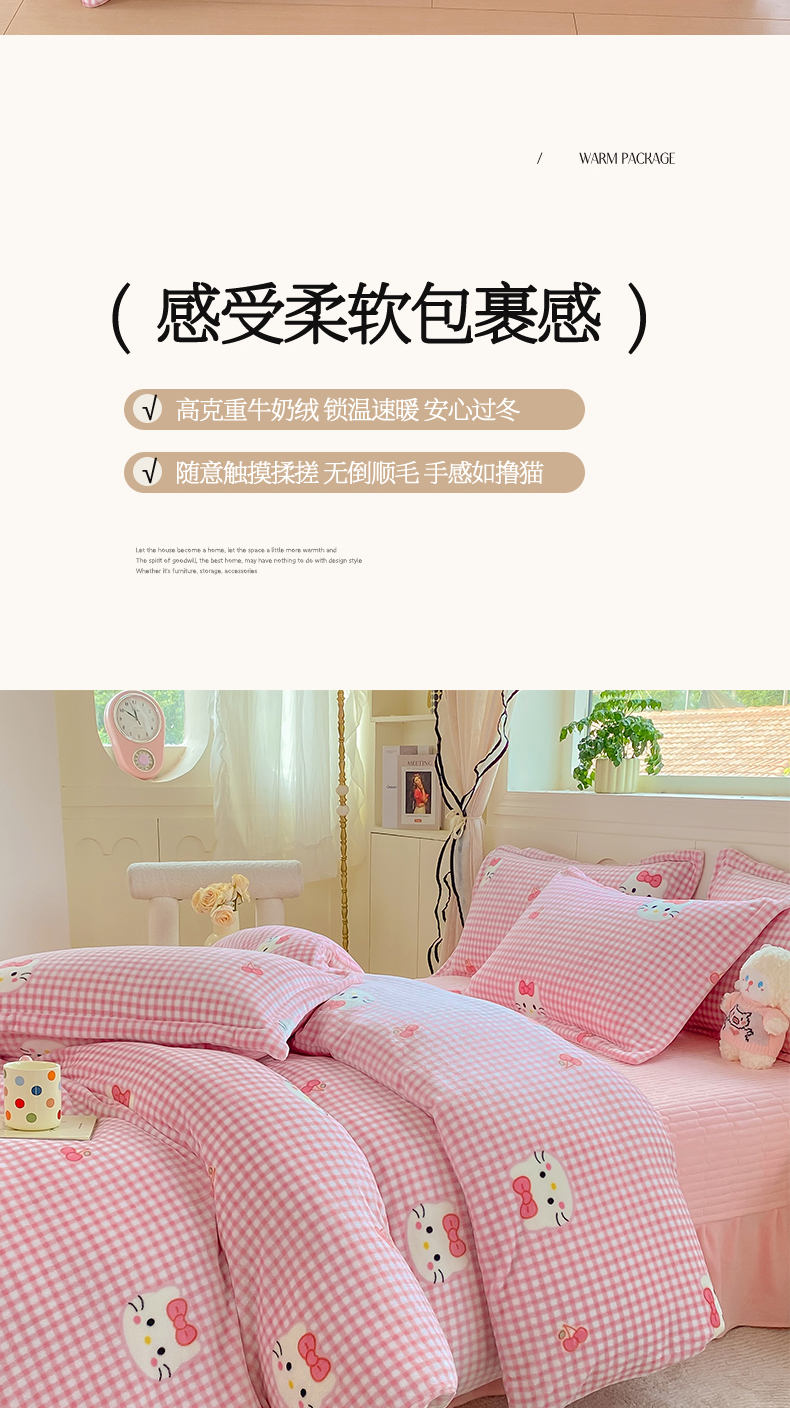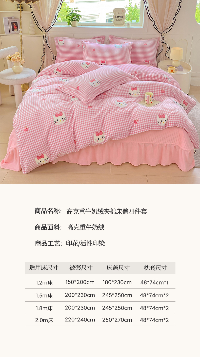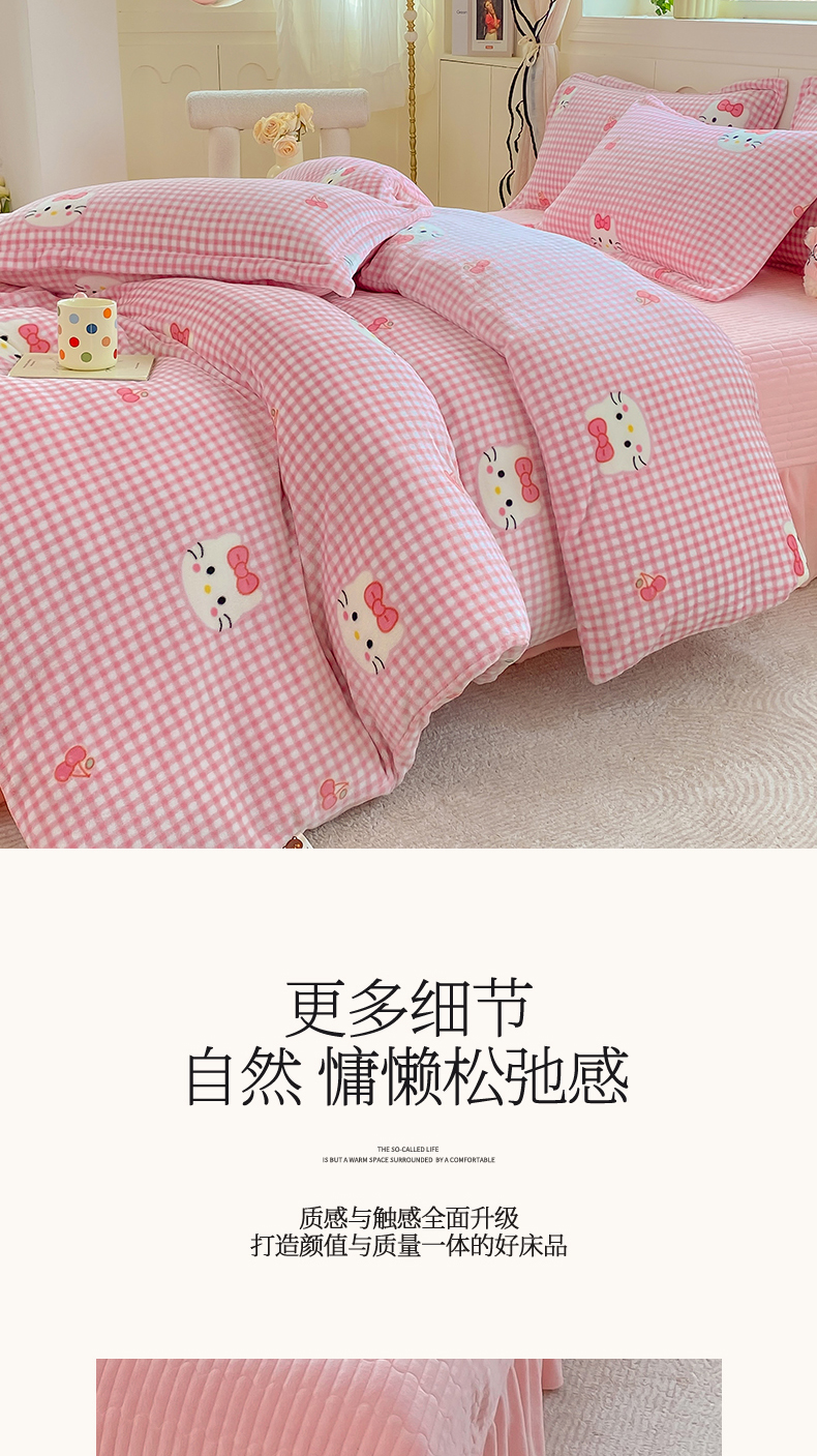 商品名称:豫见家纺 2025新款高克重牛奶绒夹棉床盖四件套 甜心凯蒂-粉