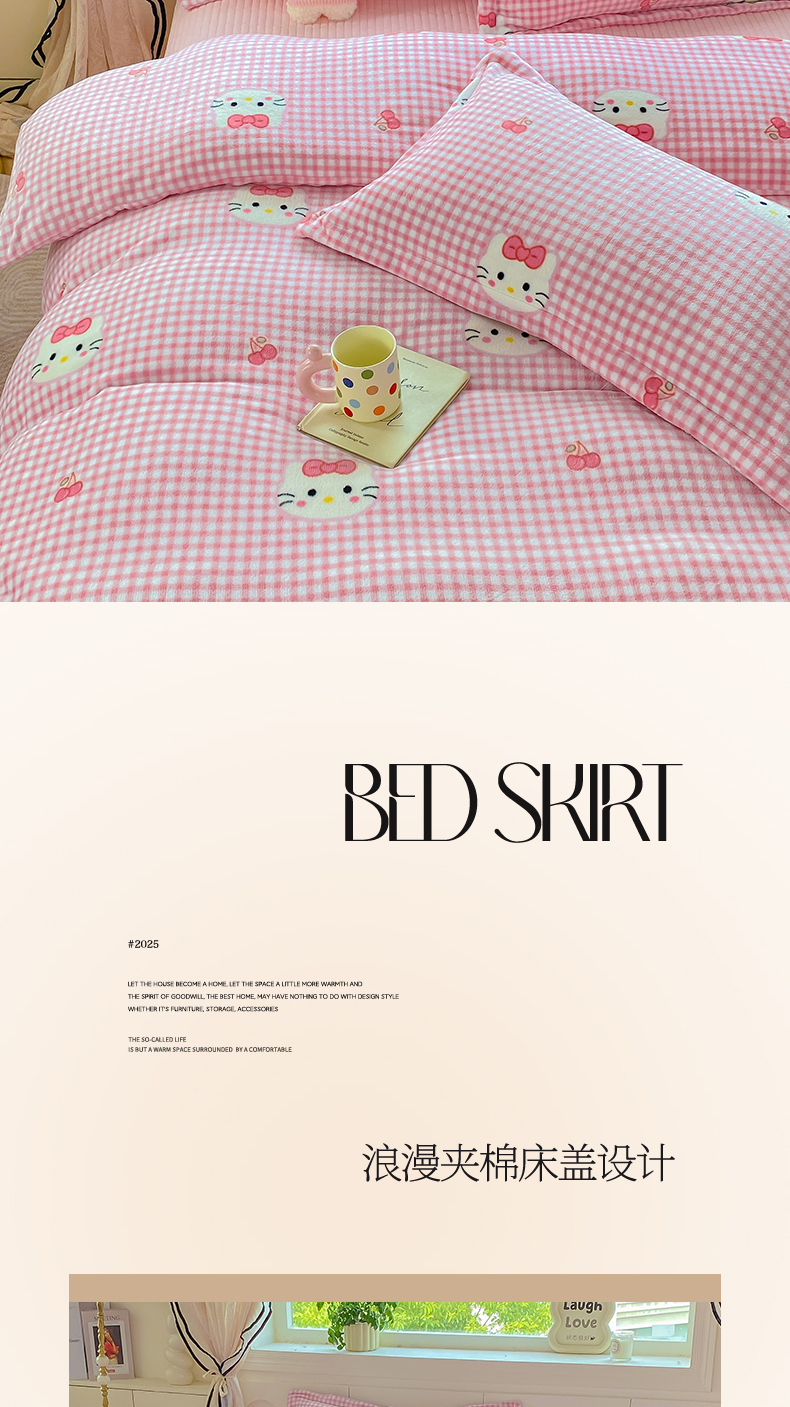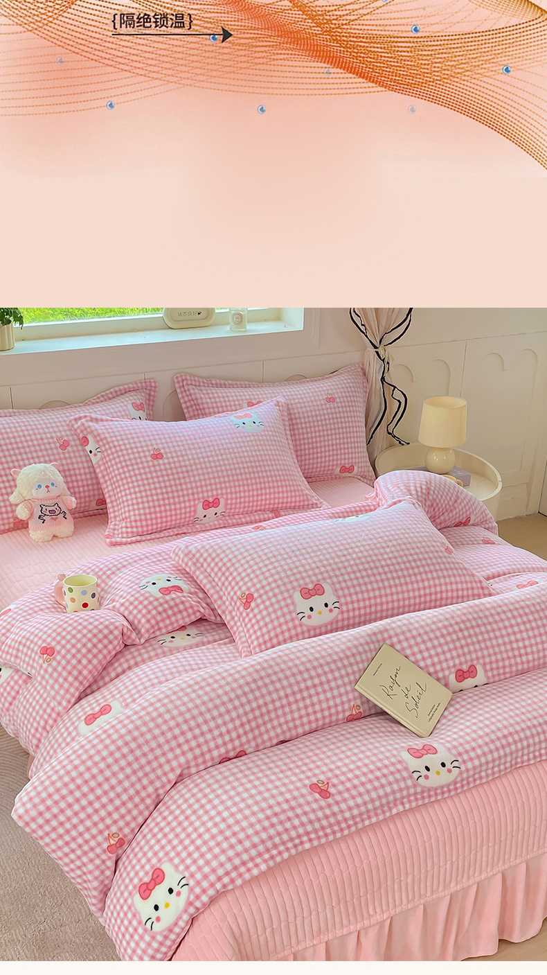 豫见家纺 2025新款高克重牛奶绒夹棉床盖四件套 甜心凯蒂-粉