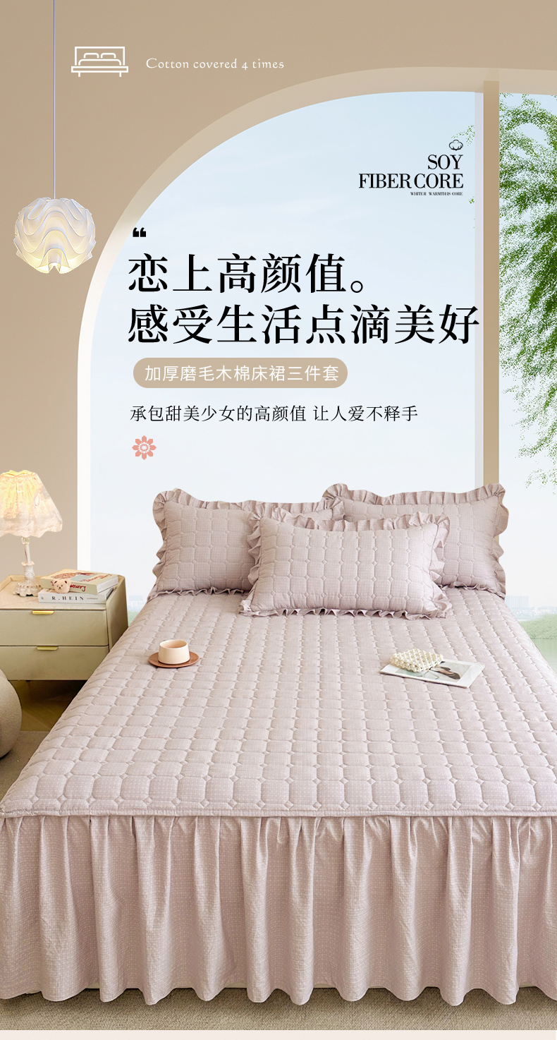(总)十个点家纺 2025新款加厚磨毛木棉床裙三件套-绫罗系列,爱意萌萌,贝贝熊,格桑花,海棠花,蝴蝶兔,花千骨,米兰,木棉花,山茶花,同心结,心相印,心愿-米