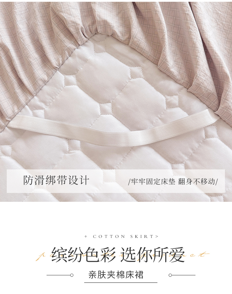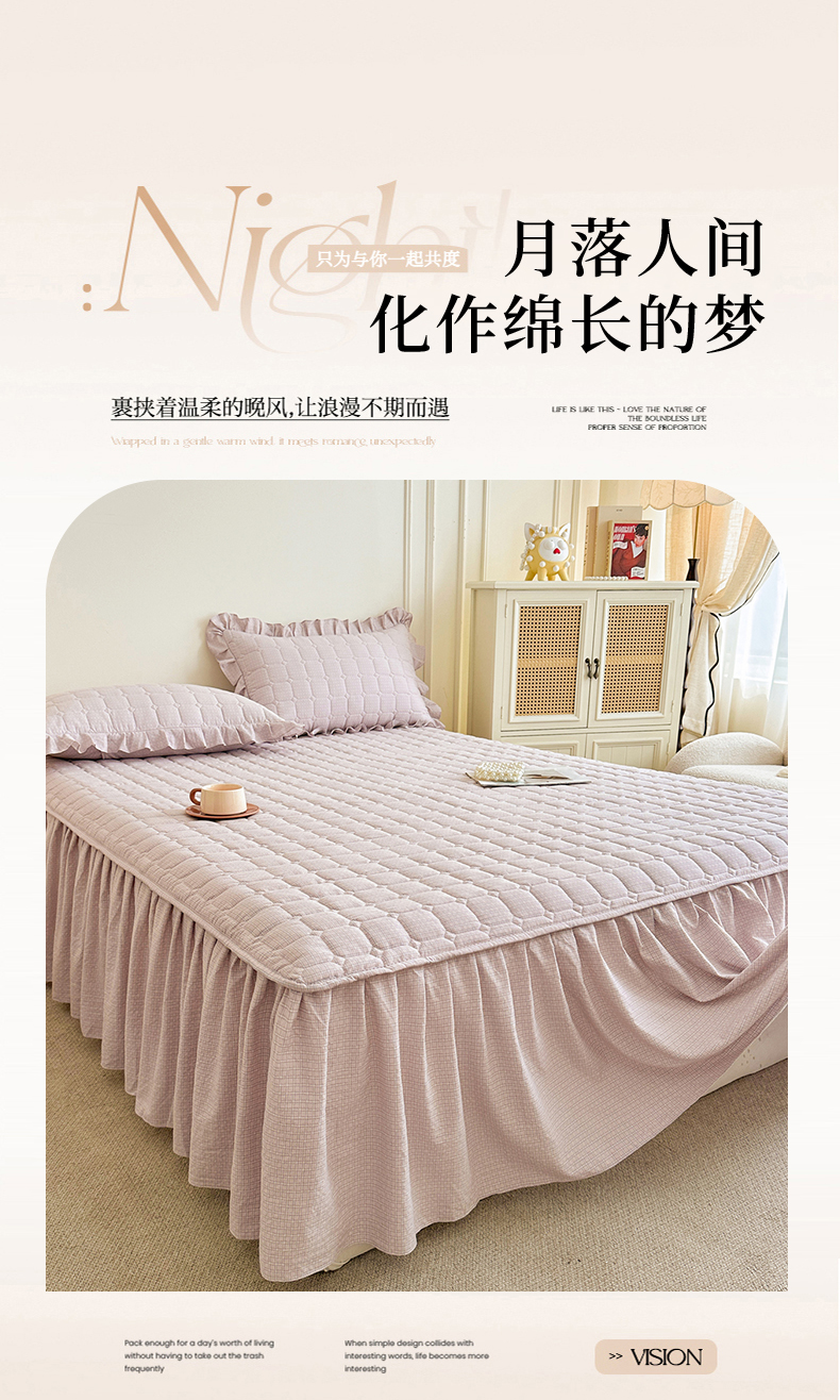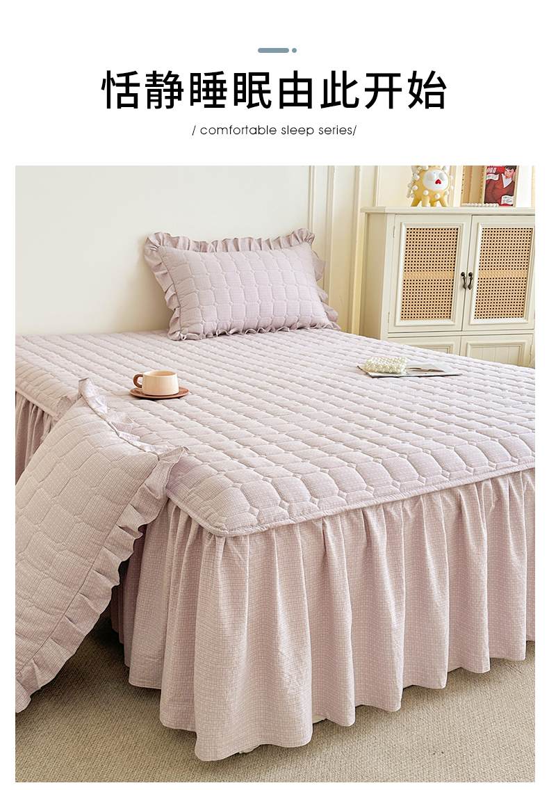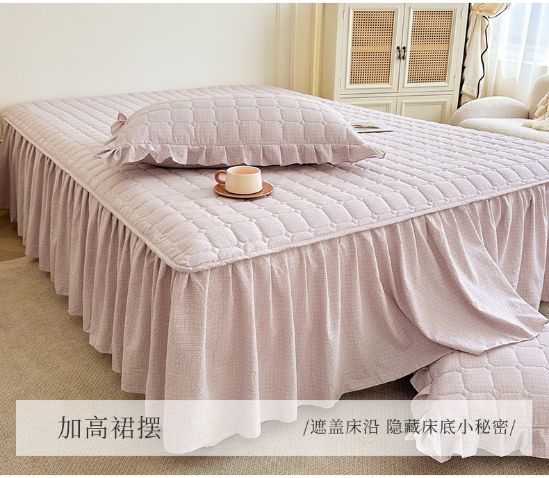 (总)十个点家纺 2025新款千鸟格磨毛绗缝夹棉纯色花边床裙三件套,经典白色,经典兰色,经典浅灰,经典浅驼,经典深灰,经典玉粉