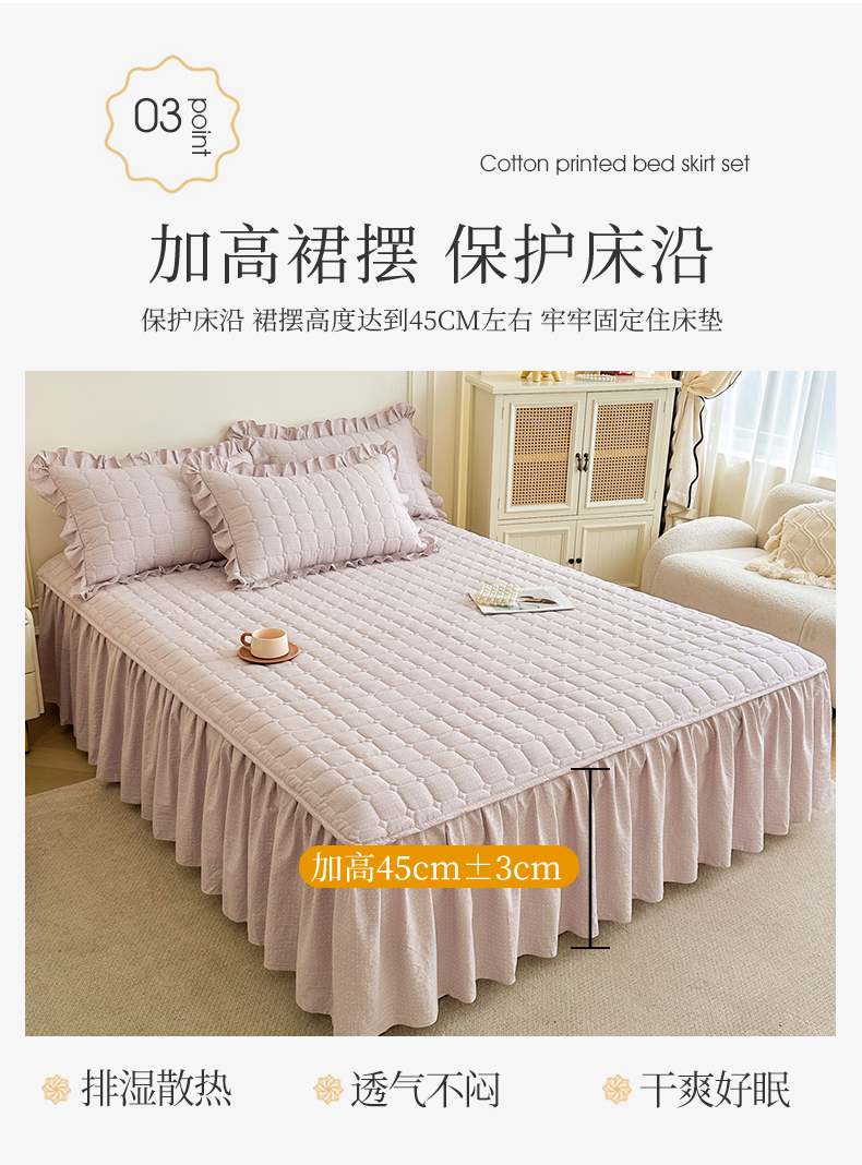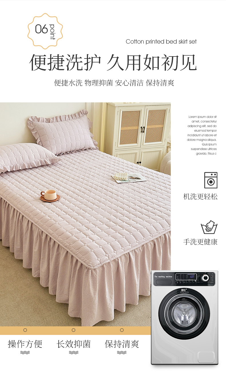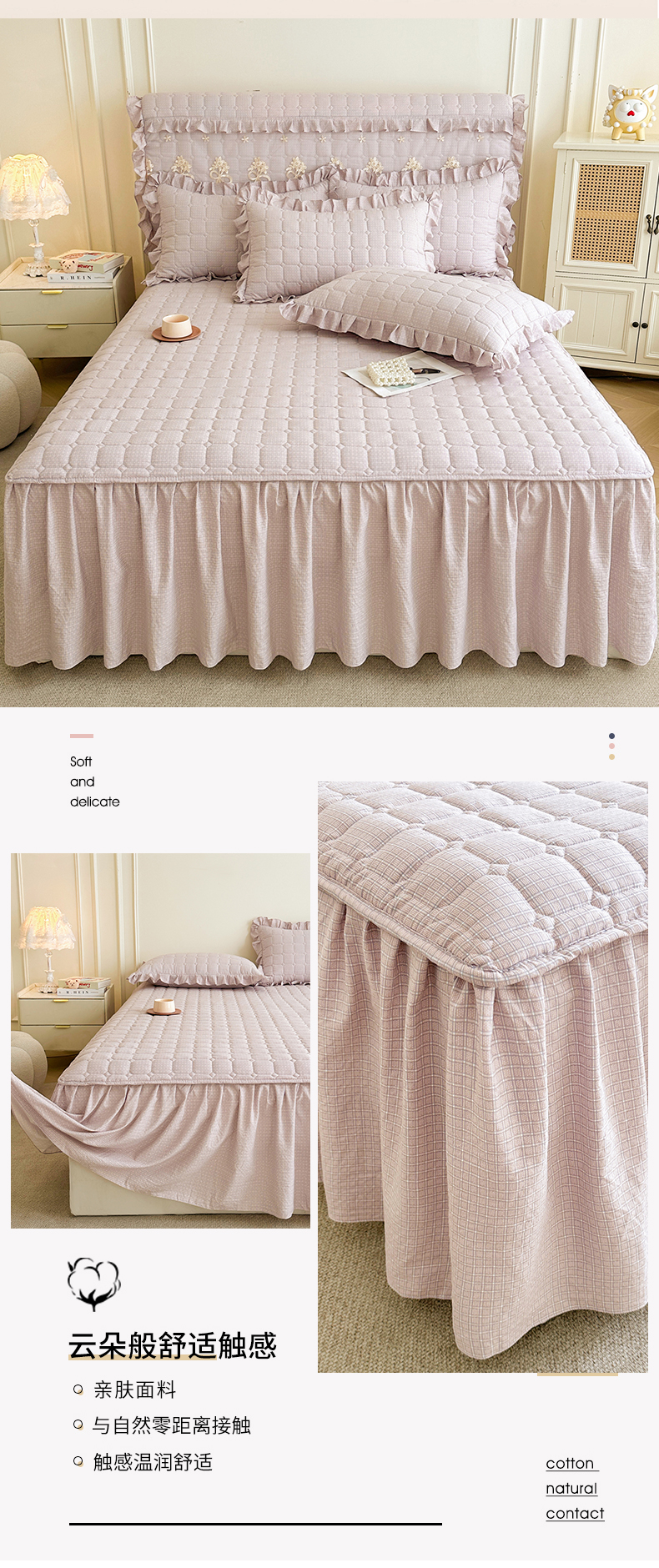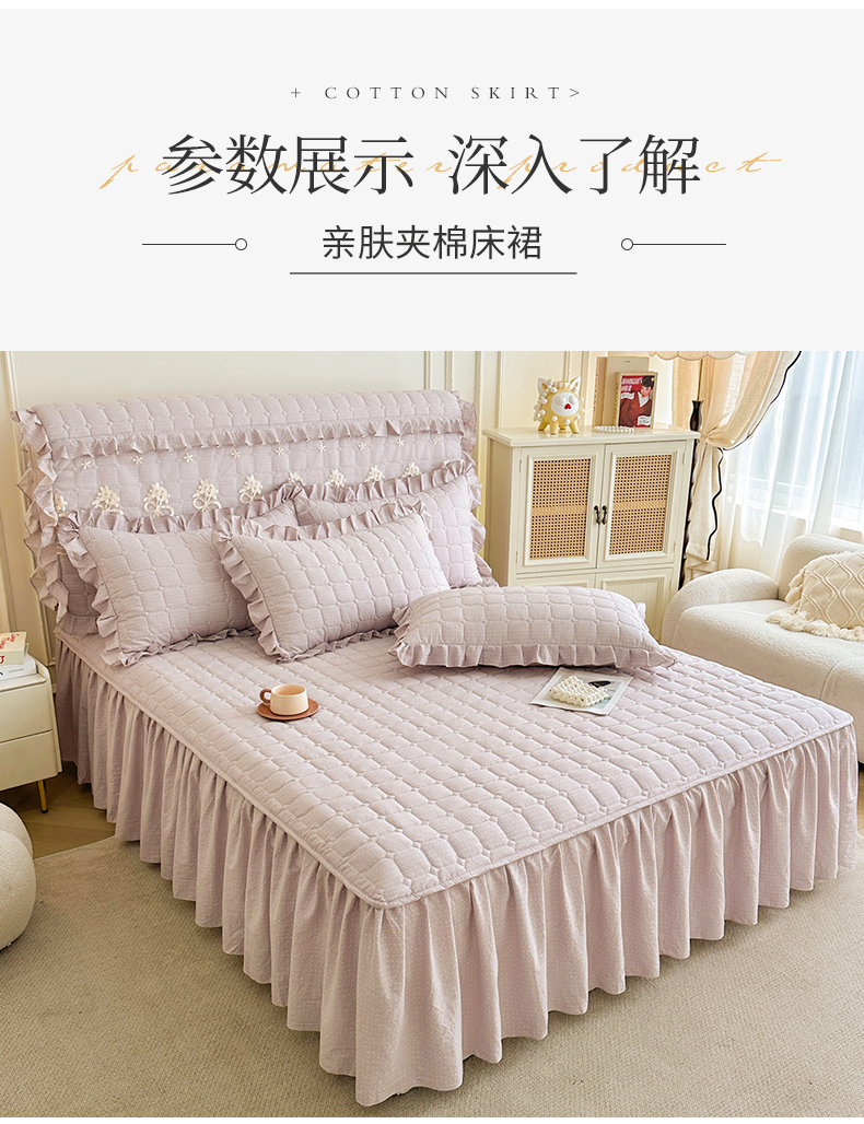 (总)十个点家纺 2025新款千鸟格磨毛绗缝夹棉纯色花边床裙三件套,经典白色,经典兰色,经典浅灰,经典浅驼,经典深灰,经典玉粉