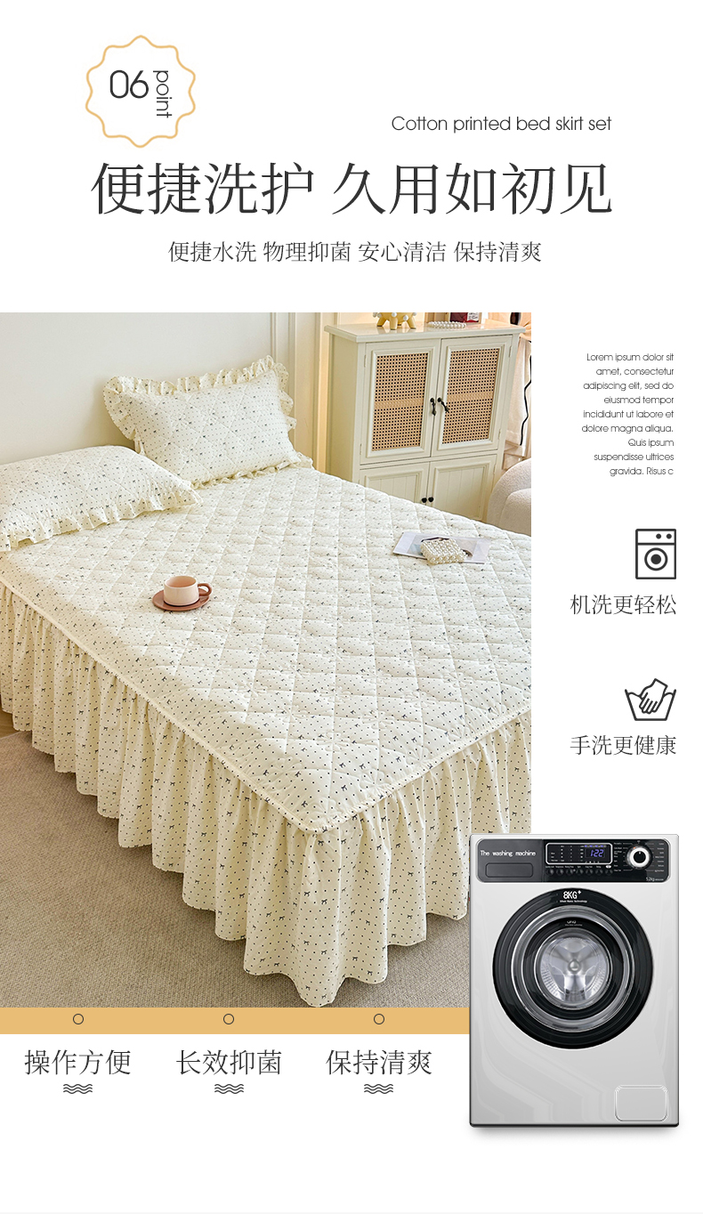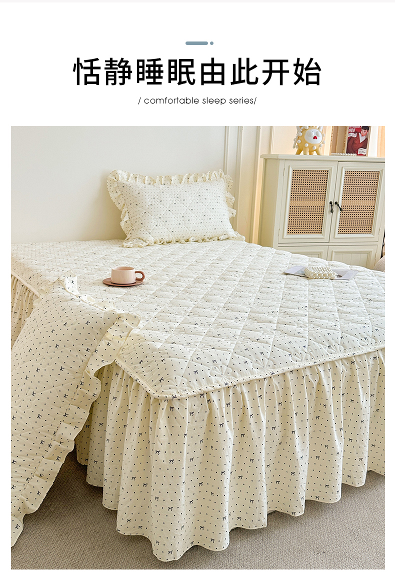 (总)十个点家纺 2025新款千鸟格磨毛绗缝夹棉纯色花边床裙三件套,经典白色,经典兰色,经典浅灰,经典浅驼,经典深灰,经典玉粉