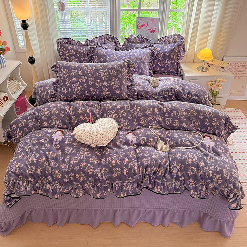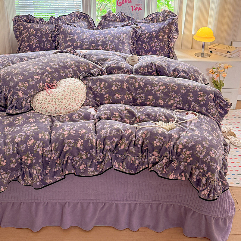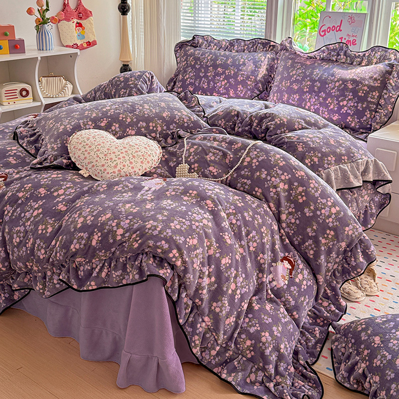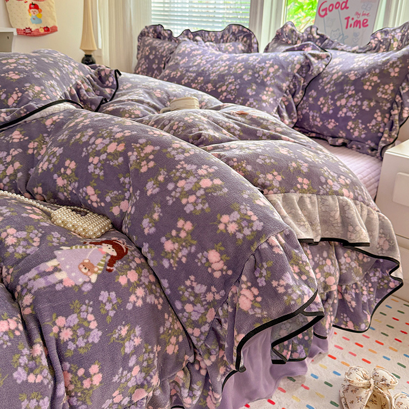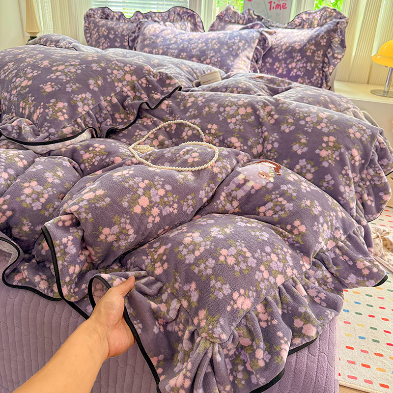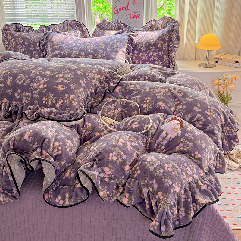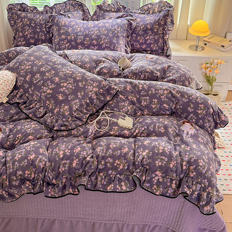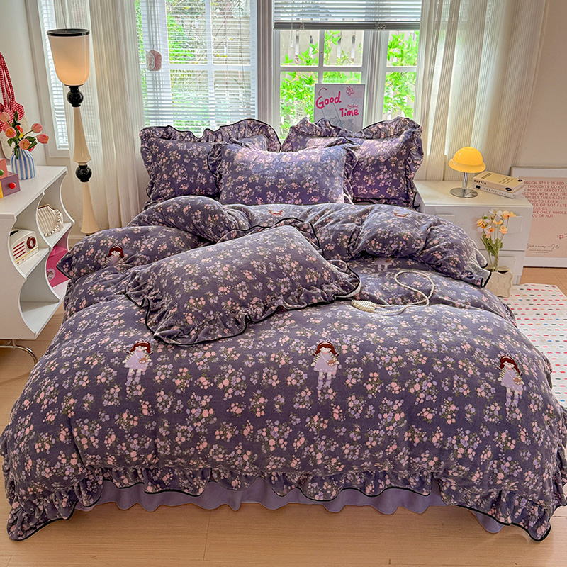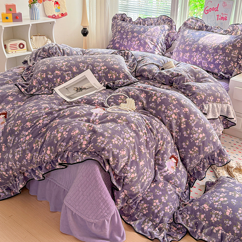 梦莱斯 2025新款加厚保暖双面牛奶绒四件套-黑色花边款 爱丽丝花园