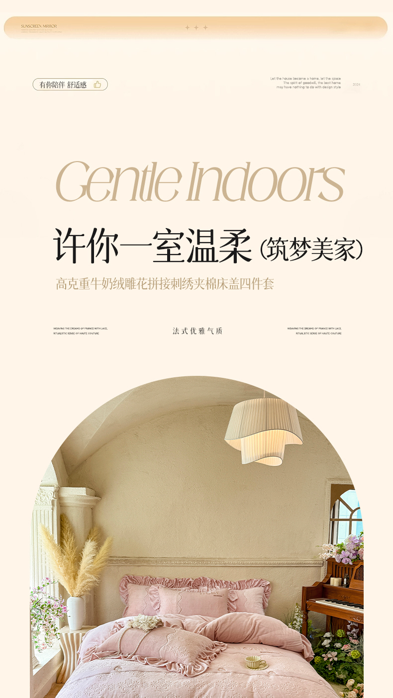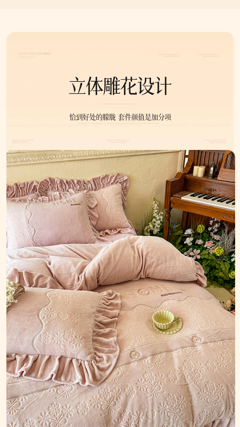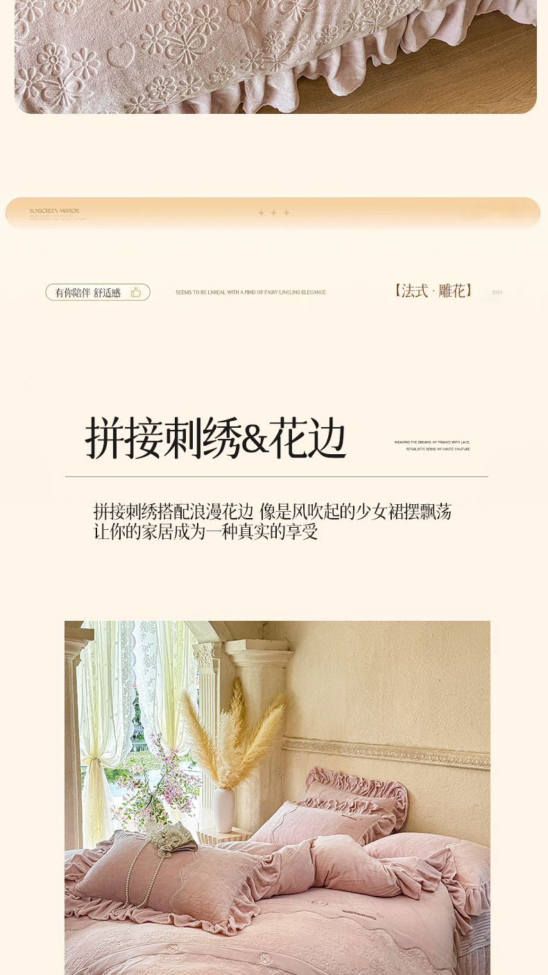 商品名称:宜凡家纺 2025新款牛奶绒雕花拼接刺绣床盖四件套 蝶恋花语