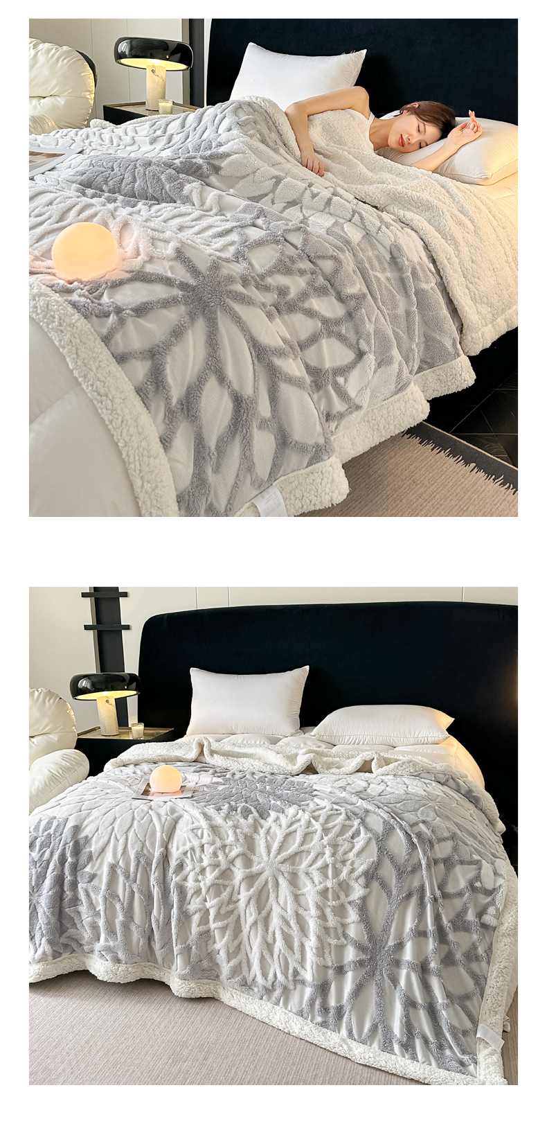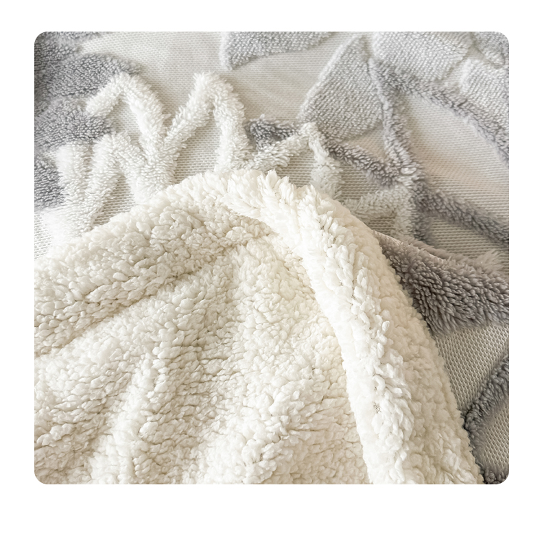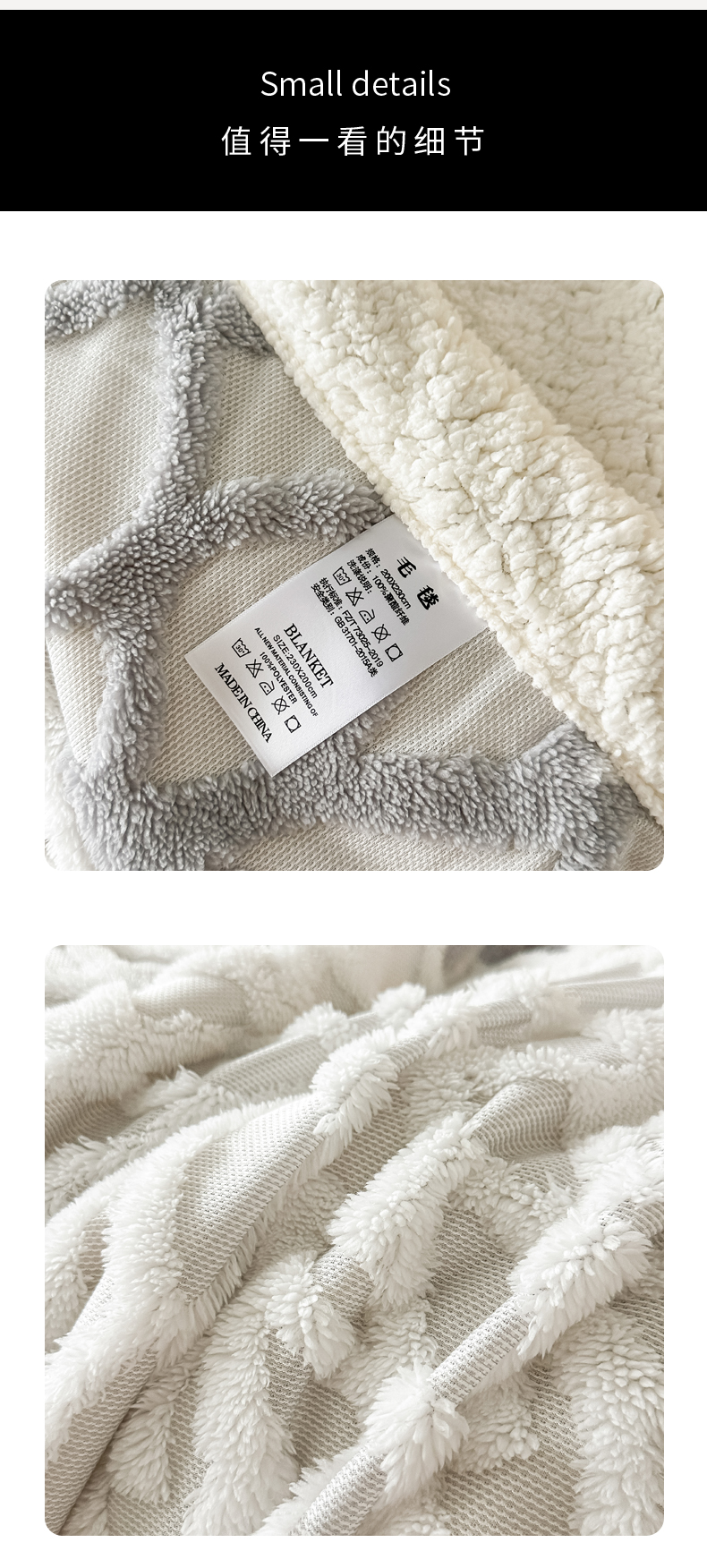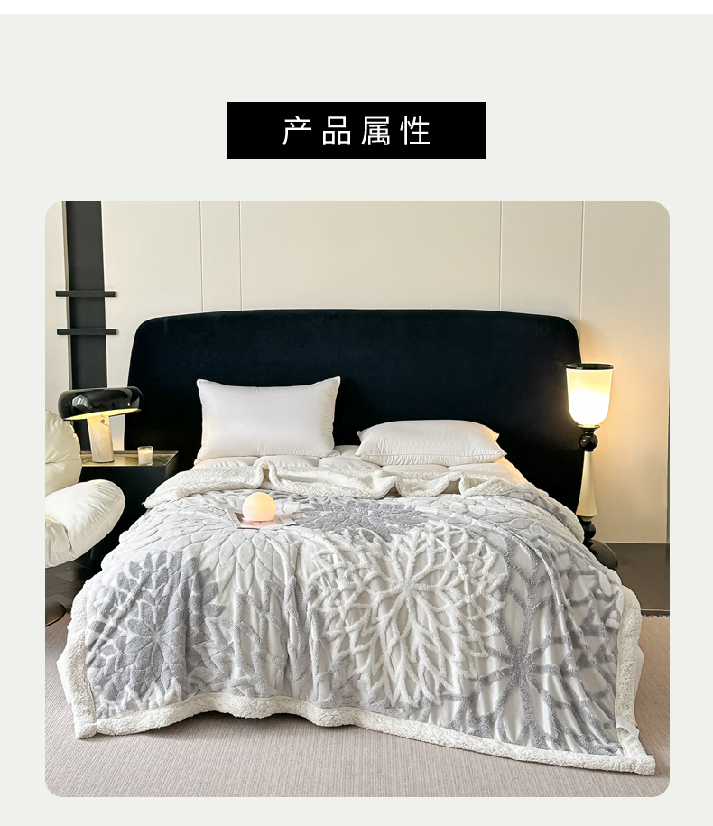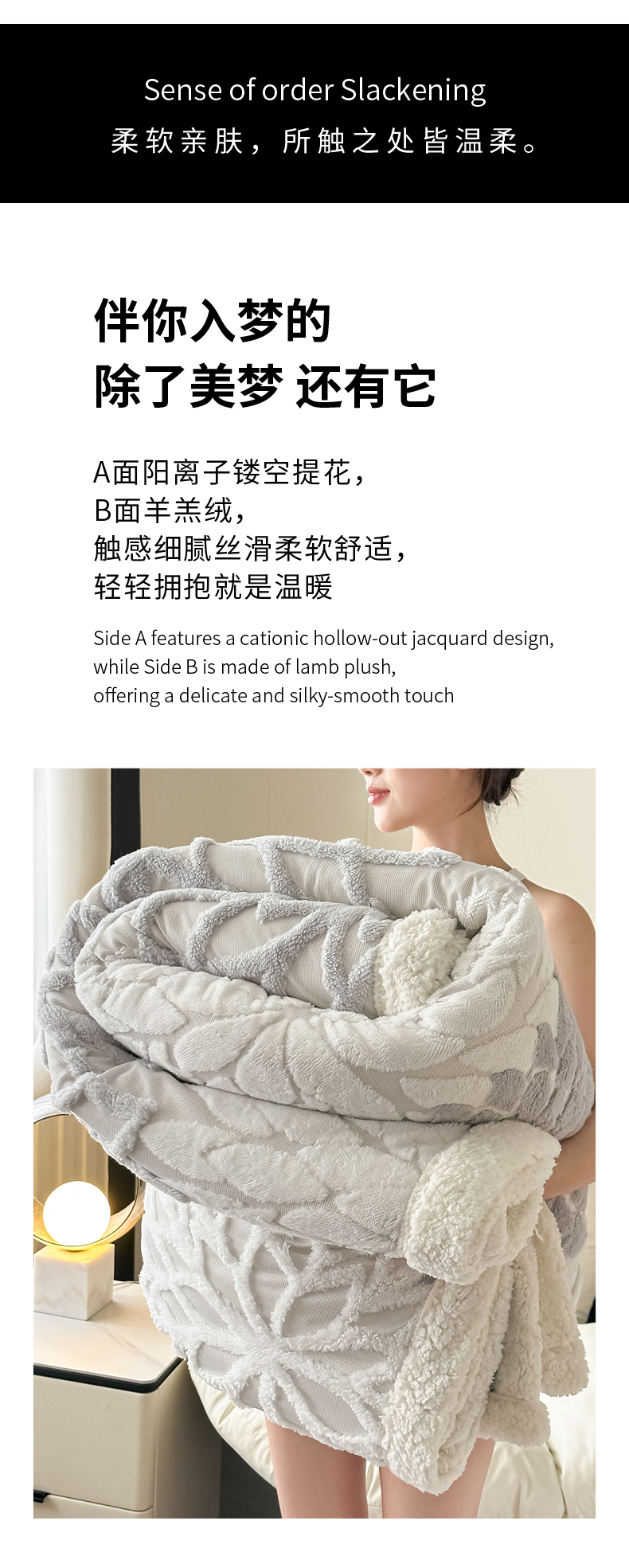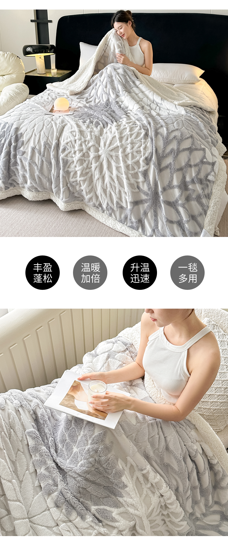 商品名称:丹本家纺 2025新款阳离子提花镂空色织多功能盖毯塔芙绒羊羔绒毛毯毯子 绽放-浅灰