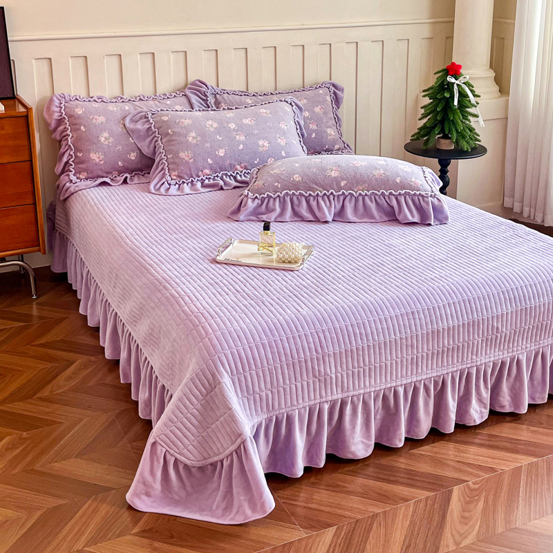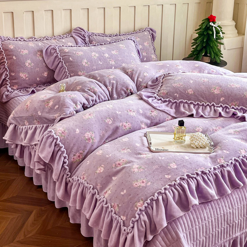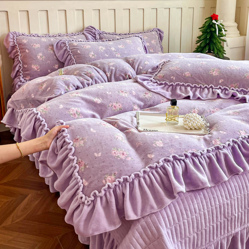 梦可莱家居 2025冬季新款复古风印花牛奶绒大花边床盖四件套 复古风紫庄园