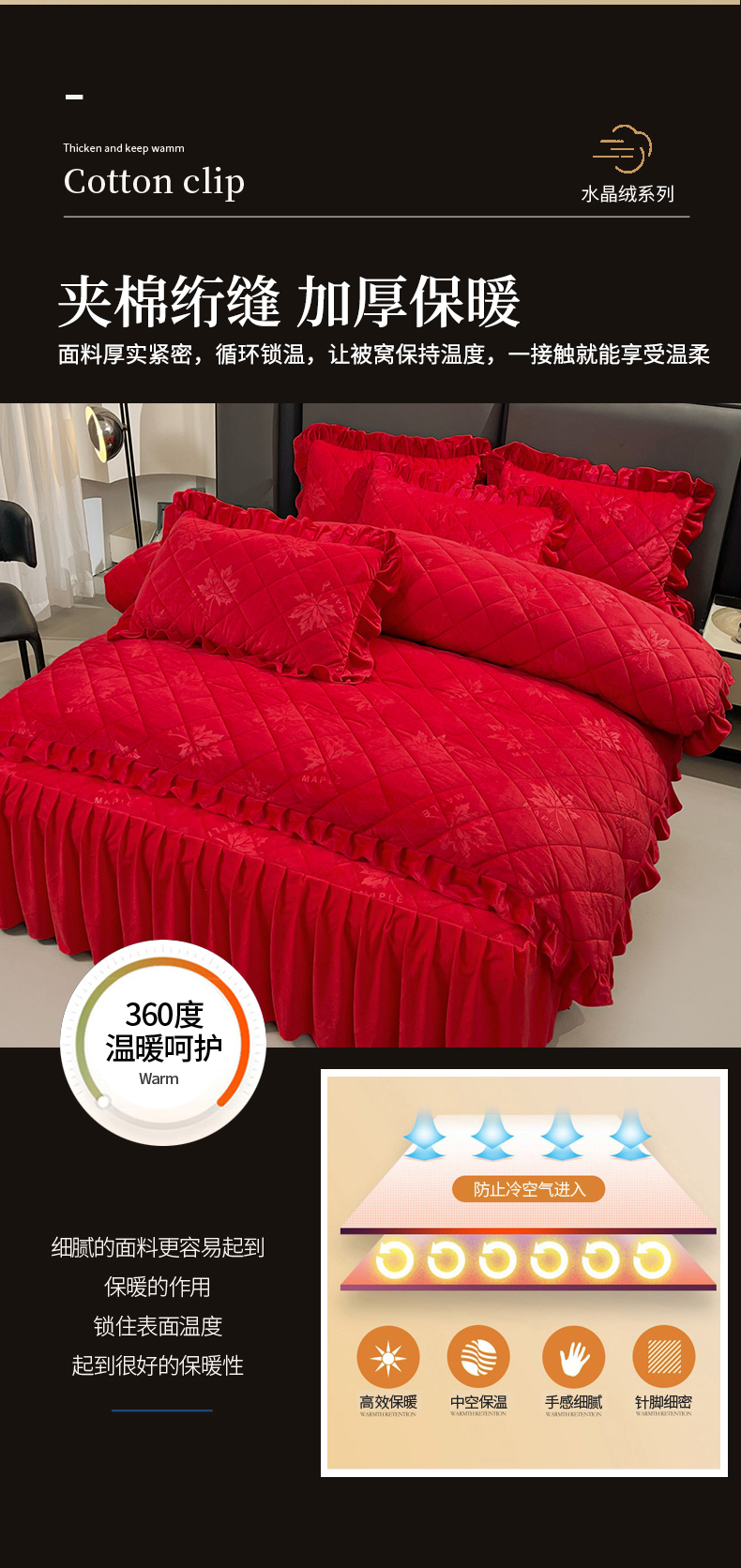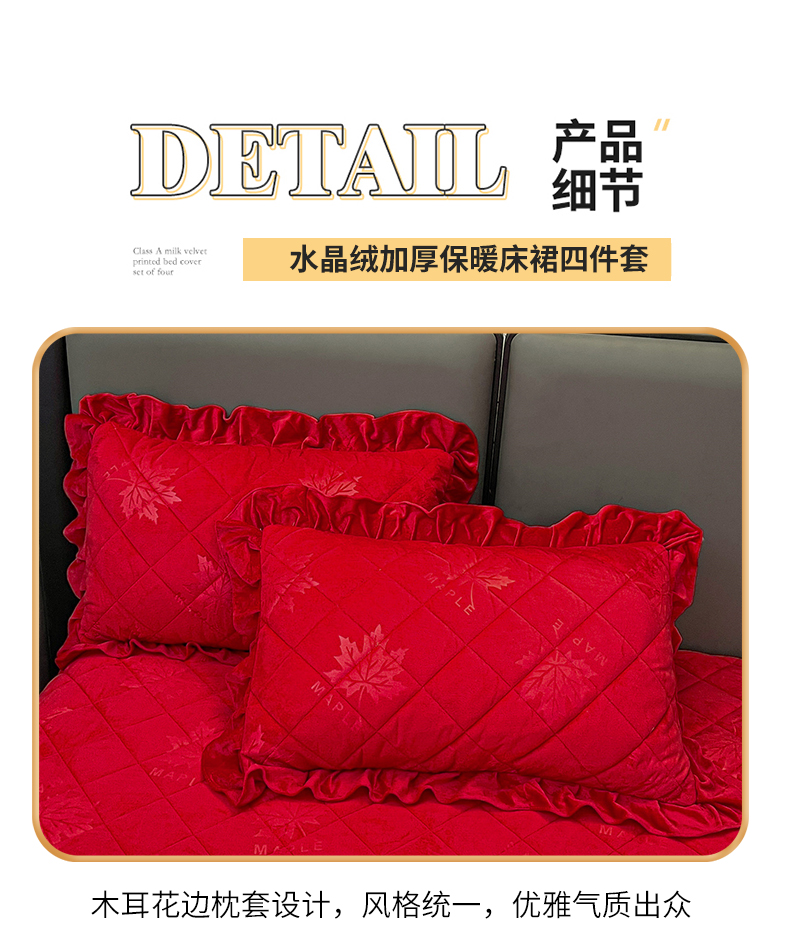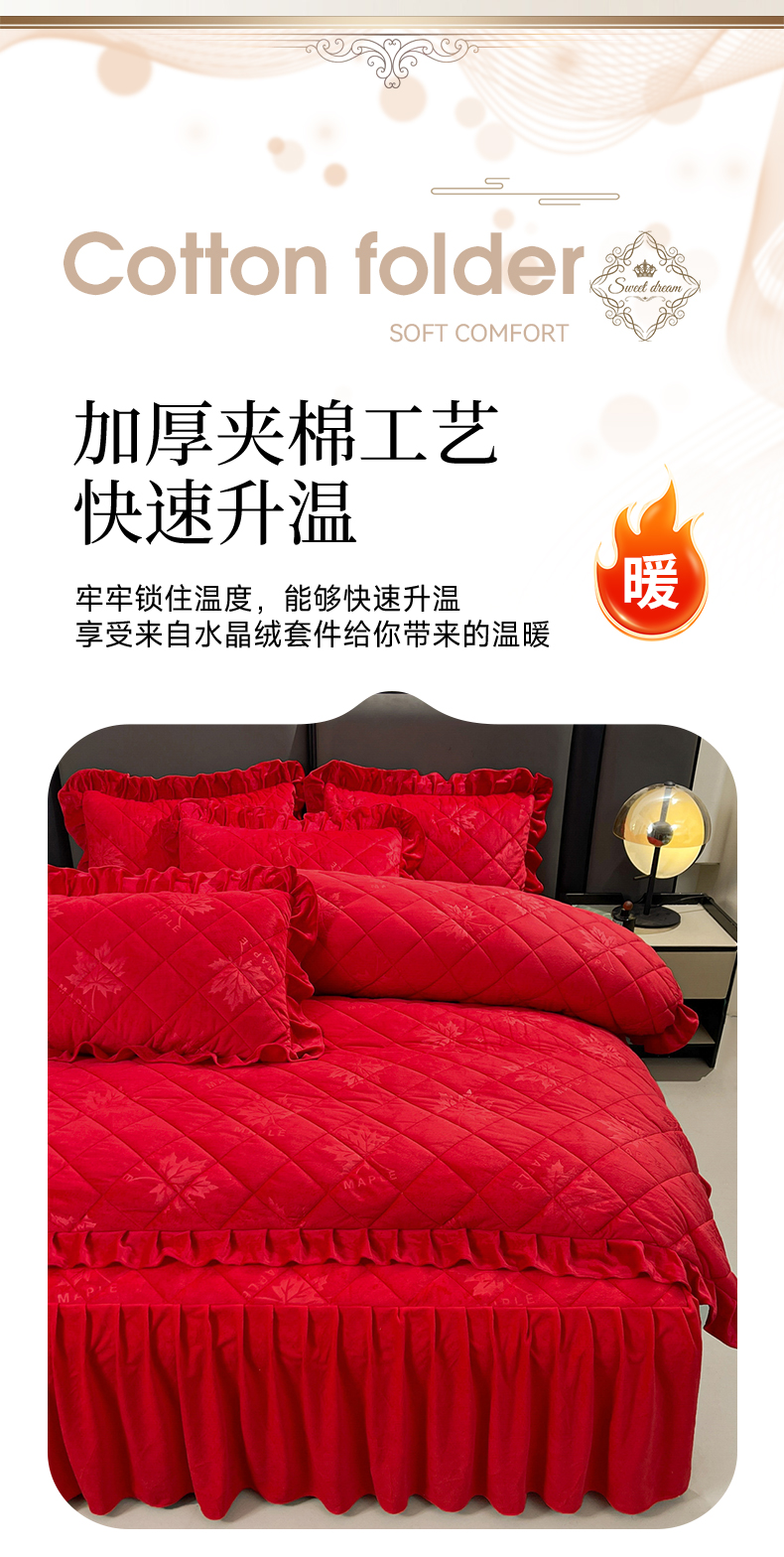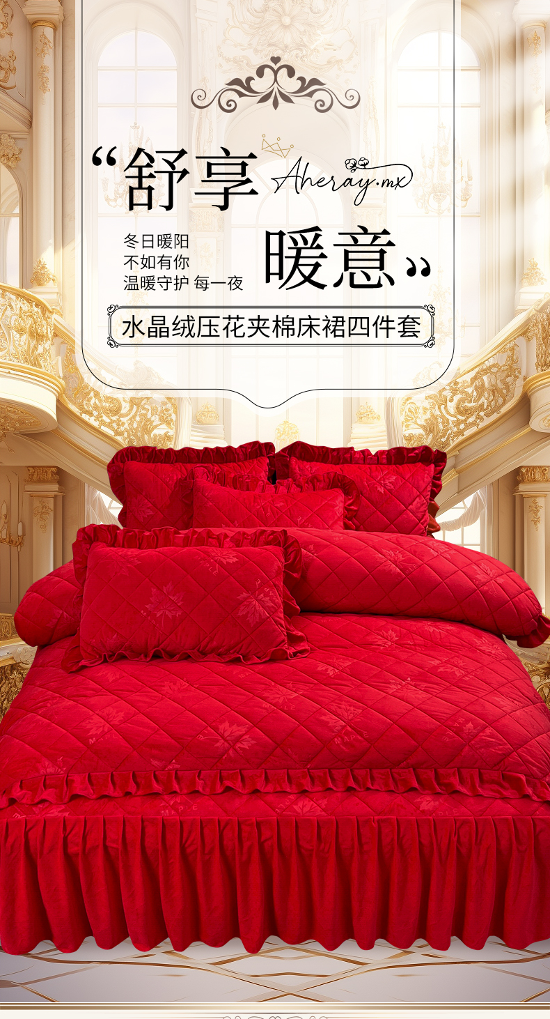 当前位置: 91家纺网 > 商品网购 > 床品套件 > 四件套 > 水晶绒四件套 > 屹成家纺 2025新款压花水晶绒床裙四件套 (四件套不低于210元起) 大红