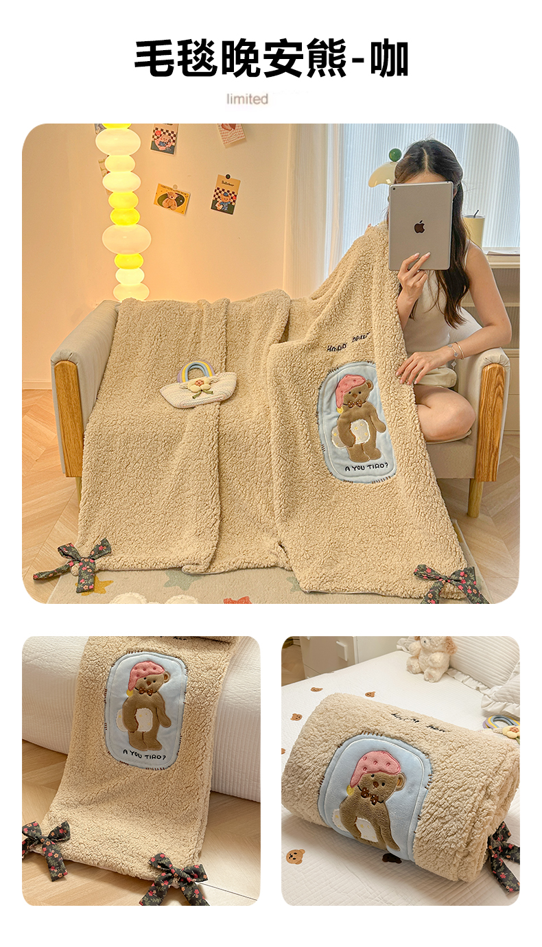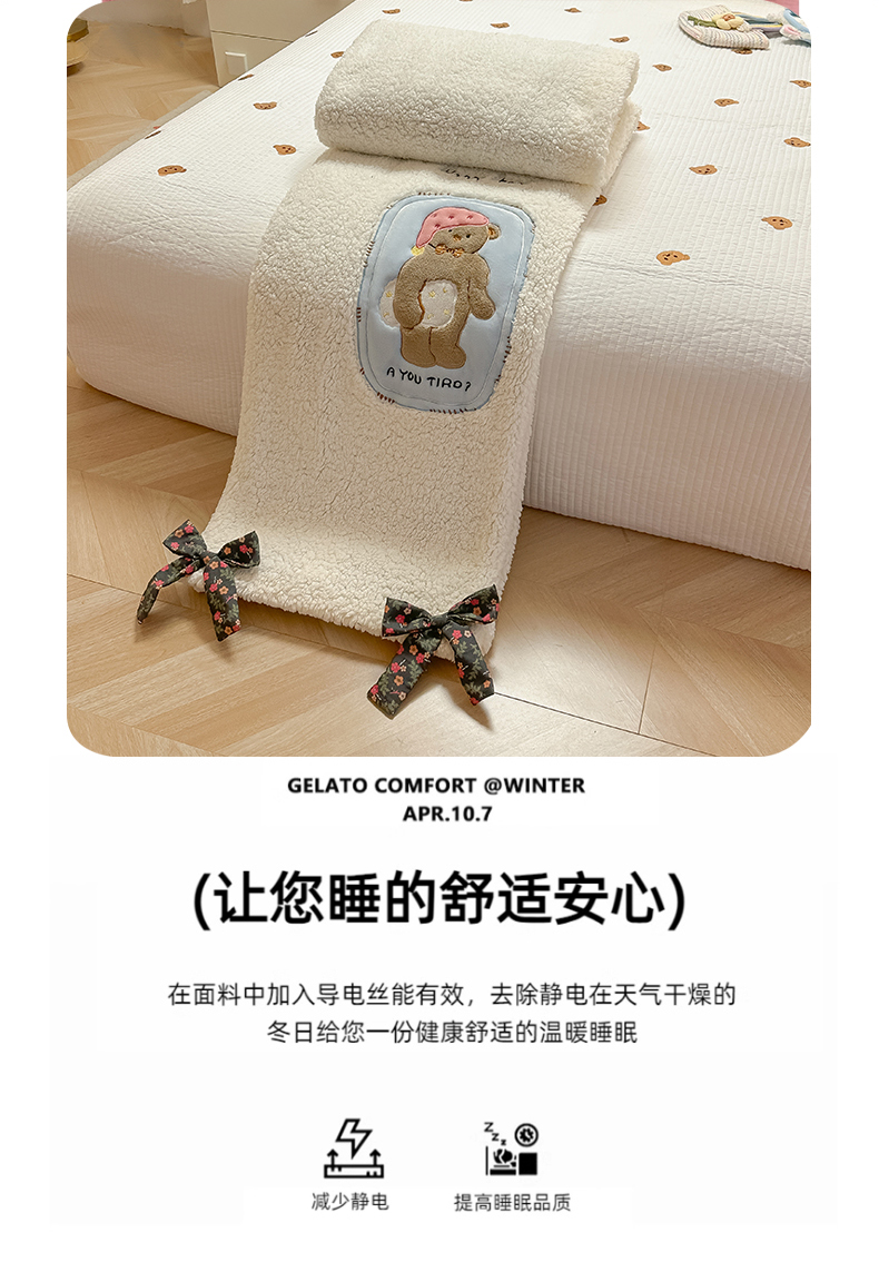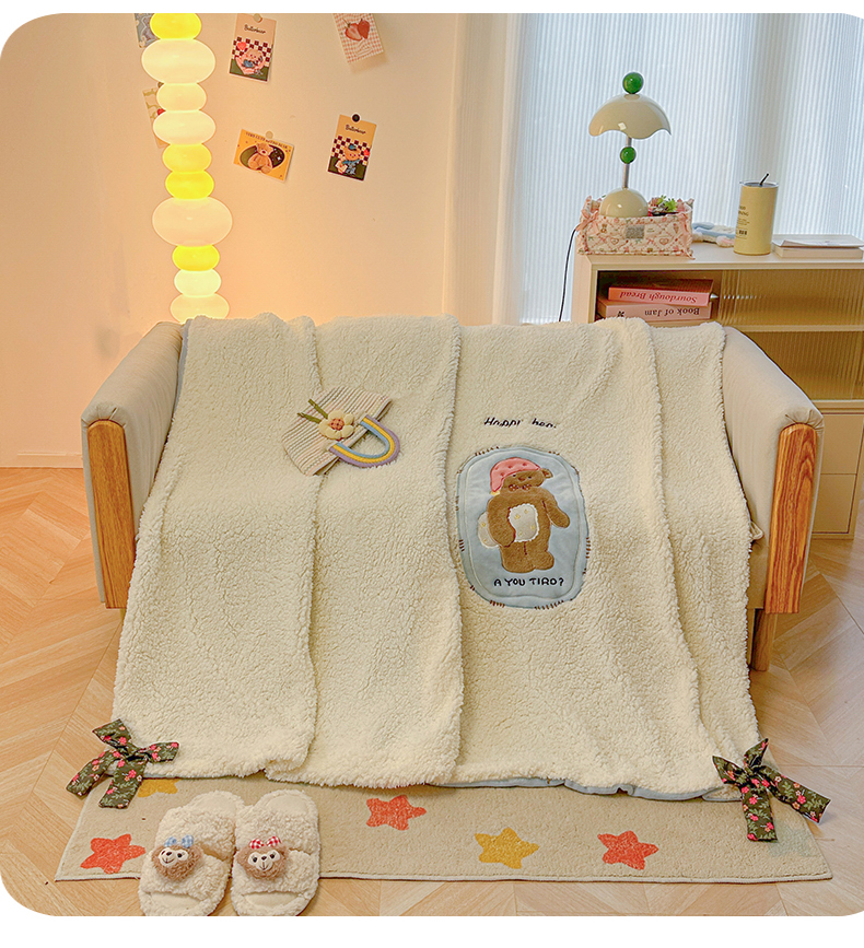 子钦家纺 2025新款羊羔绒牛奶绒卡通贴布绣多功能盖毯单被套(第二波) 晚安熊-奶油白