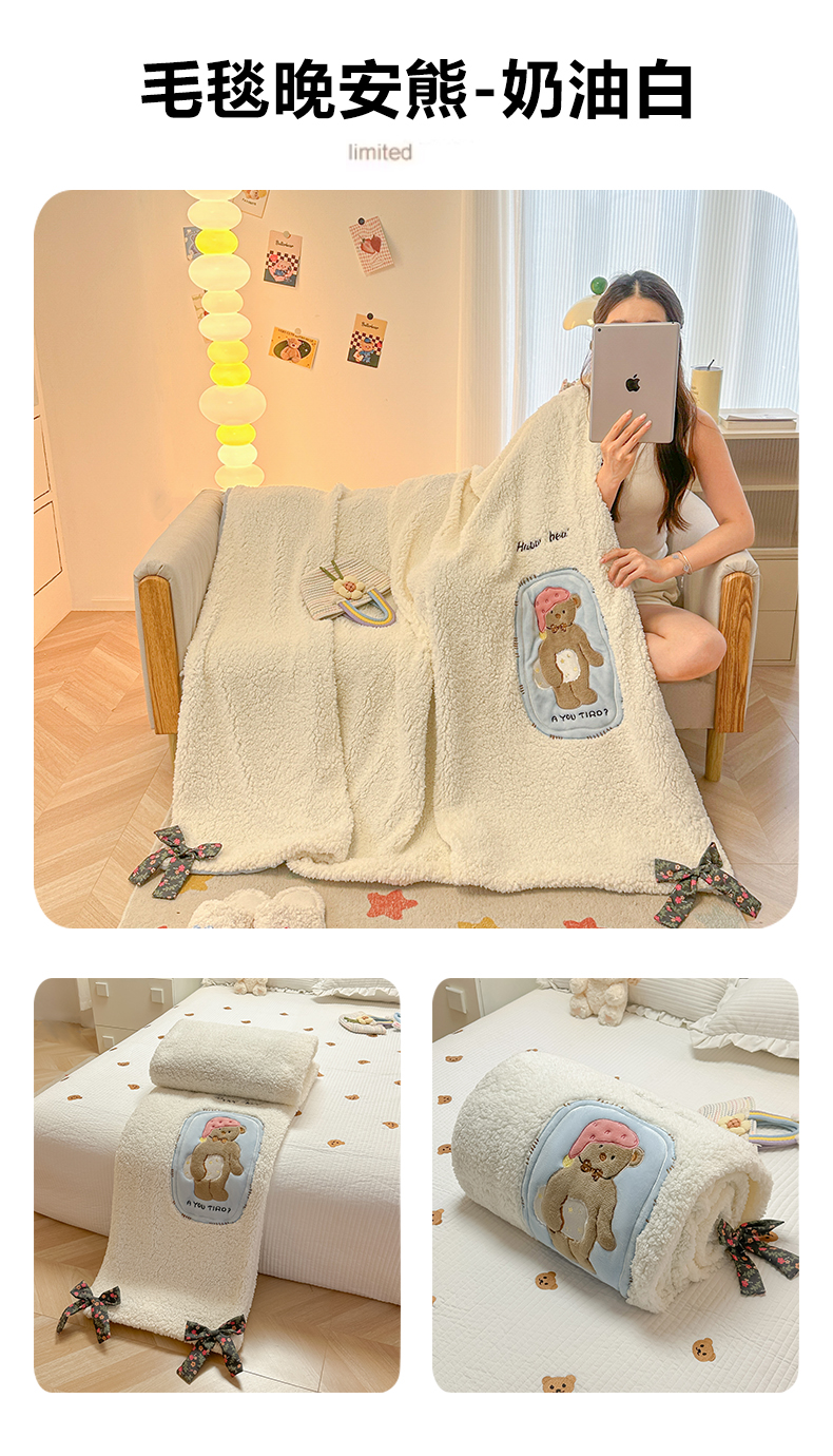 商品名称:子钦家纺 2025新款羊羔绒牛奶绒卡通贴布绣多功能盖毯单被套(第二波) 晚安熊-奶油白