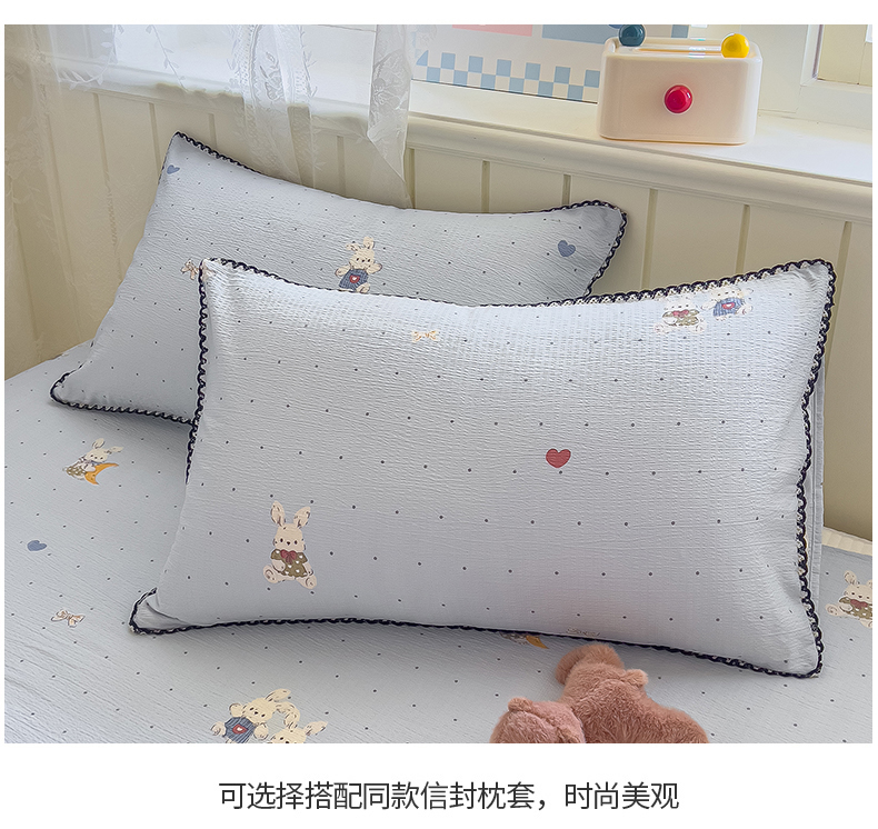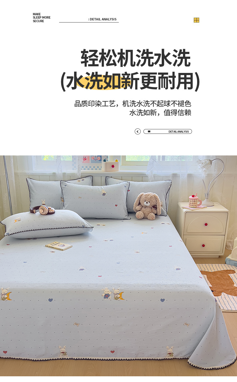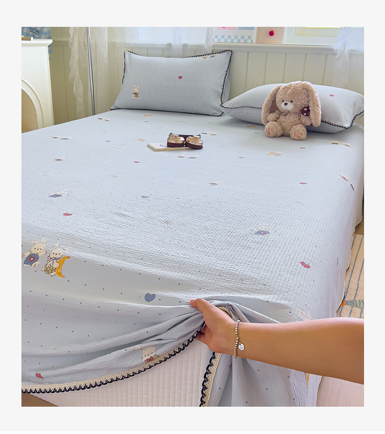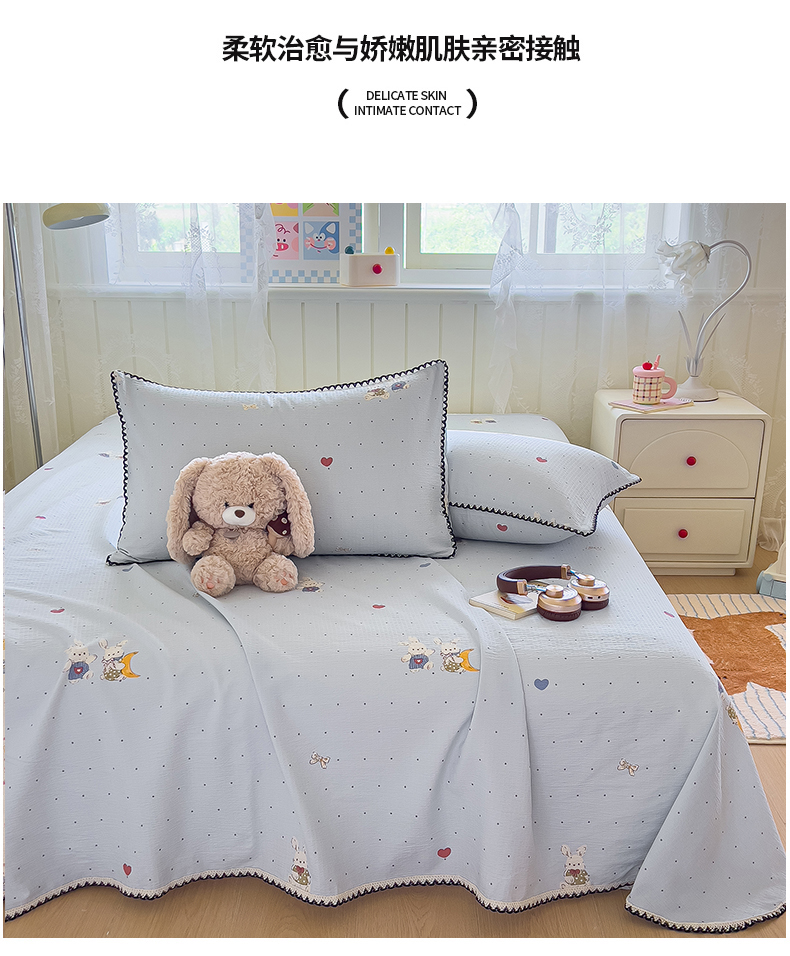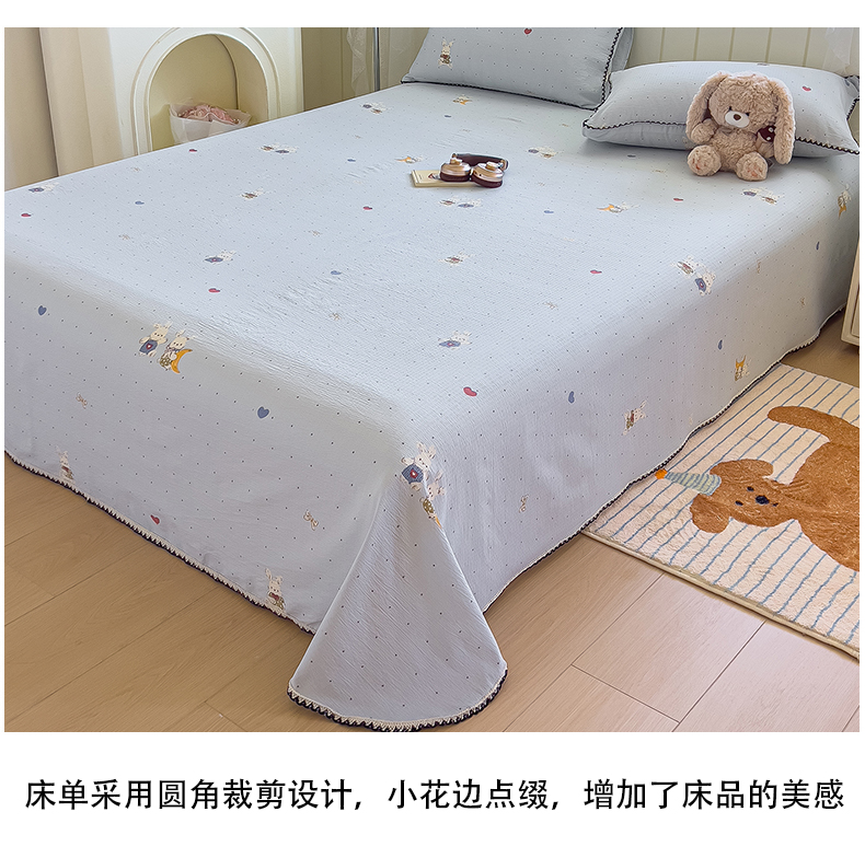 三盛源 2025新款韩版碎花皱皱双层纱镂空花边水洗棉单床单床单单件 波点兔-蓝