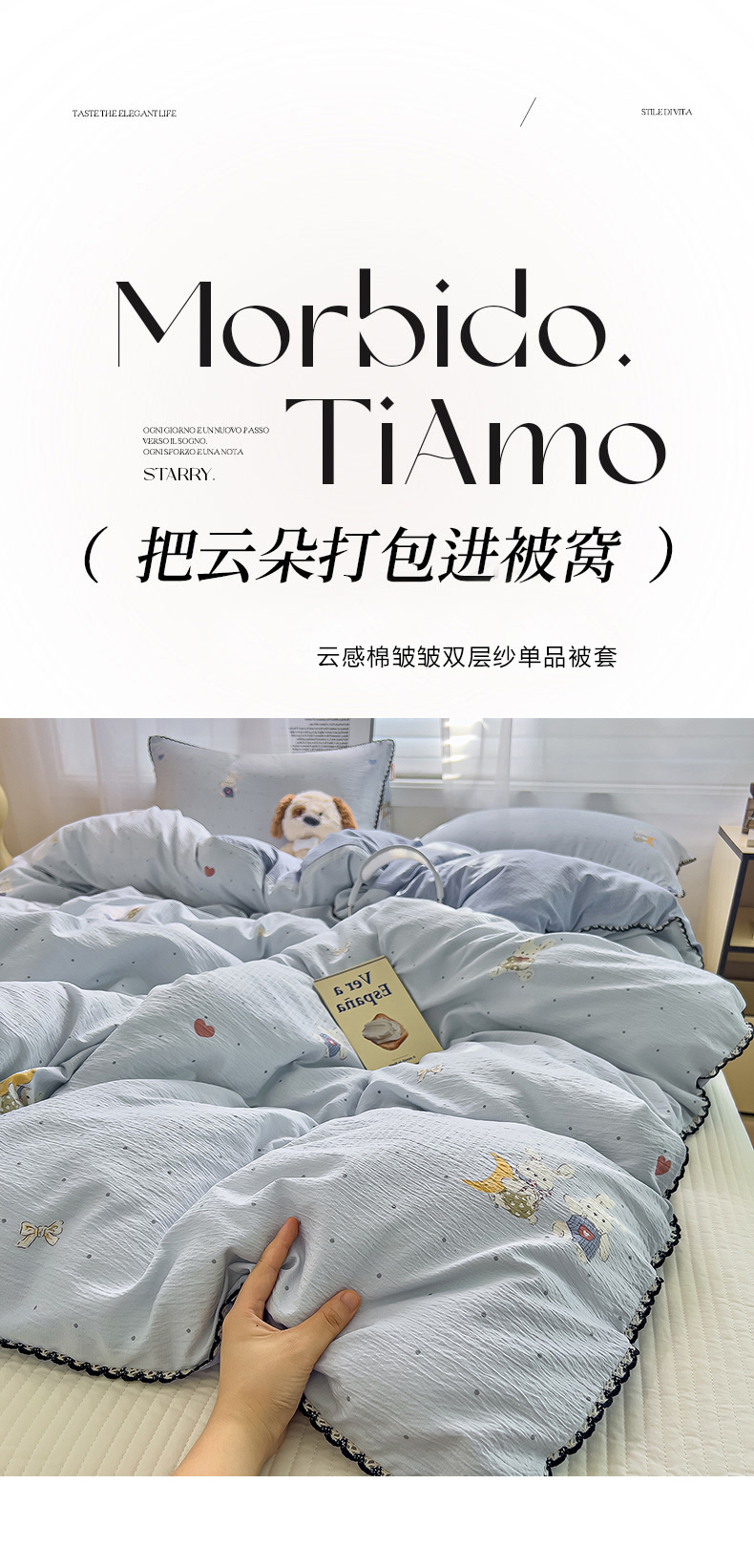 (总)三盛源 2025新款韩系小花卉镂空花边超柔皱皱双层纱水洗棉单被套被套单件,绿野,萌趣小窝,奶油星点,泡芙小狗,桃粉,絮语,紫萝漫想,紫米樱桃