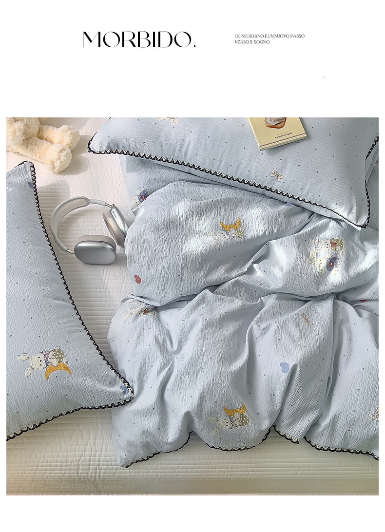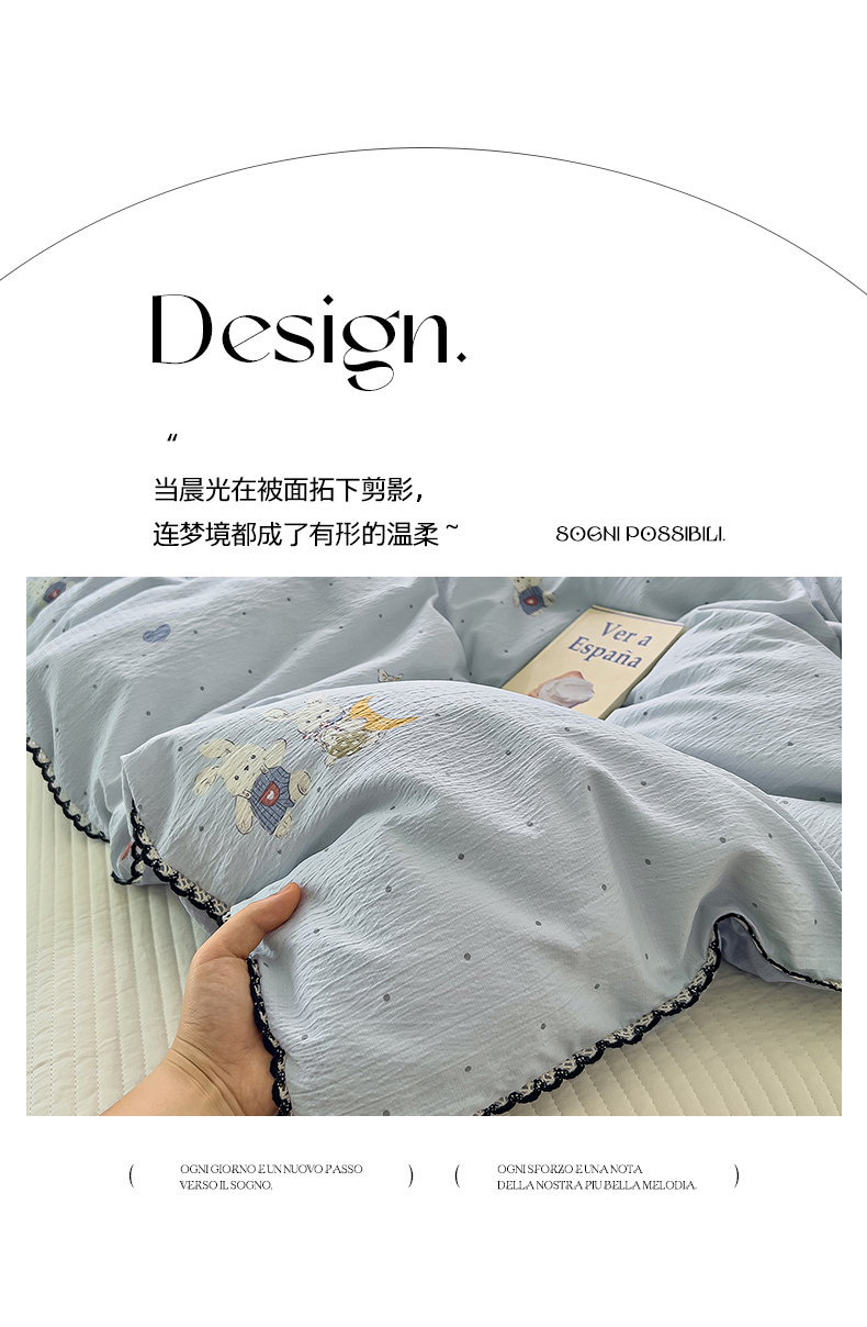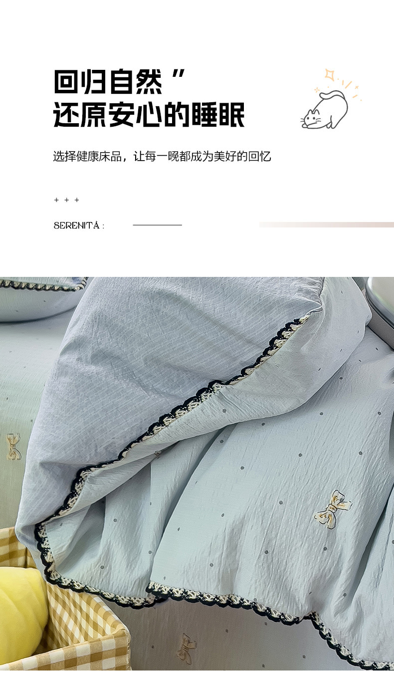 • 91家纺网 家纺一手货源 找家纺 三盛源 2025新款韩系小花卉镂空花边超柔皱皱双层纱水洗棉单被套被套单件 萌趣小窝