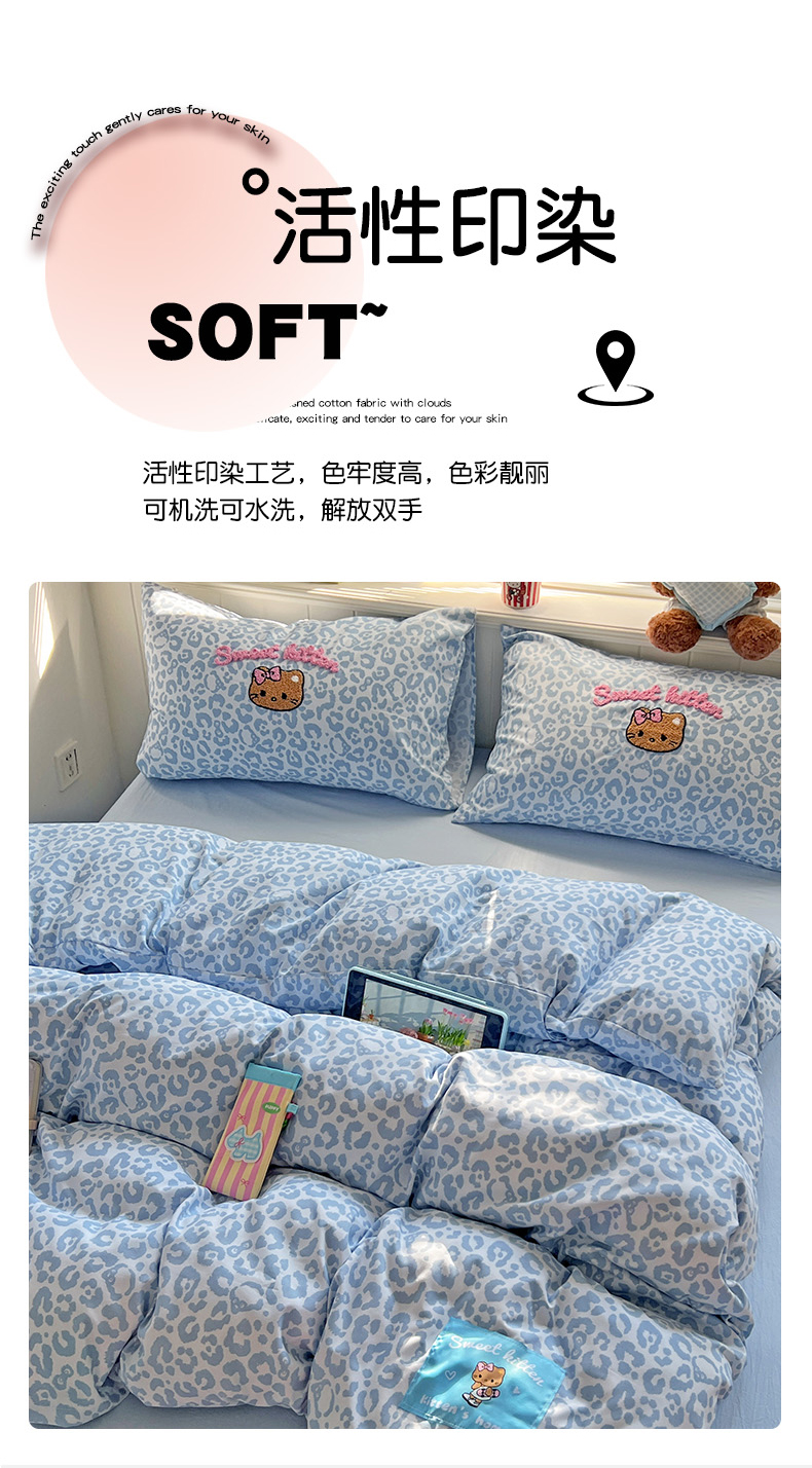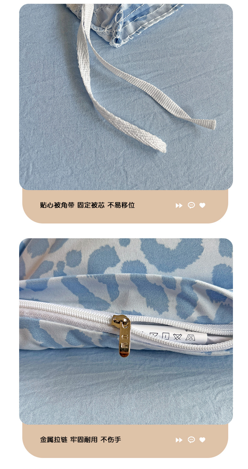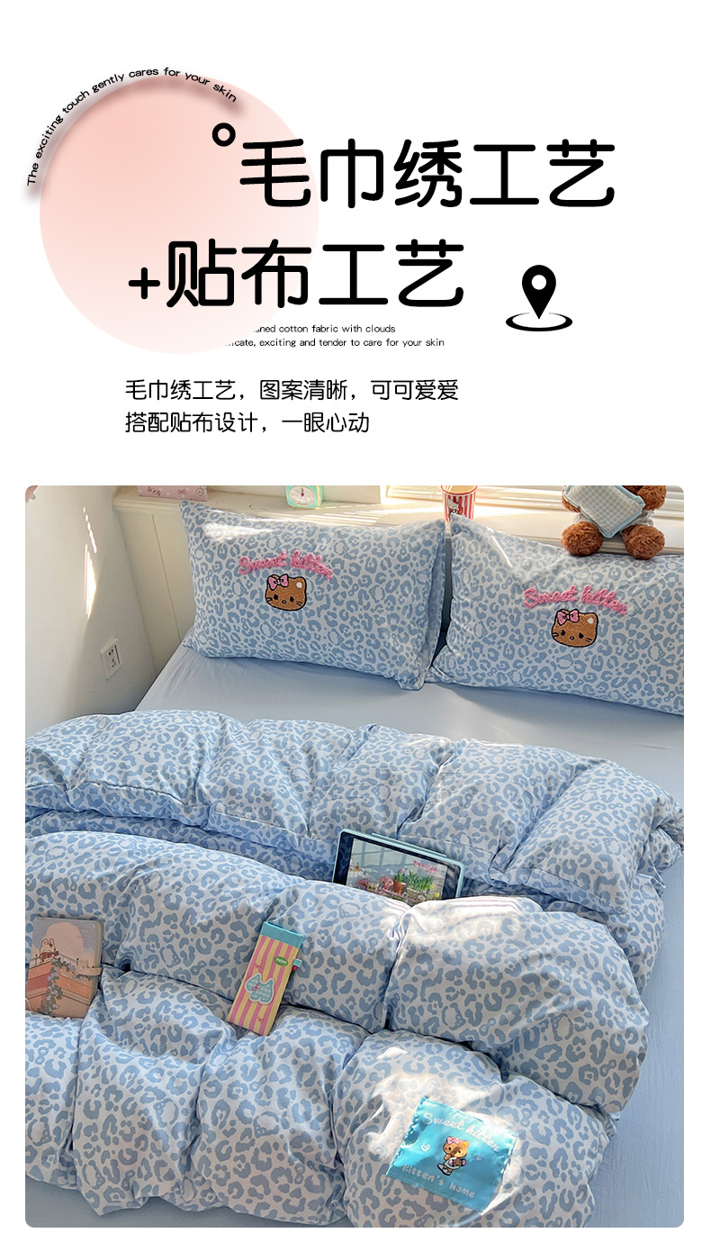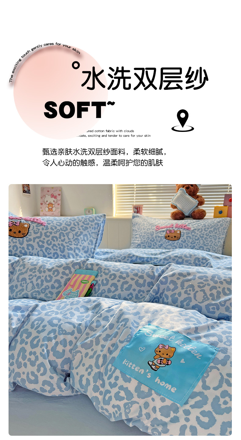 当前位置: 91家纺网 > 商品网购 > 床品套件 > 四件套 > 双层纱四件套 > 童颜 2025新款超柔水洗双层纱豹纹贴布绣印花四件套 豹纹猫咪浅蓝