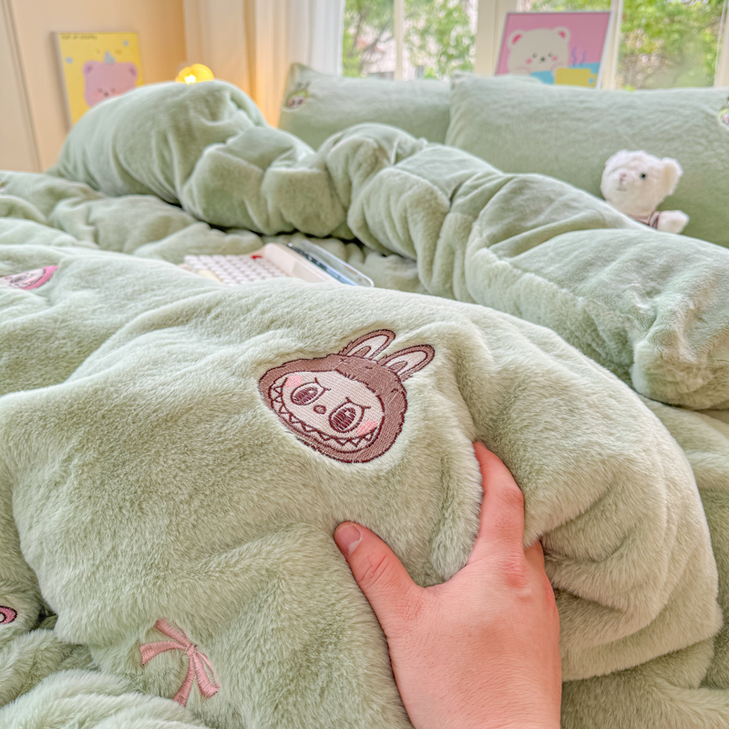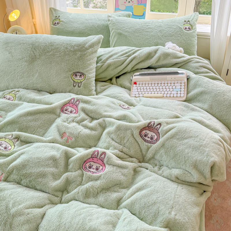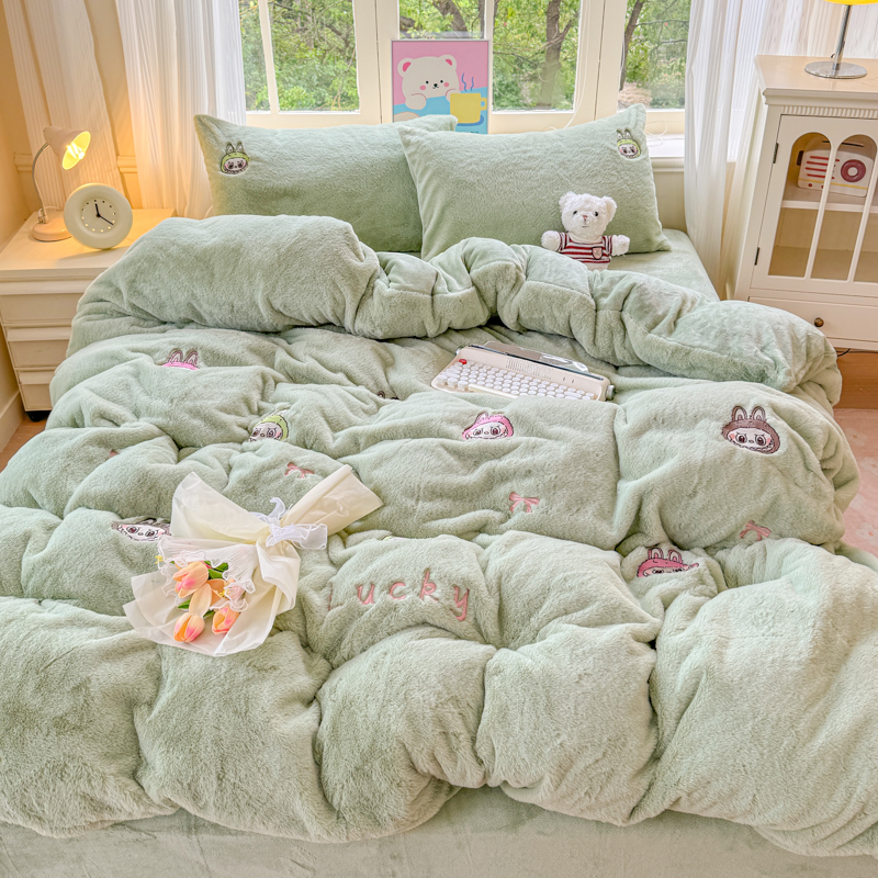 商品名称:云木里 2025新款兔绒卡通刺绣手工四件套 兔绒 拉布布-绿