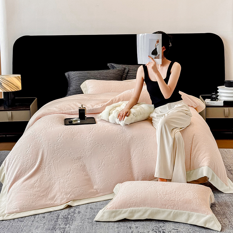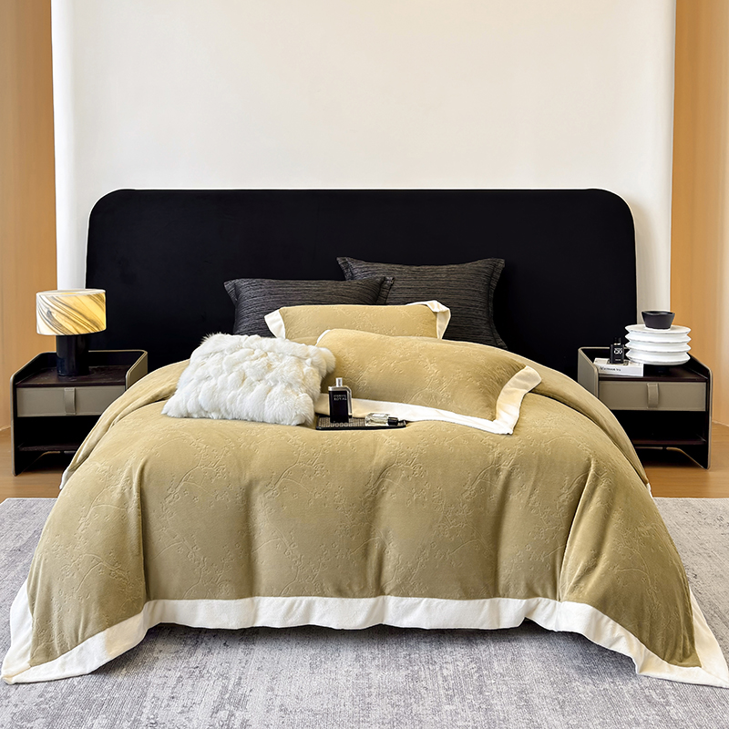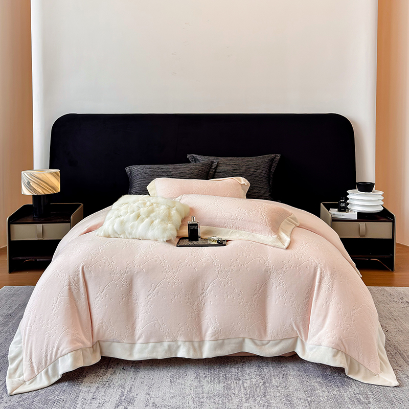 商品名称:若未家居 LOVEWE HOUSE 2025新款250克高克重全消光雕花牛奶绒拼角工艺款四件套-桃林春晓 桃林春晓-咸菜绿