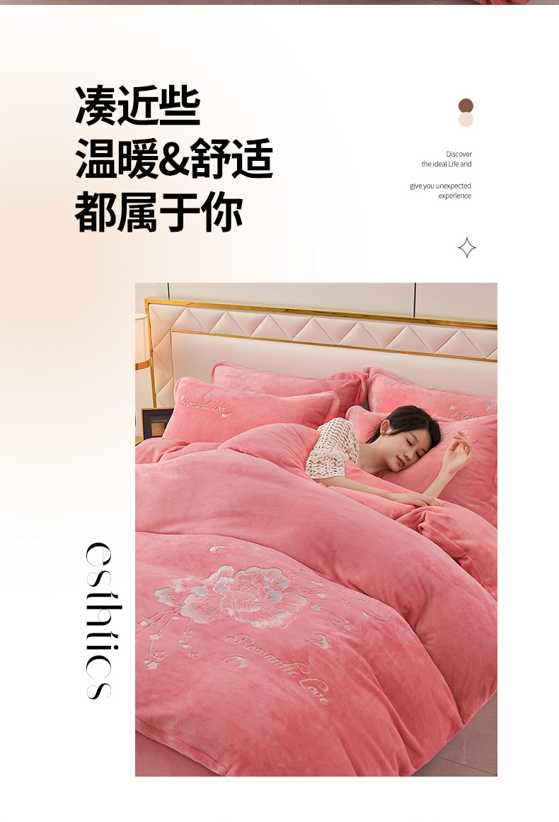 绒小宣 2025新款高克重牛奶绒刺绣四件套 花开富贵-粉,花开富贵-粉