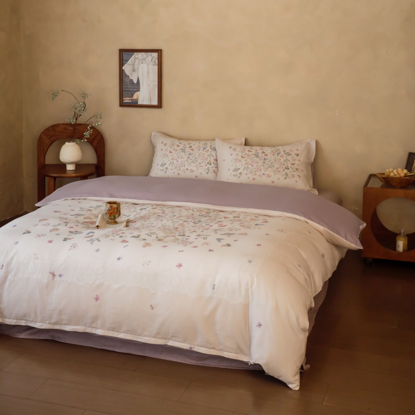 (总)窝米 2025新款数码印花100支长绒棉纯棉工艺花边款四件套-晚意,晚意
