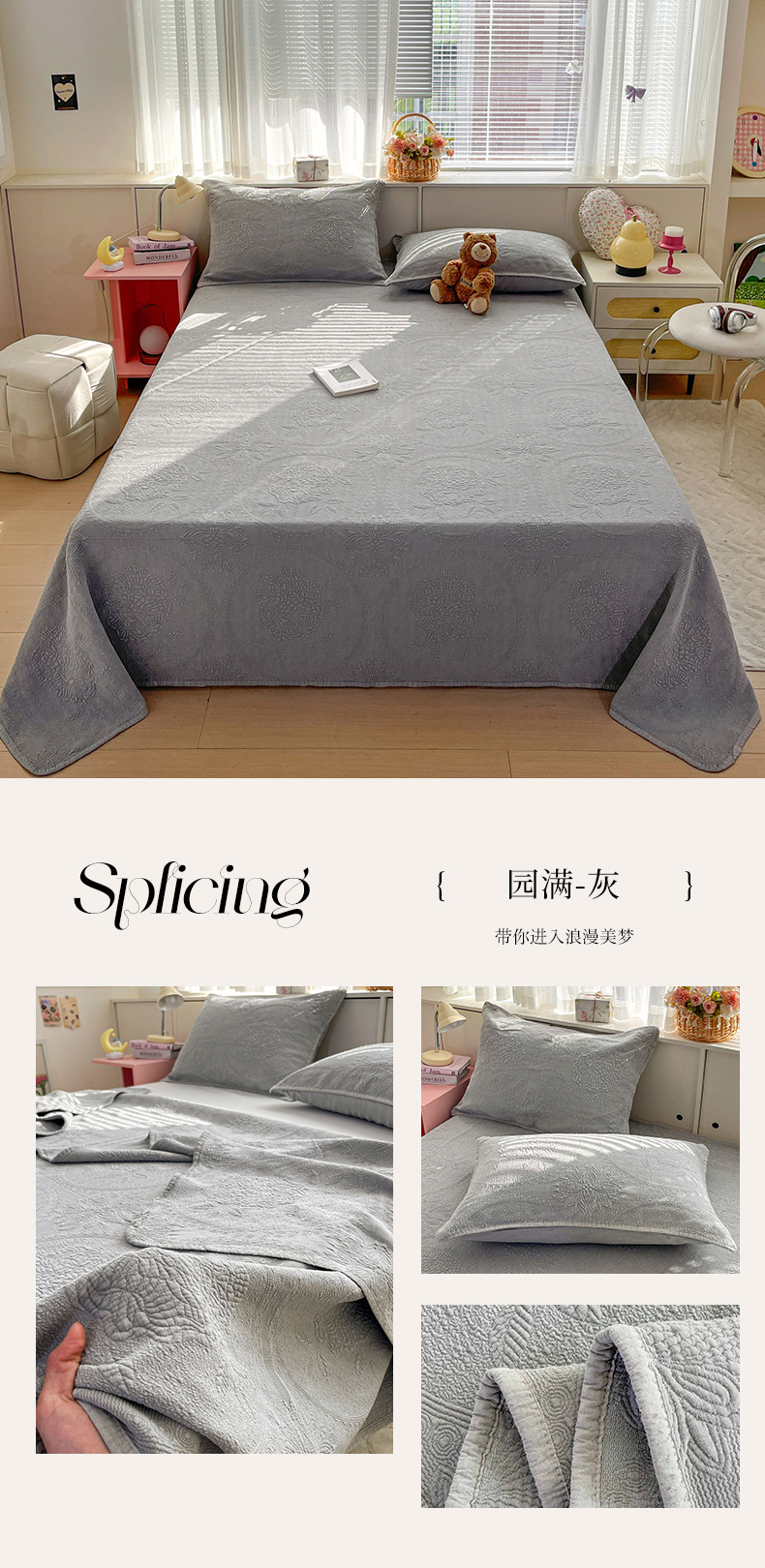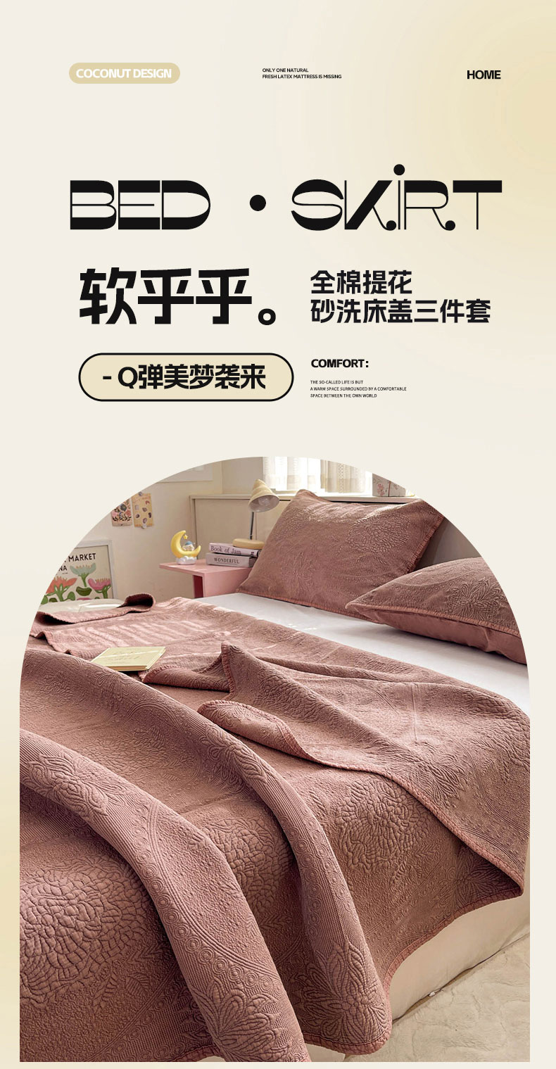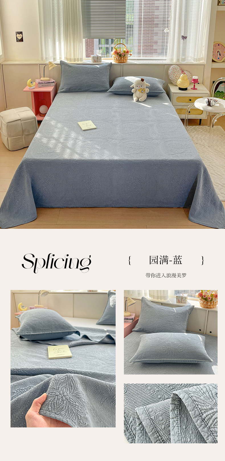 (总)源舜家纺 2025新款色织棉简约韩系花边床盖三件套,简约灰,简约粉,简约绿,简约驼,简约蓝