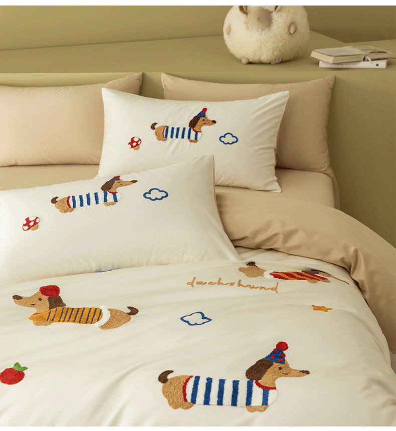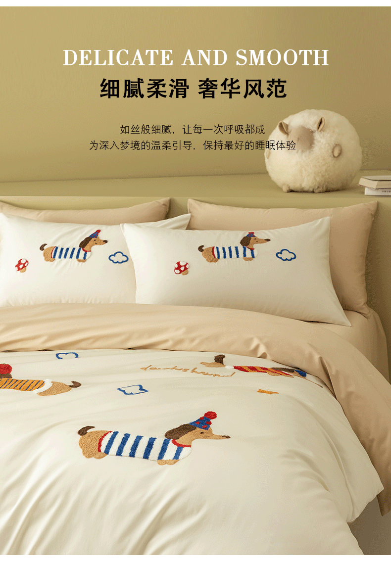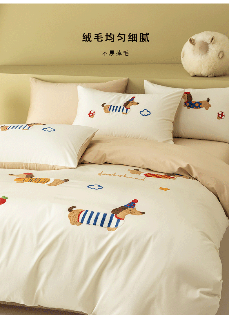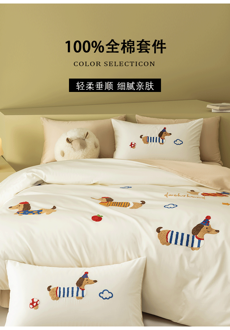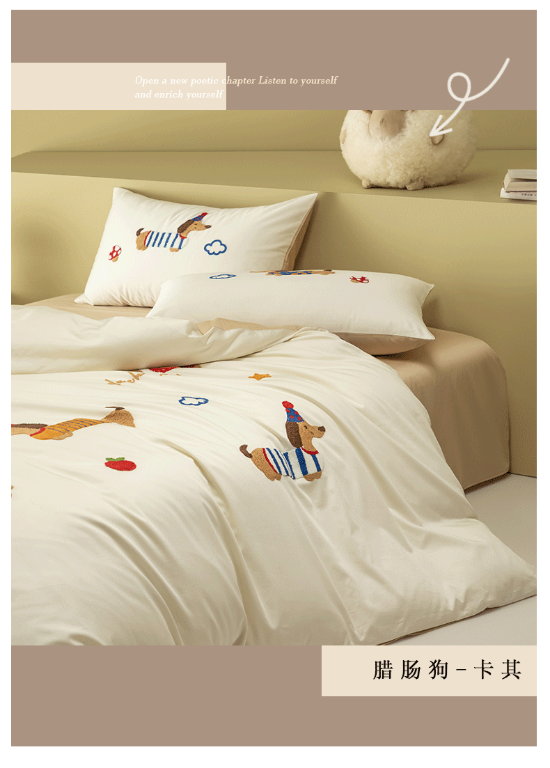 当前位置: 91家纺网 > 商品网购 > 床品套件 > 四件套 > 全棉普通四件套 > 618家纺 2026新款A类100支全棉纯棉毛巾绣花四件套-腊肠狗系列 腊肠狗-卡其
