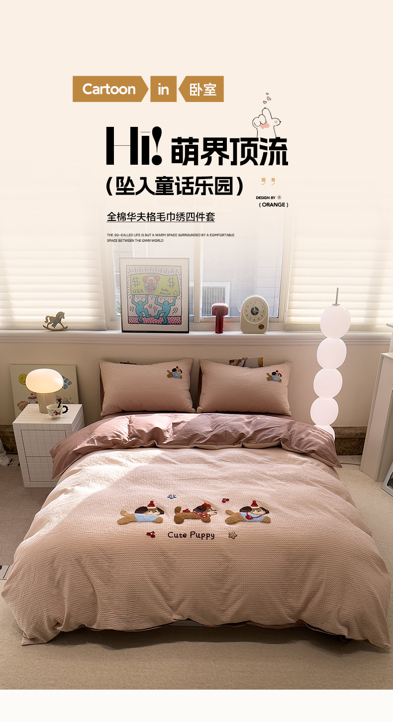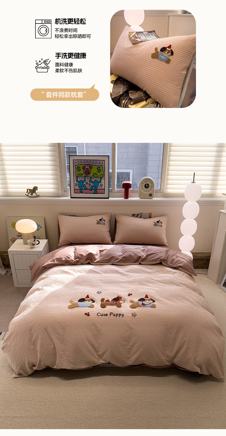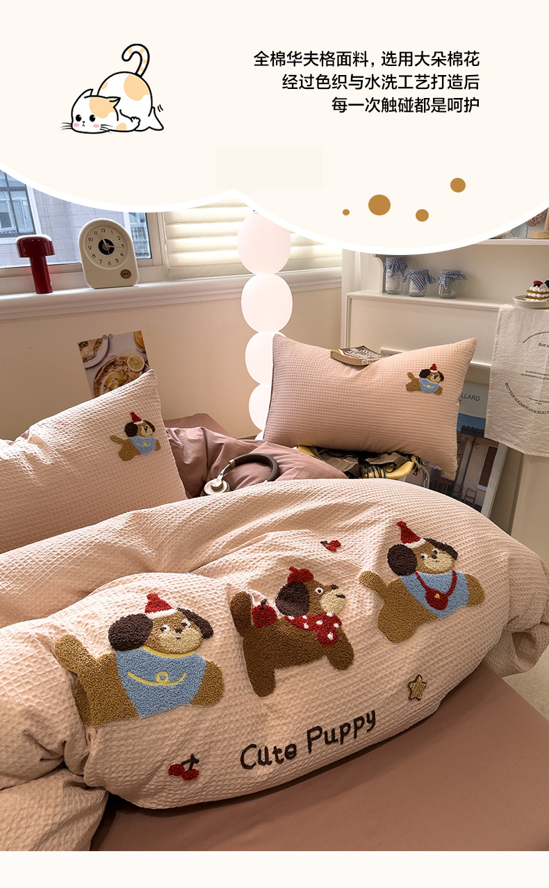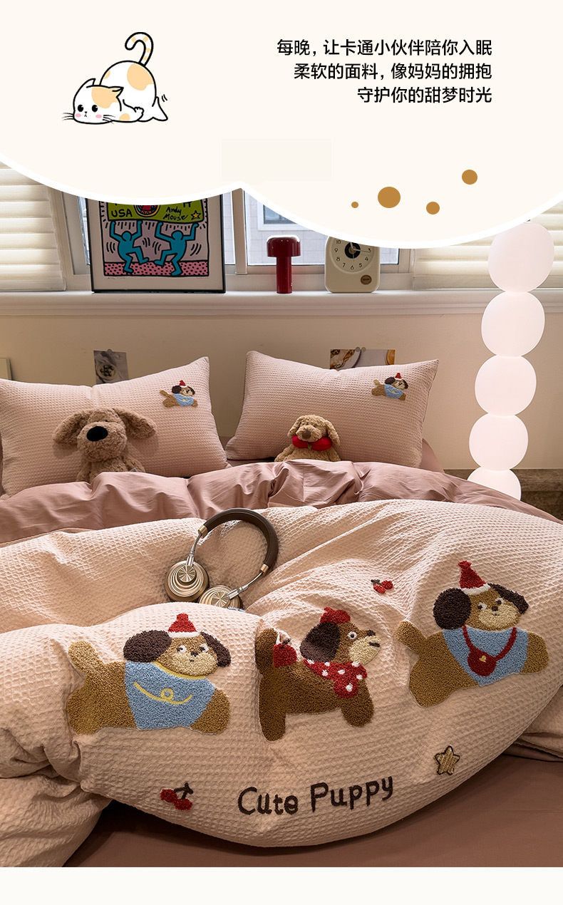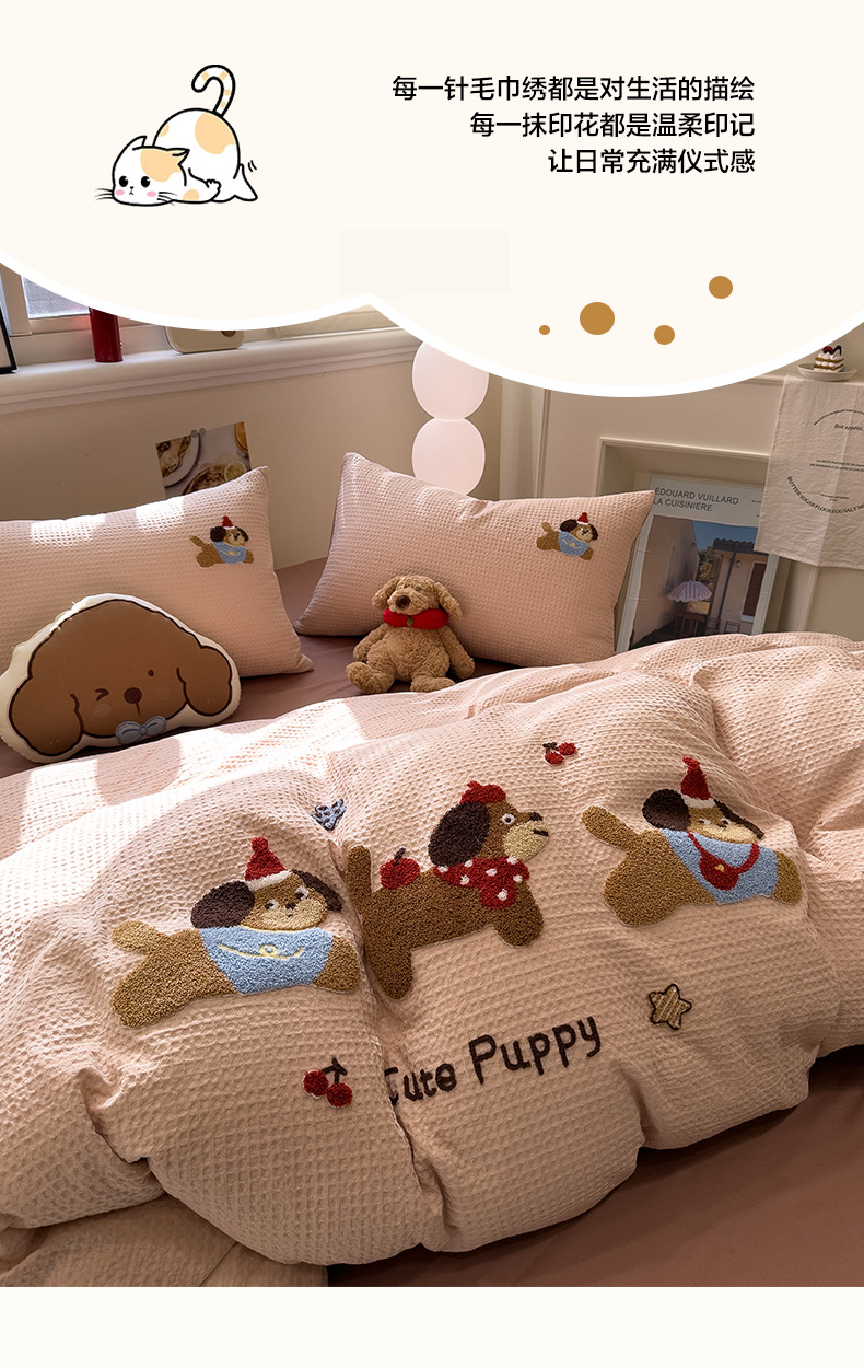 当前位置: 91家纺网 > 商品网购 > 床品套件 > 四件套 > 全棉普通四件套 > 雅居纺家纺 2026新款全棉华夫格毛巾绣四件套 米驼腊肠狗