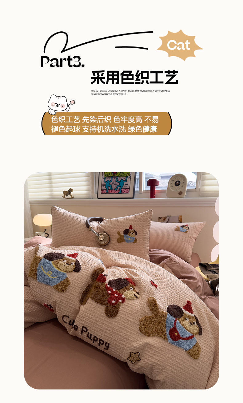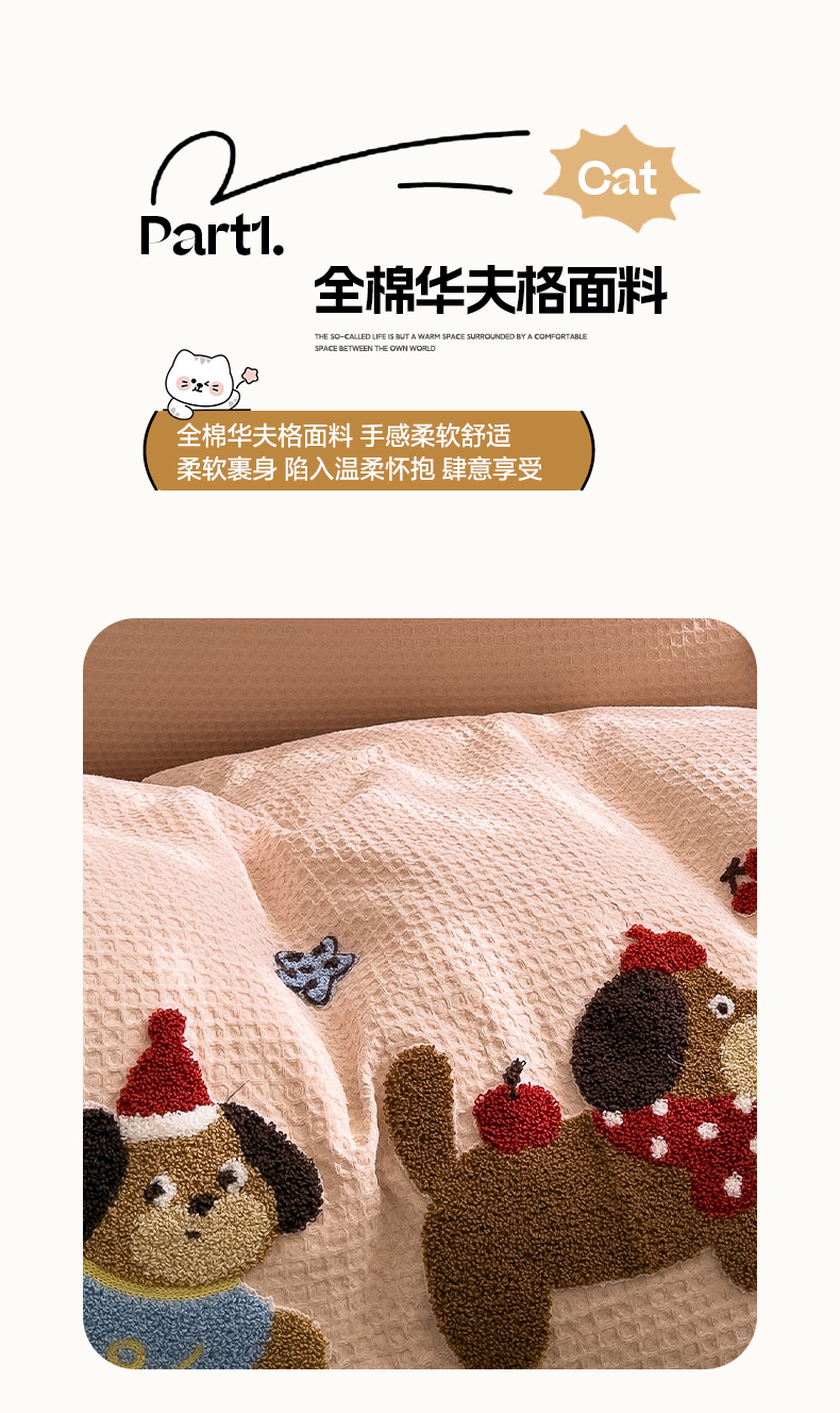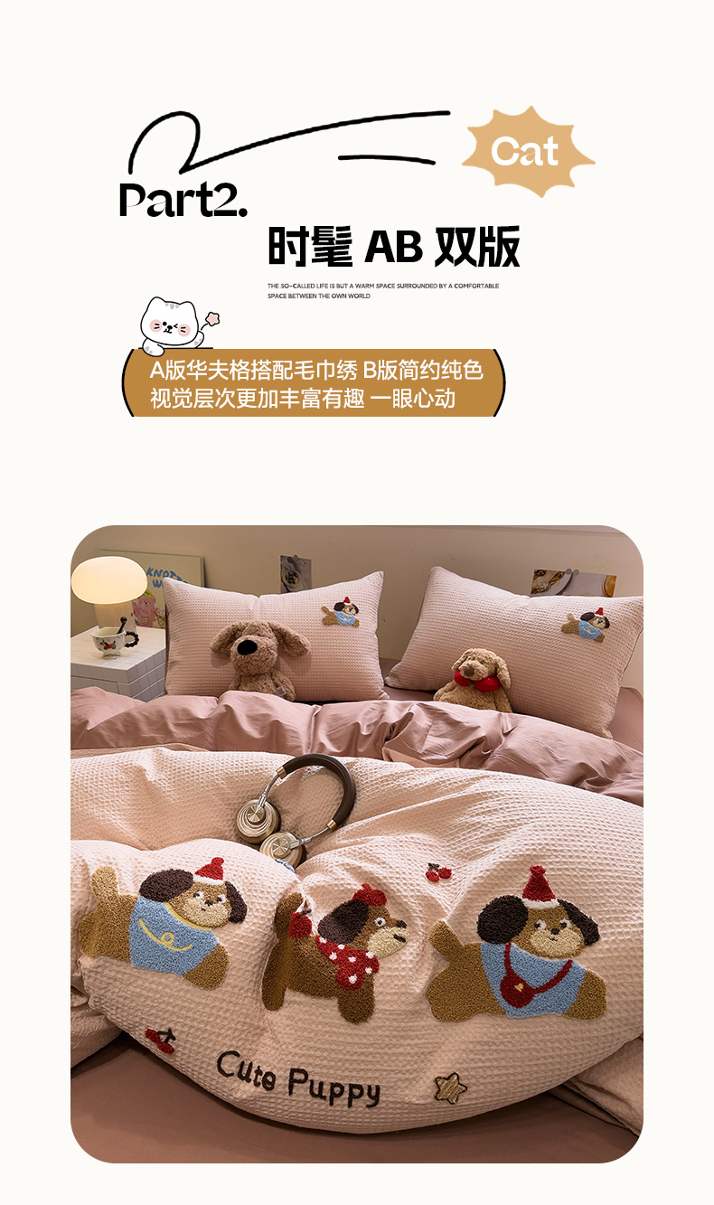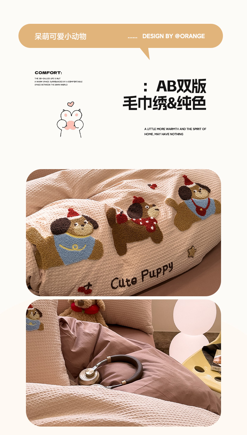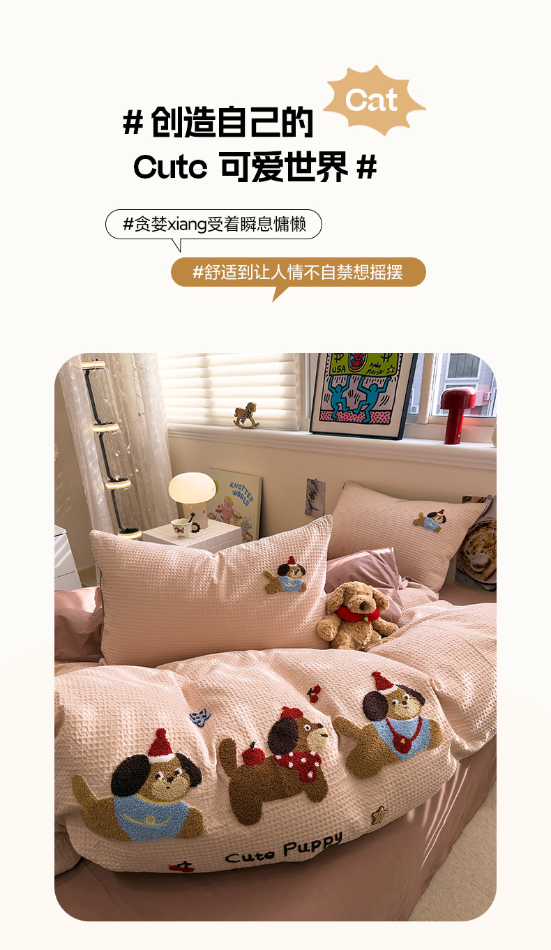 当前位置: 91家纺网 > 商品网购 > 床品套件 > 四件套 > 全棉普通四件套 > 雅居纺家纺 2026新款全棉华夫格毛巾绣四件套 米驼腊肠狗