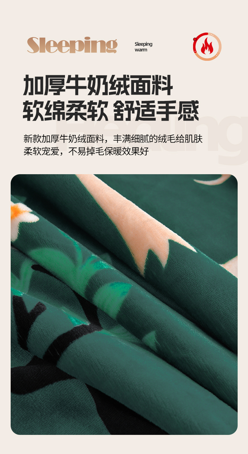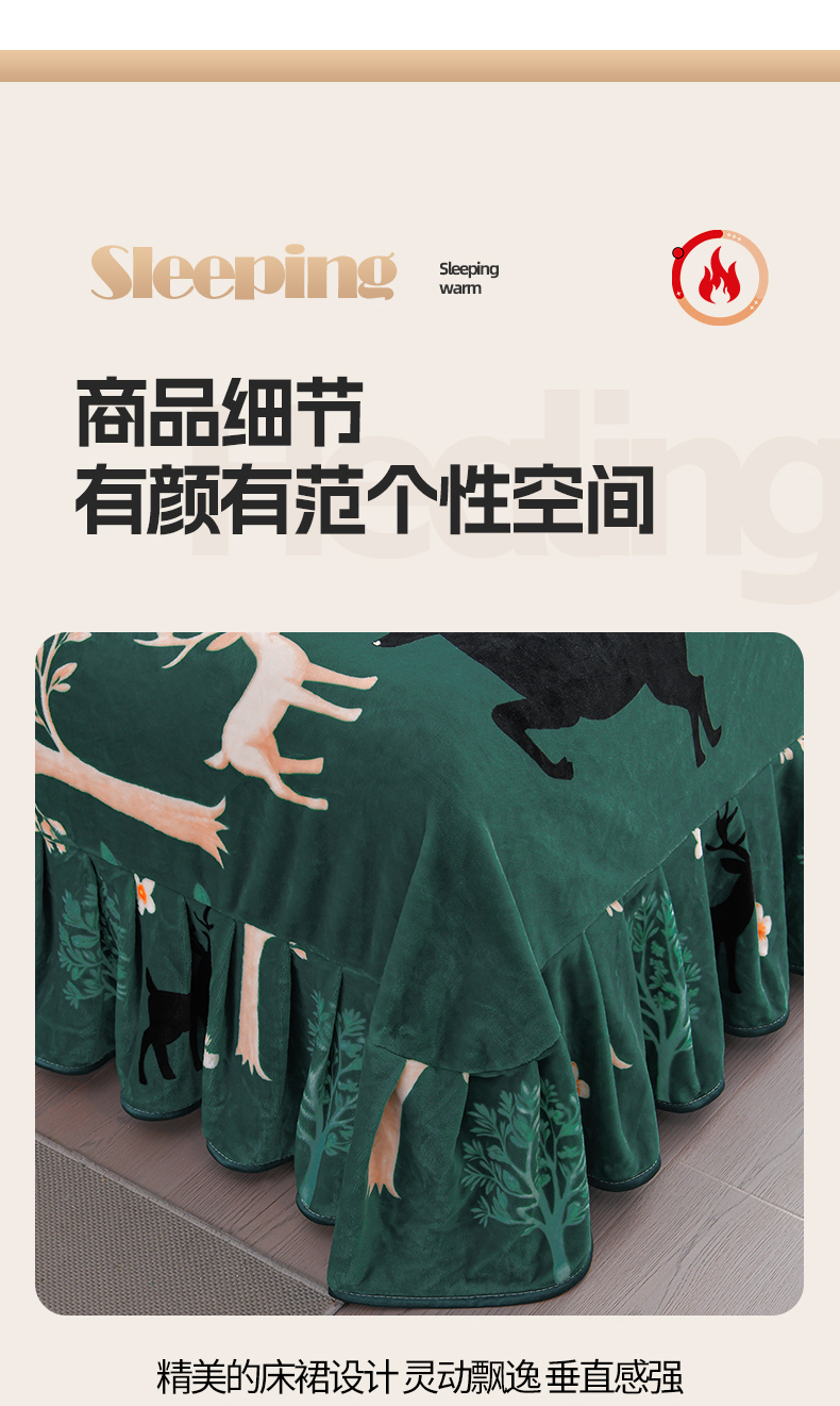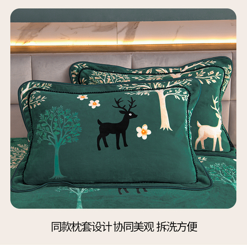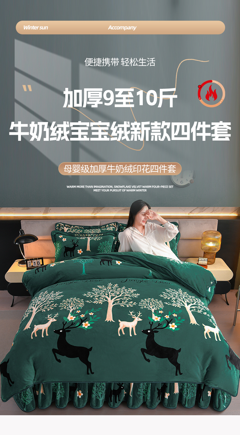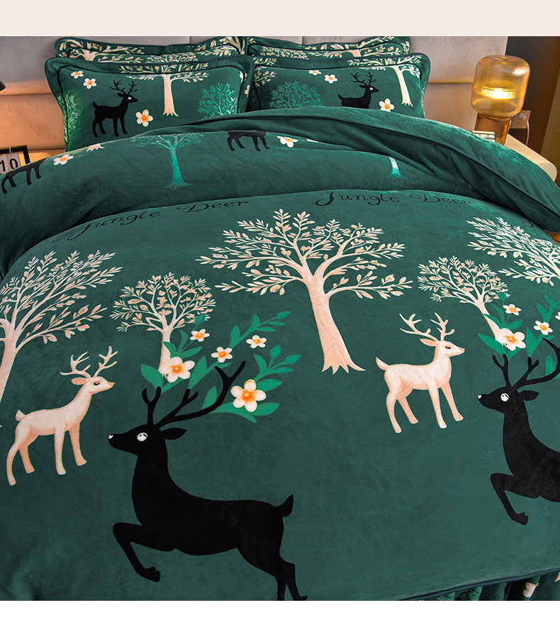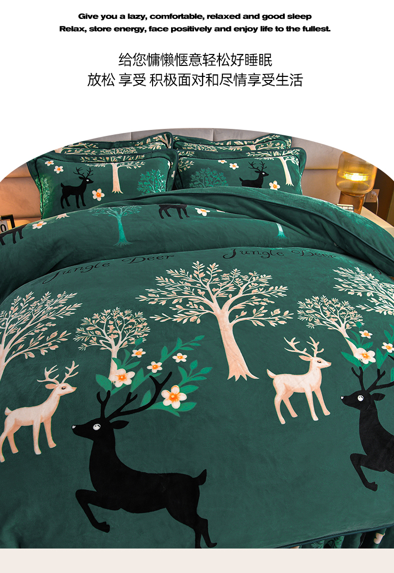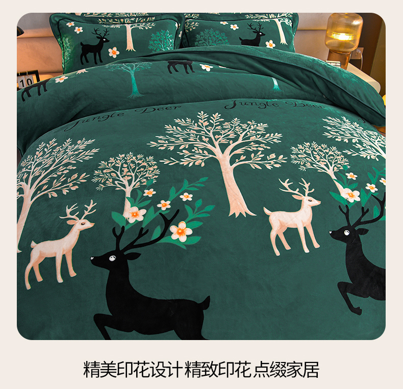 商品名称:董成龙家纺 20256新款高克重9-10斤加厚印花超柔牛奶绒爆款法莱绒金貂绒床裙四件套控价 林间鹿语