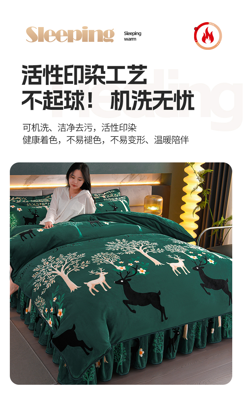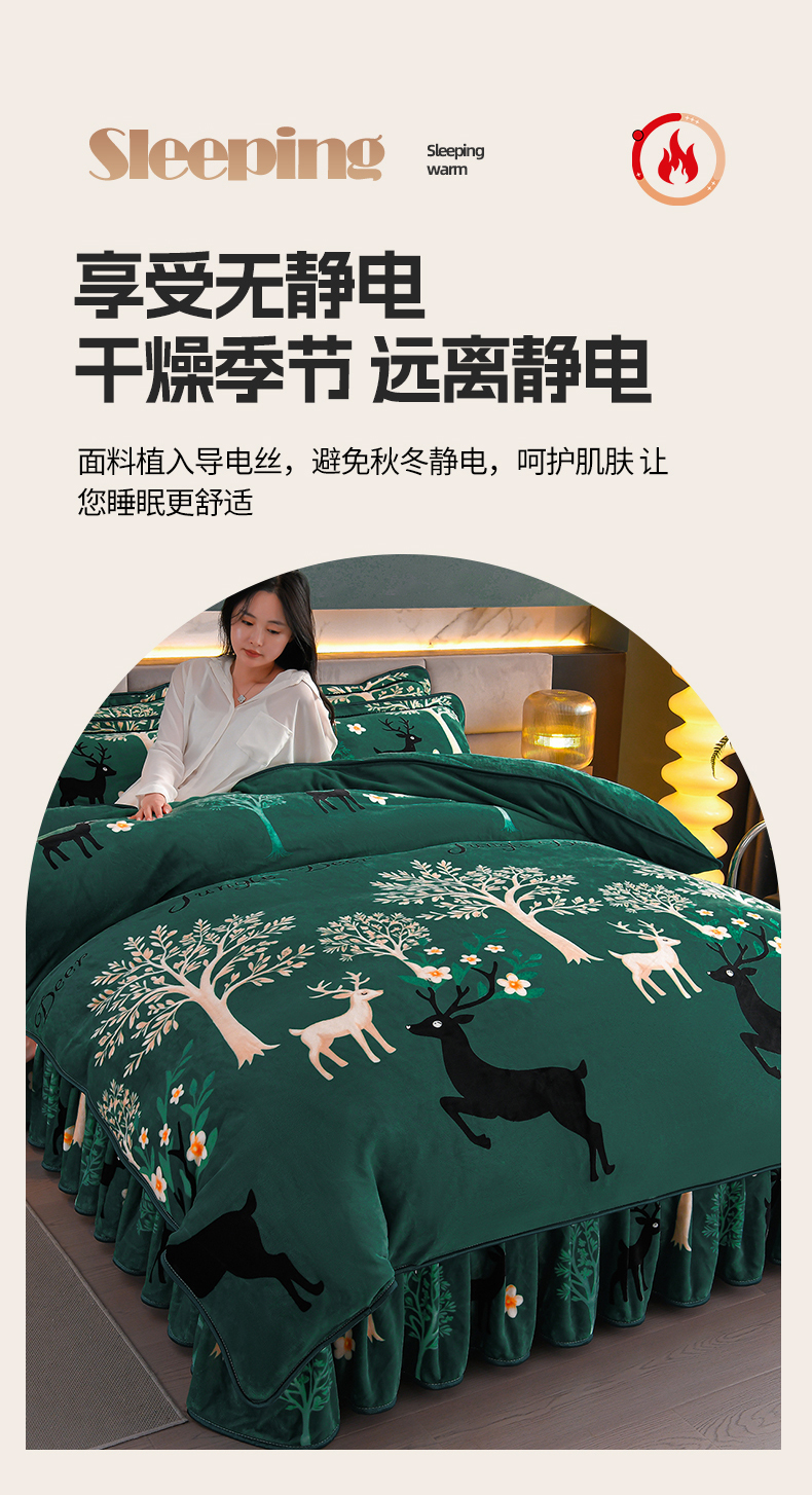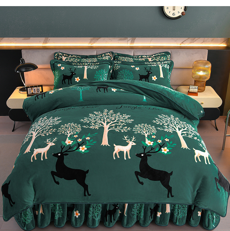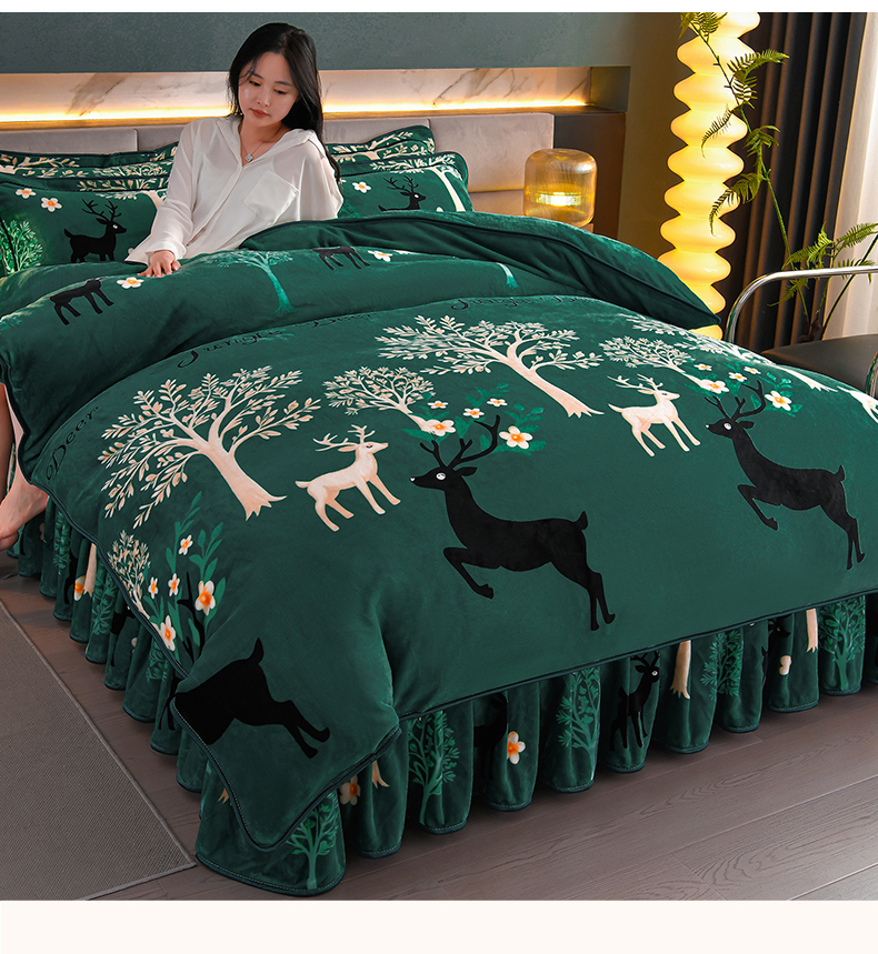 董成龙家纺 20256新款高克重9-10斤加厚印花超柔牛奶绒爆款法莱绒金貂绒床裙四件套控价 林间鹿语