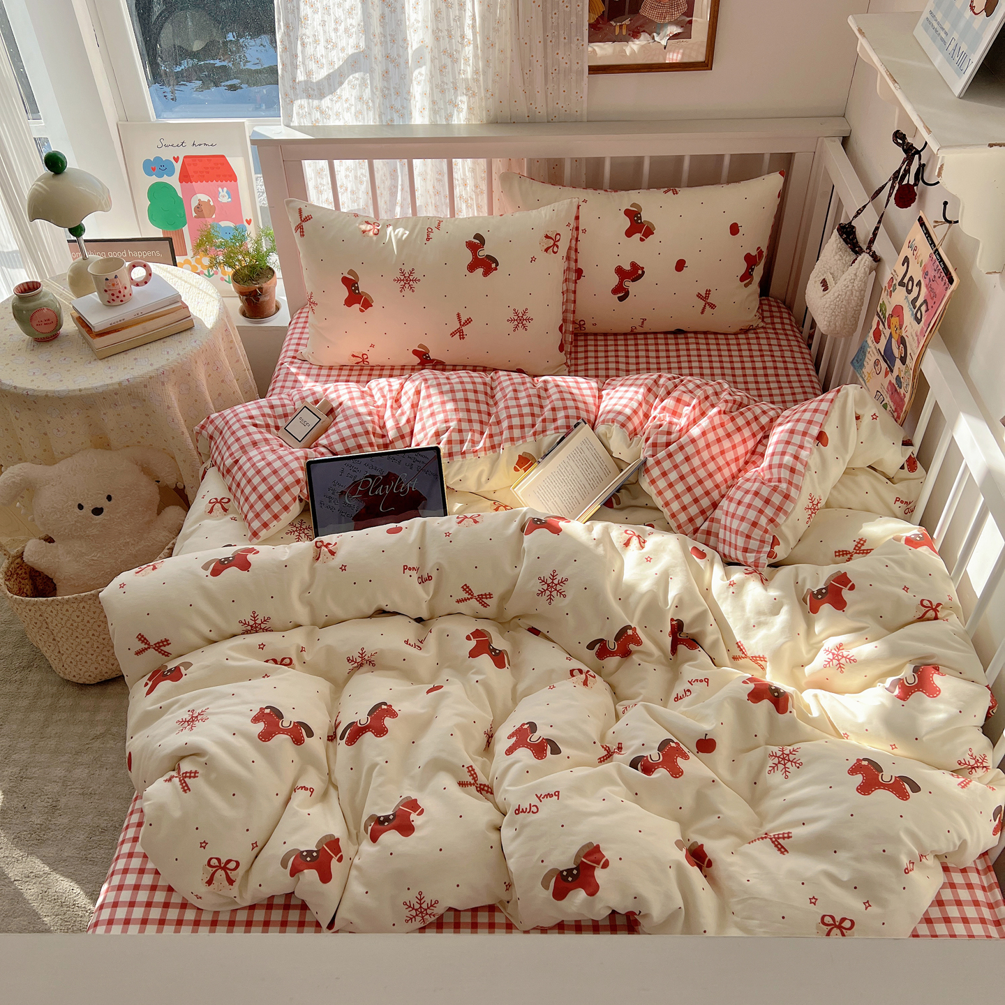 (总)桃喜 2026春夏新品全棉卡通学生三件套四件套,费尔岛姜饼人,费尔岛小红马,费尔岛小兔,海洋乐园,黑白星星熊,红色小马,蓝格小星星,碎花小兔,小星星,雪人小猫