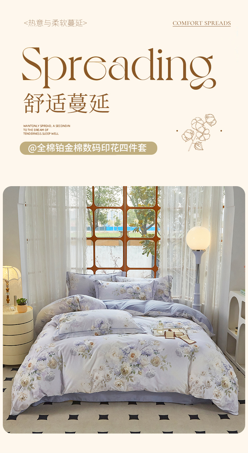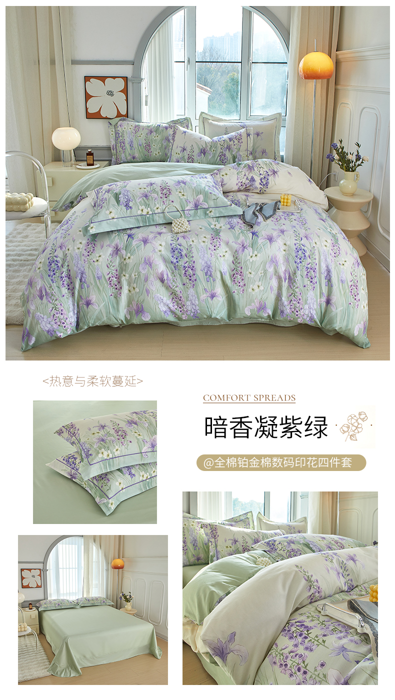 (总)启航家居 2025新款全棉铂金棉数码印花四件套,风香花倦,花的嫁纱,洛香忆梦绿,暮云春树灰,翩若惊鸿粉,普罗旺斯紫,新塞纳舞曲红,新塞纳舞曲紫