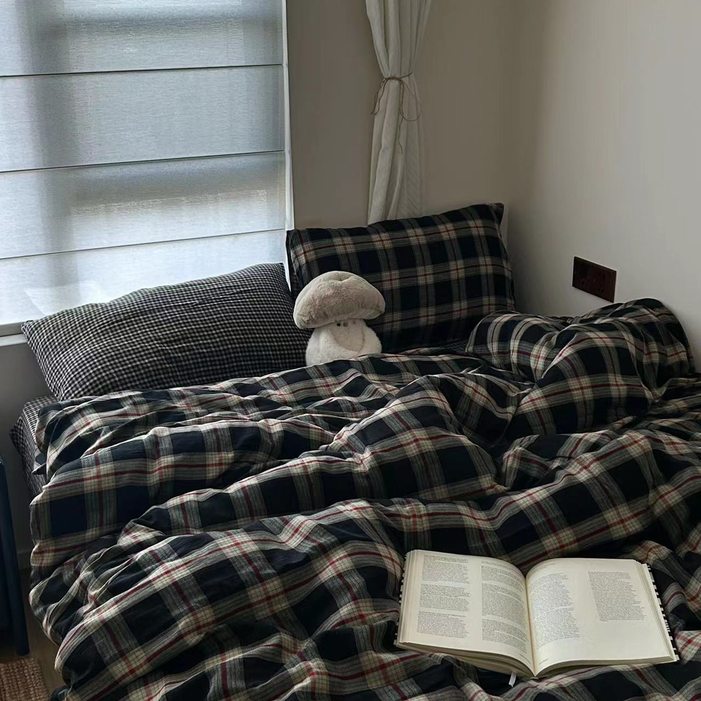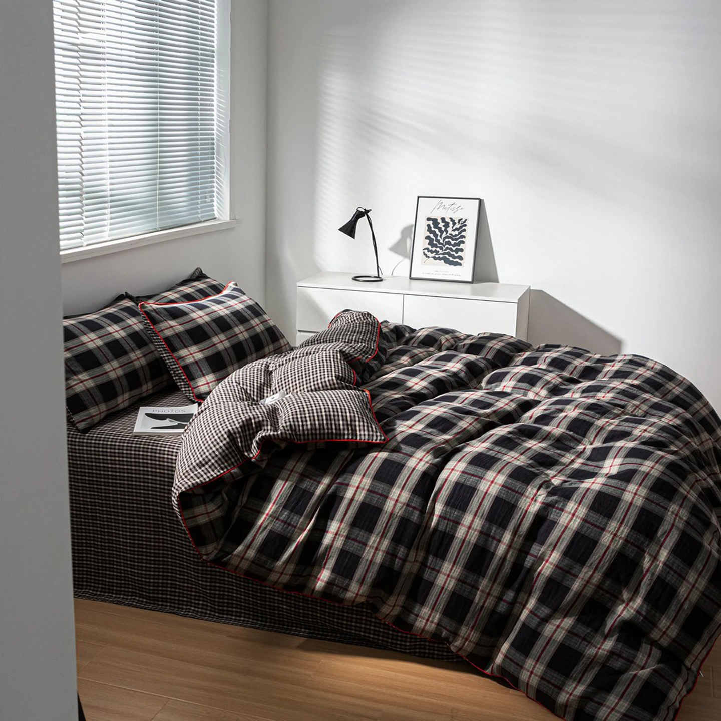 双层纱家居 2025新款格缦全棉纯棉色织双层纱系列四件套 墨染