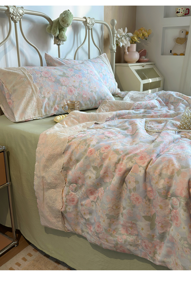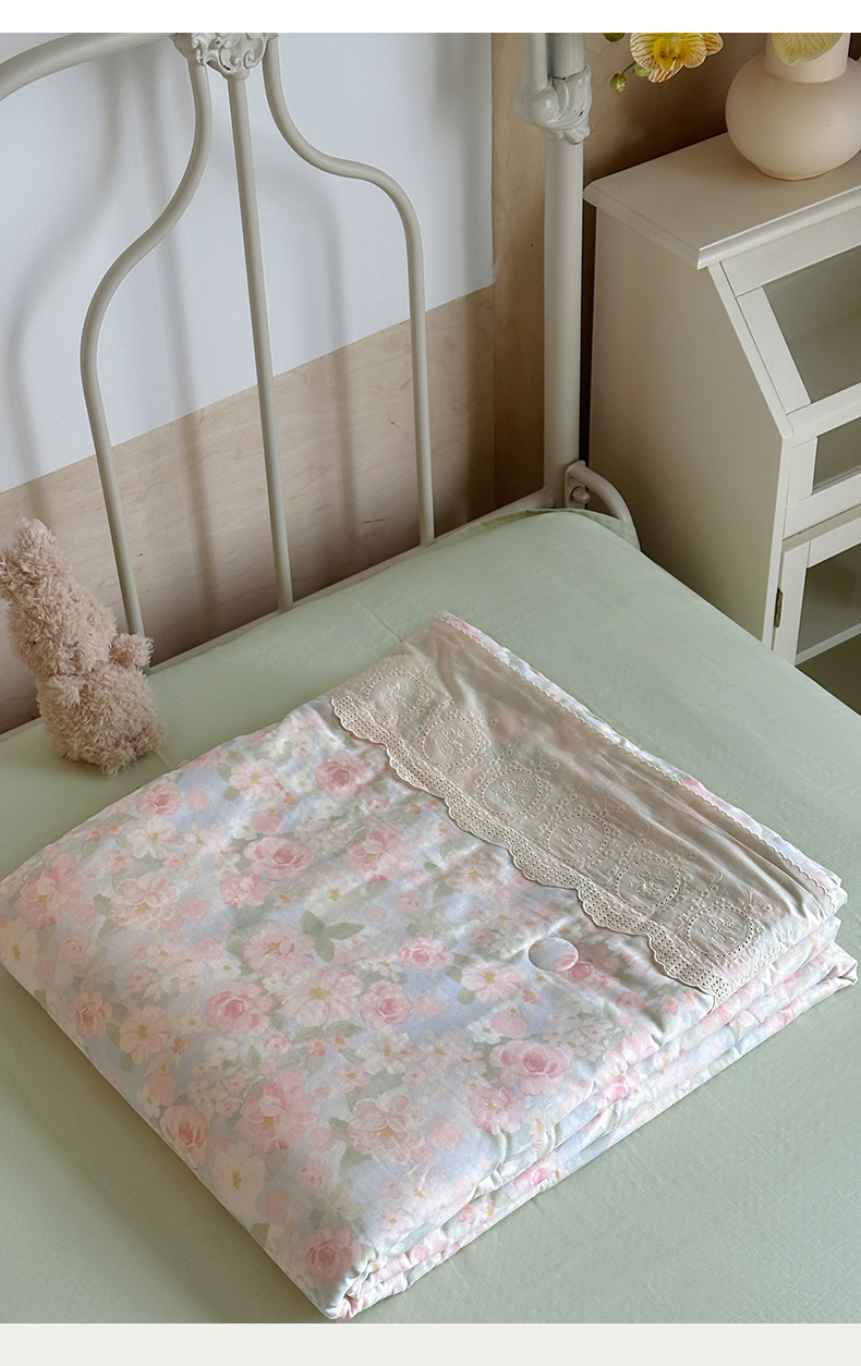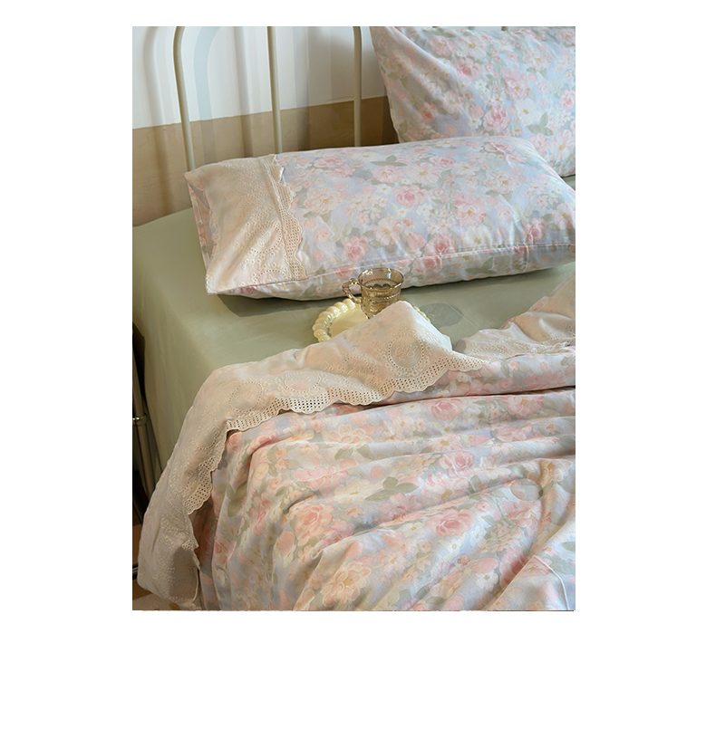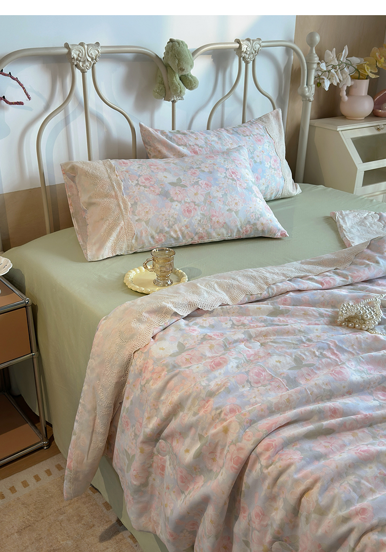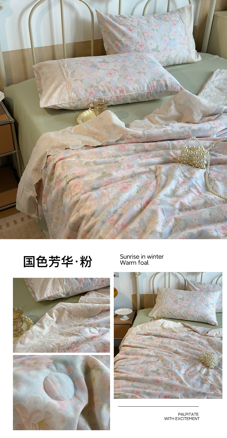 当前位置: 91家纺网 > 商品网购 > 床品套件 > 四件套 > 夏被四件套 > 绫韵家纺 2026夏季新品A类全棉双层纱法式大花边夏被四件套 国色芳华·粉